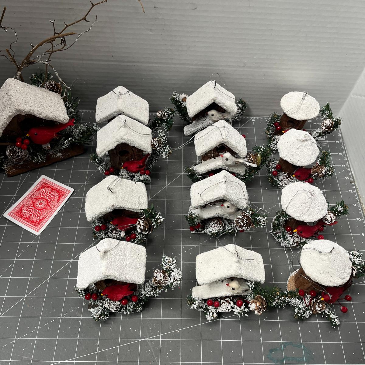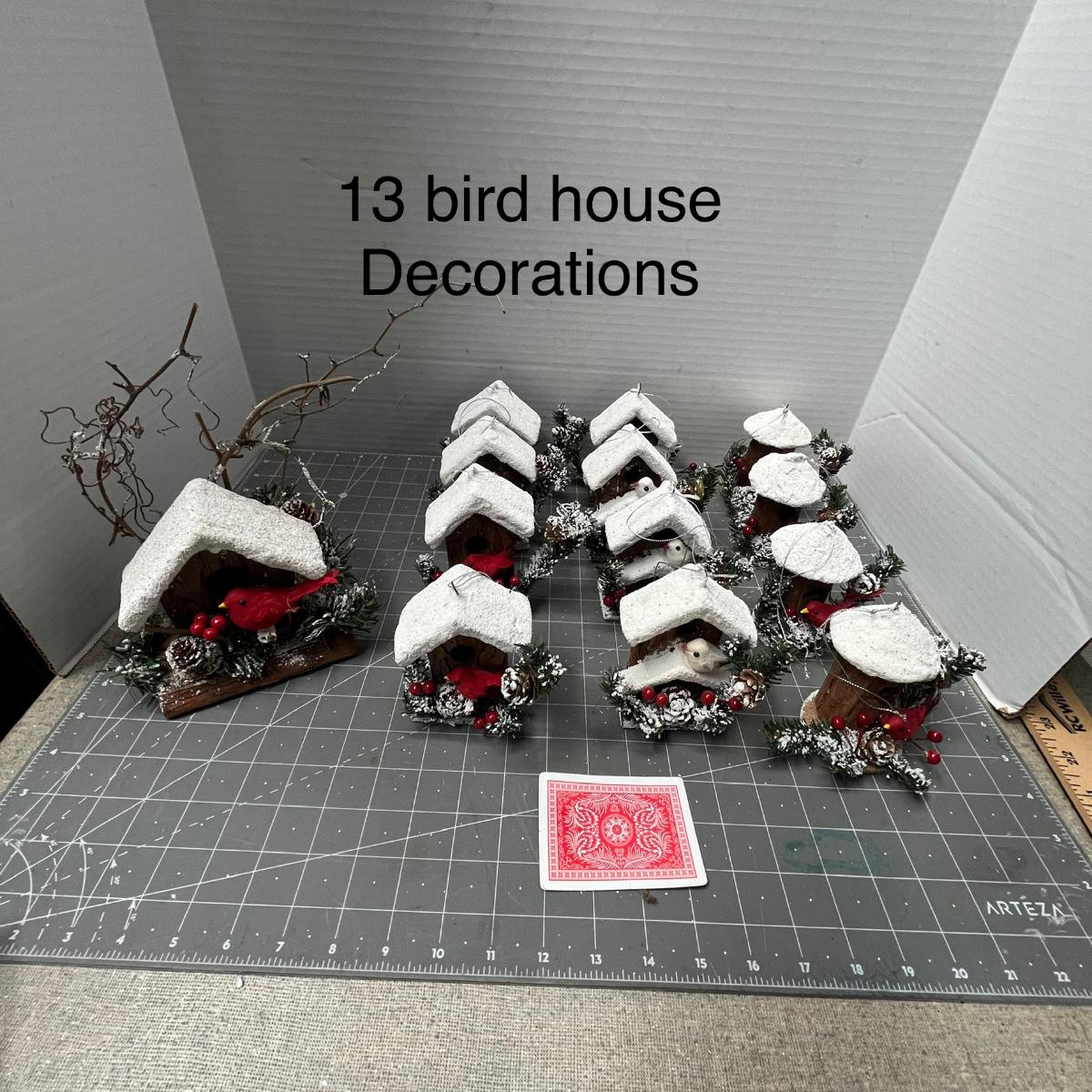 13 pc—snow-roof birdhouses with red birds and greenery.