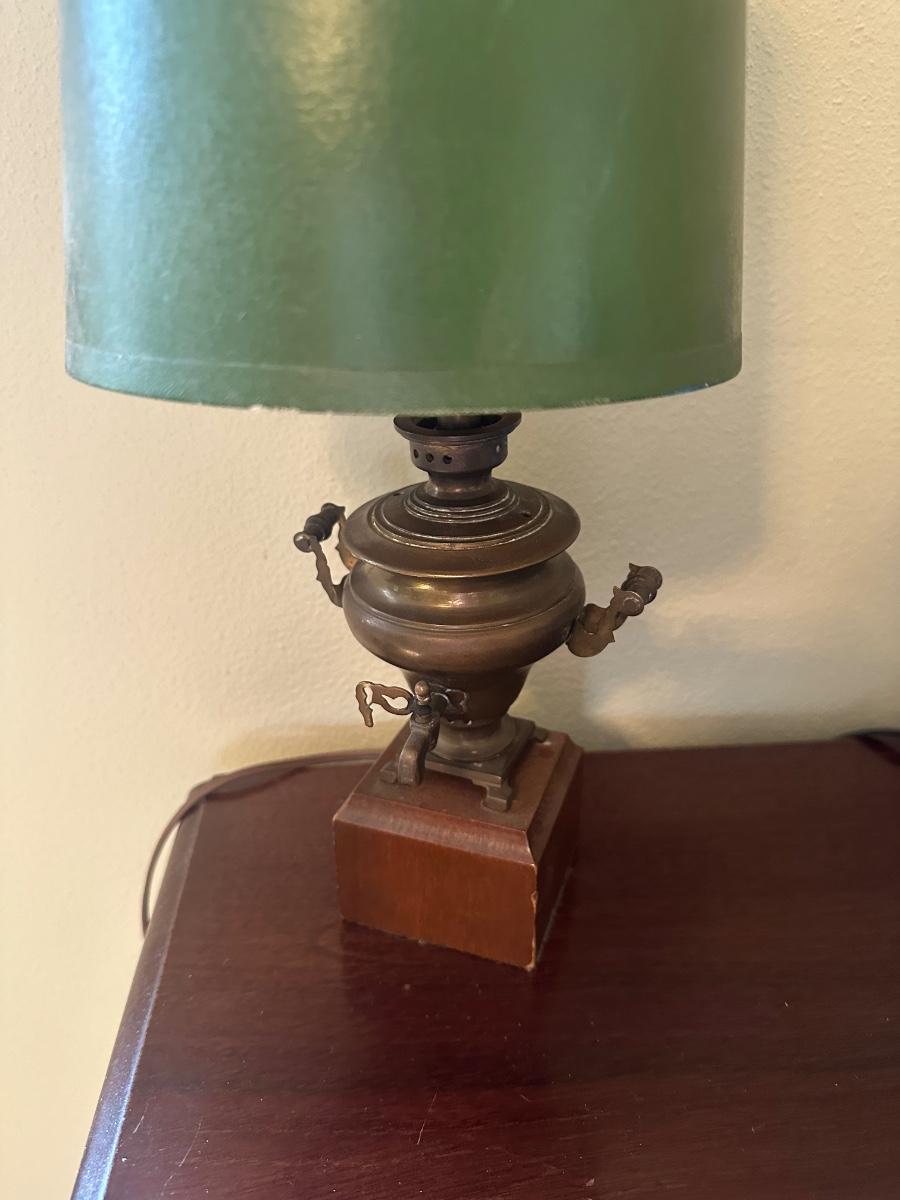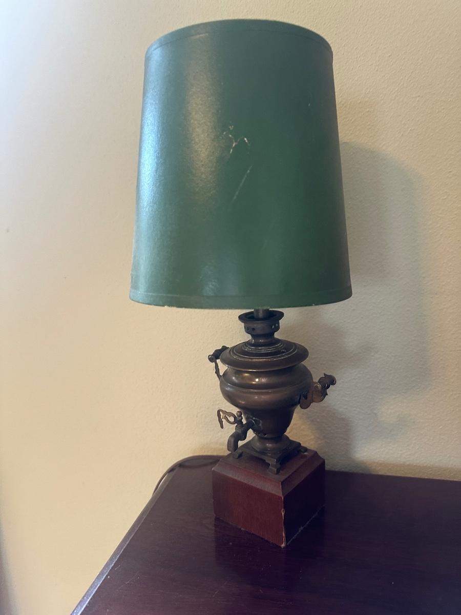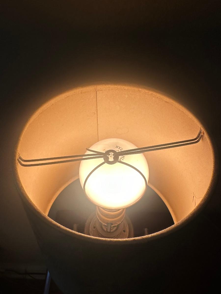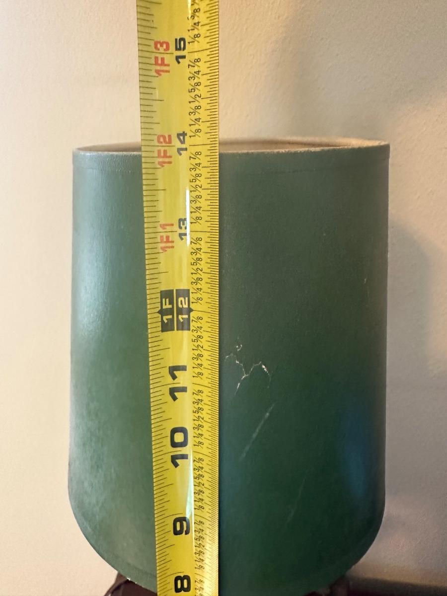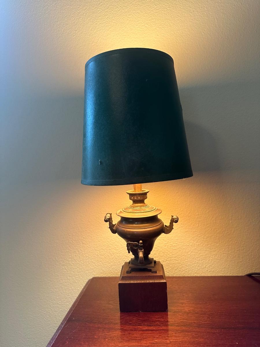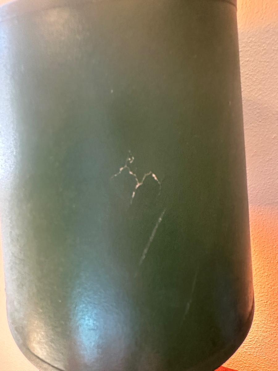 The lamp shade has a small puncture, pictured. The wood base is also scraped on edge, pictured.