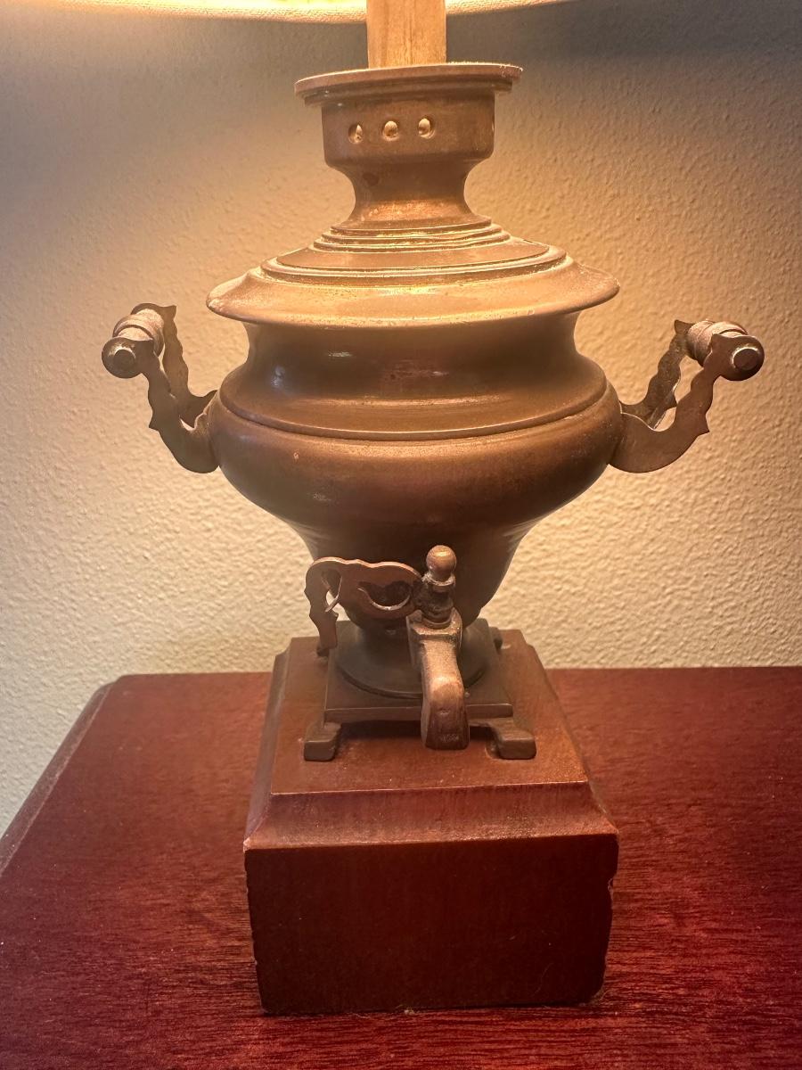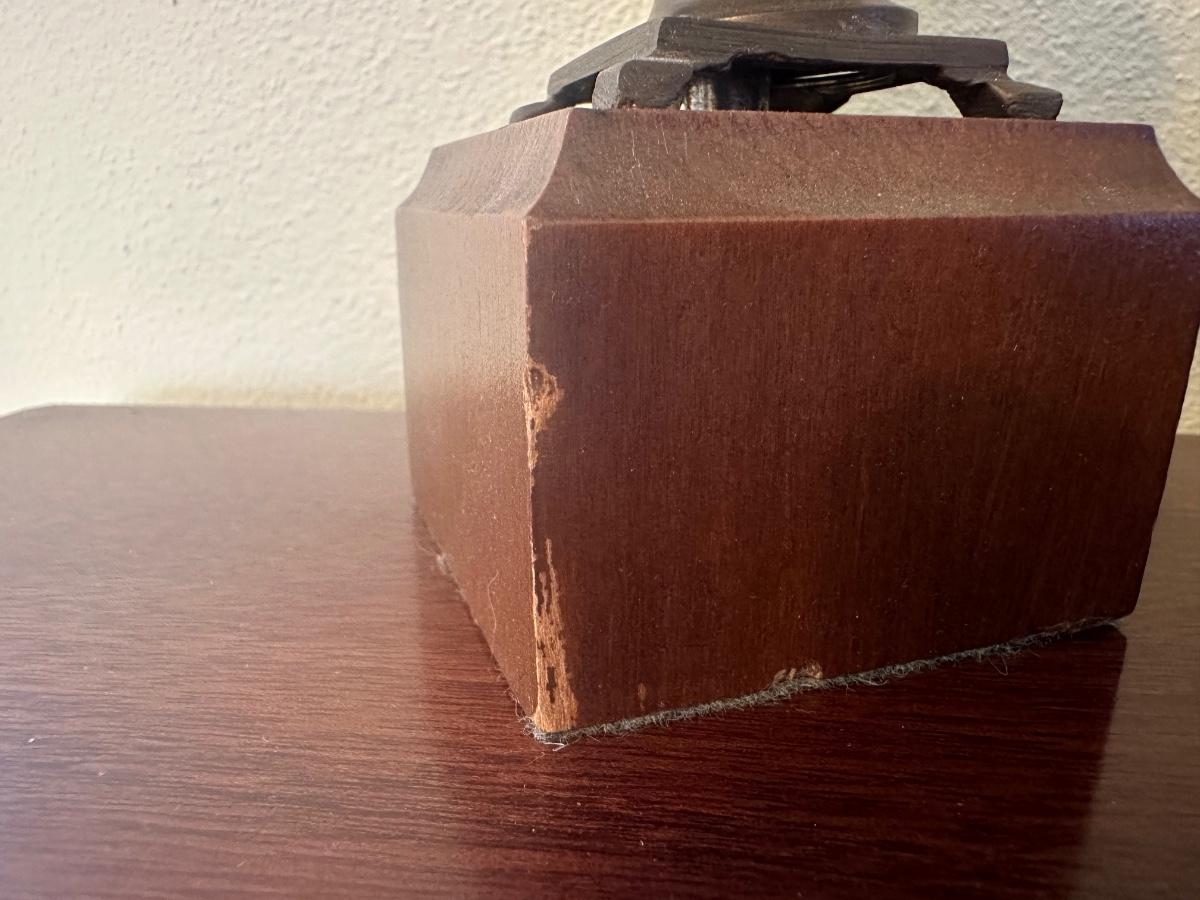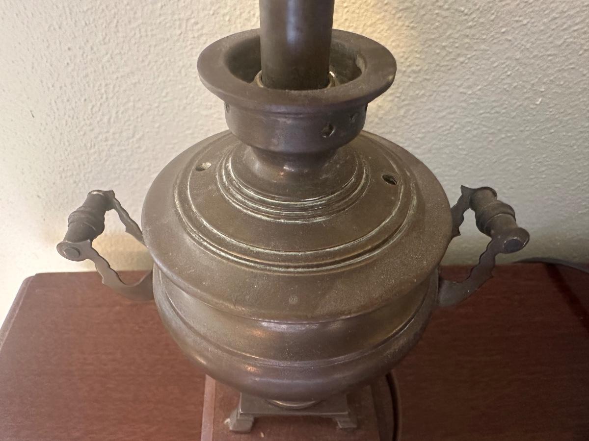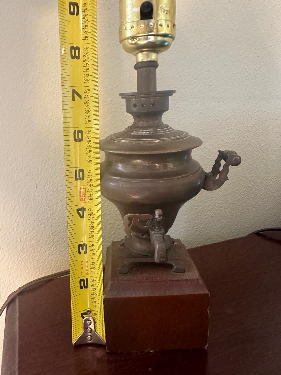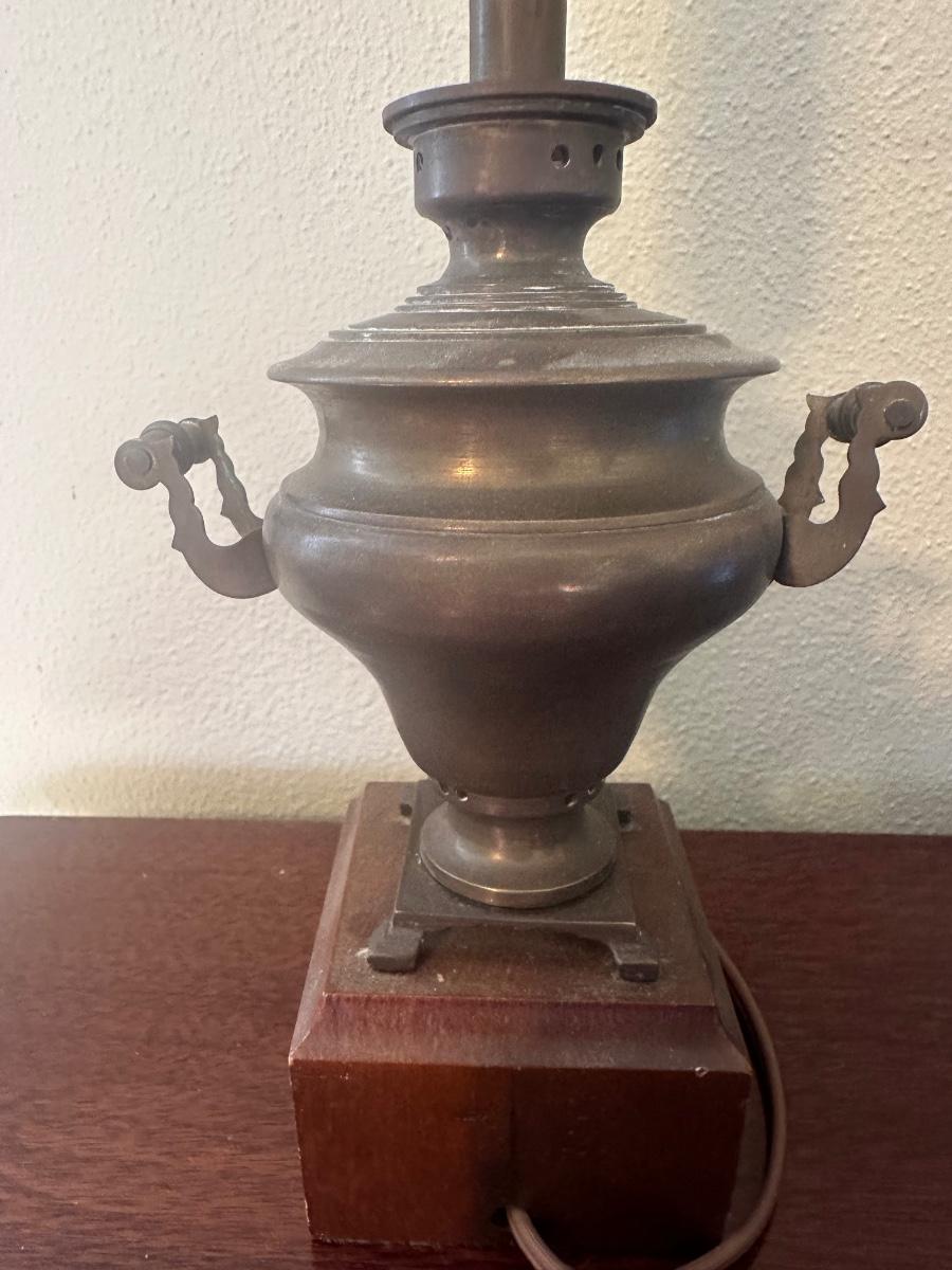 The lamp shade has a small puncture, pictured. The wood base is also scraped on edge, pictured.