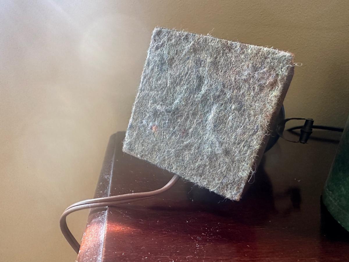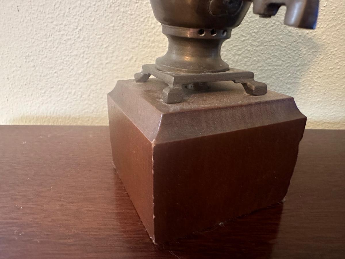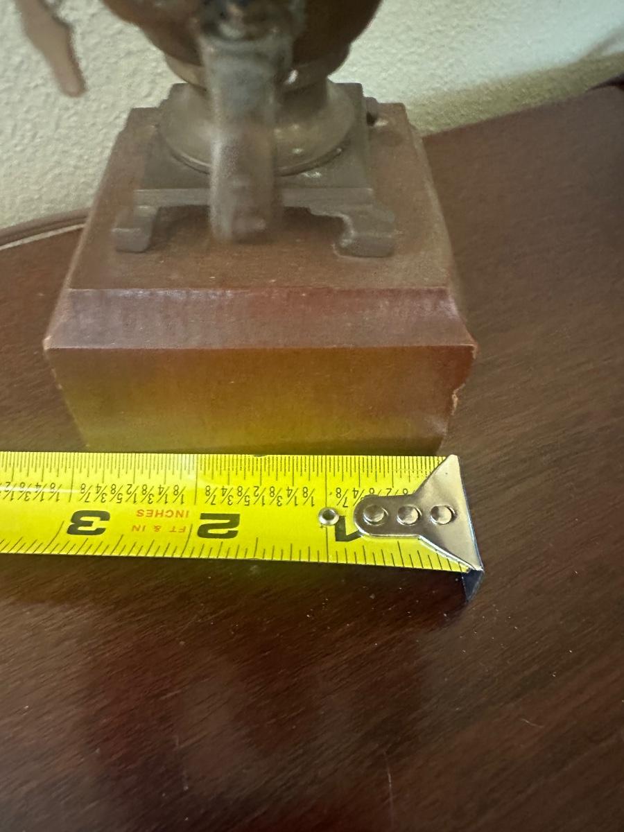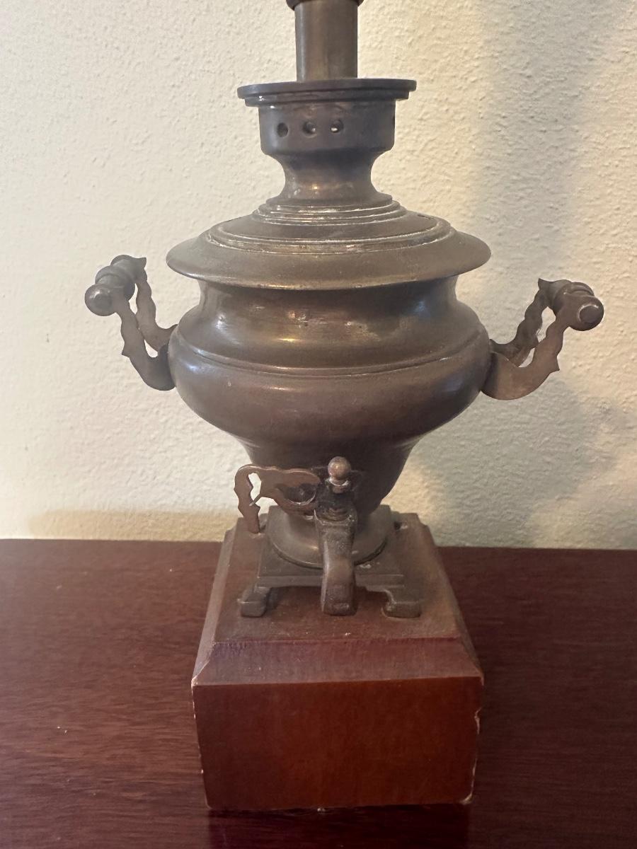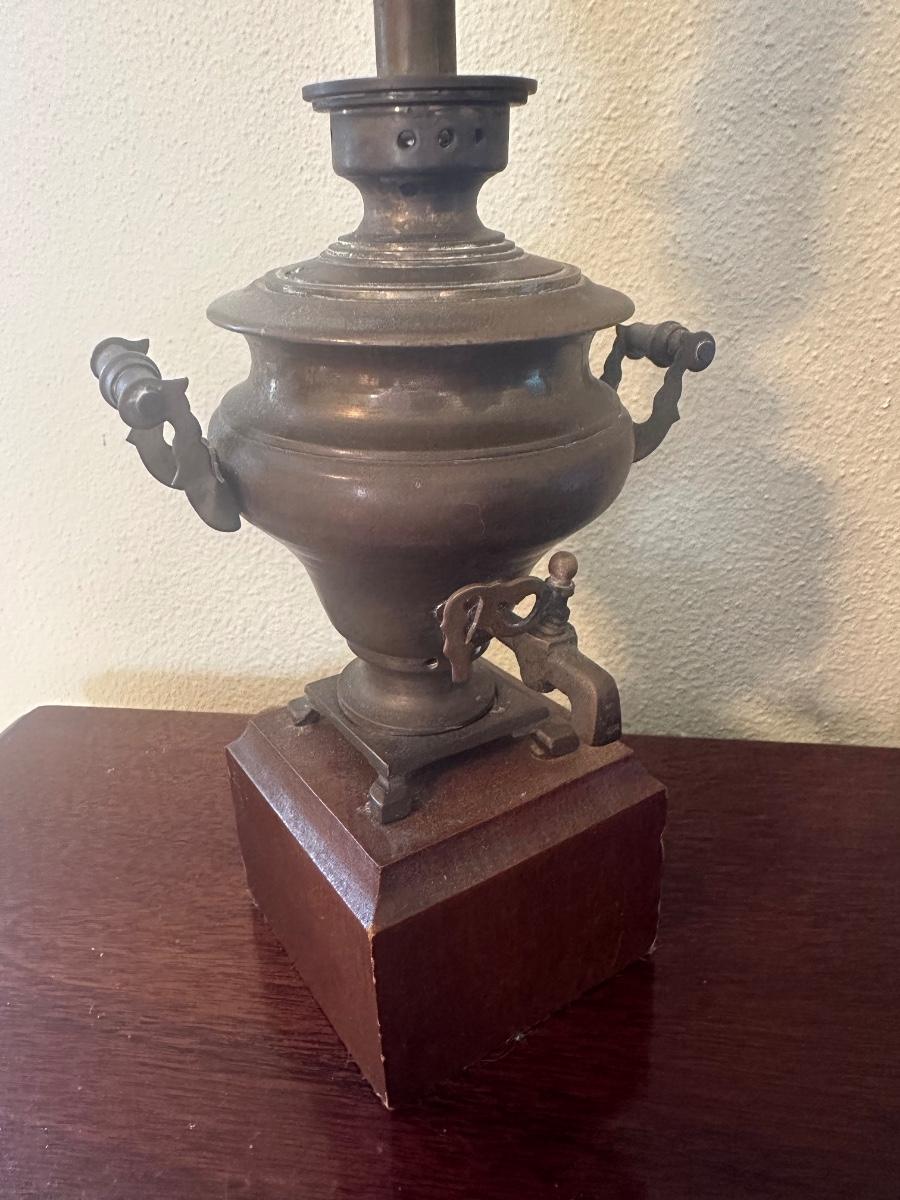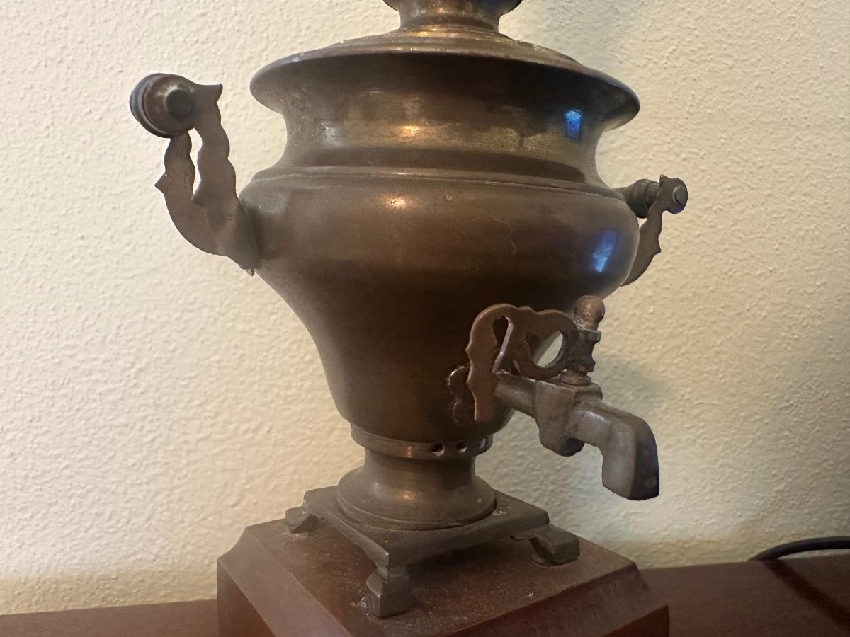 The lamp shade has a small puncture, pictured. The wood base is also scraped on edge, pictured.
