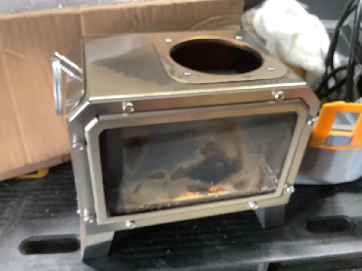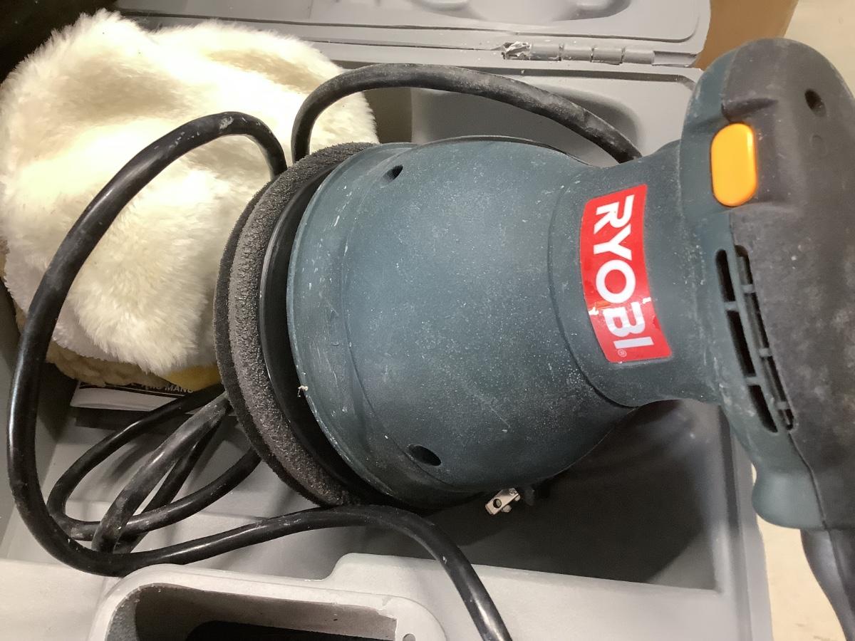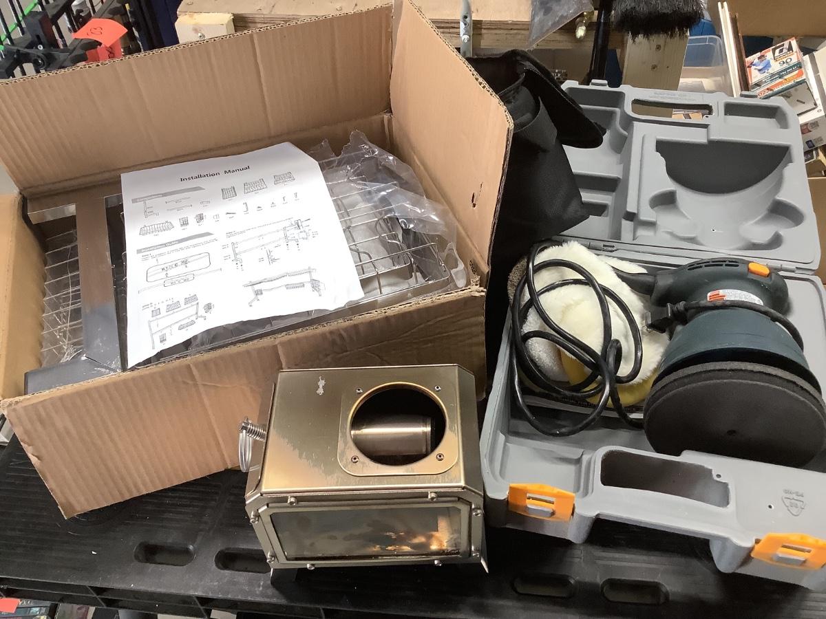 Mini camping stove/heater with case, Ryobi 6" buffer, above sink shelf