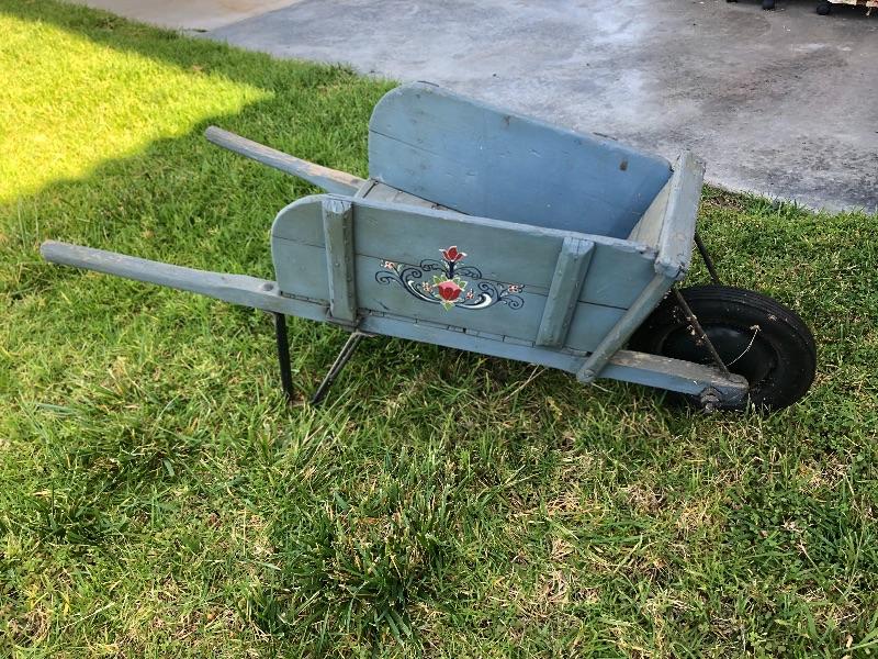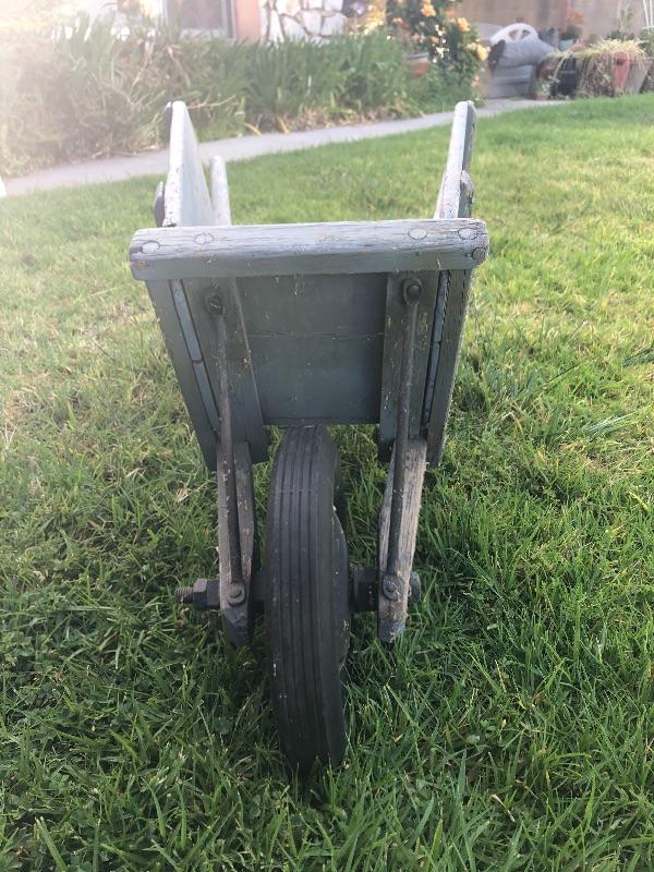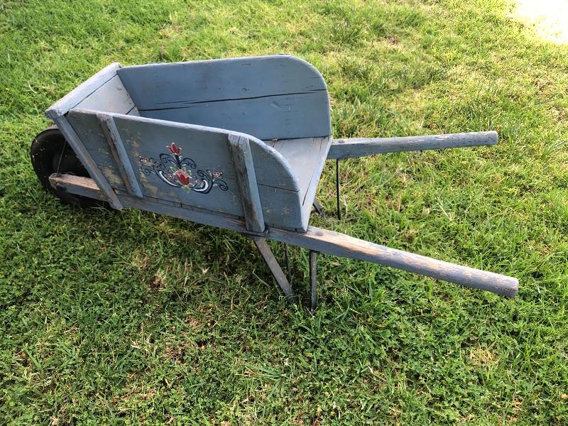 Cute painted wood wheelbarrow. Small size for yard decoration. #030-4003