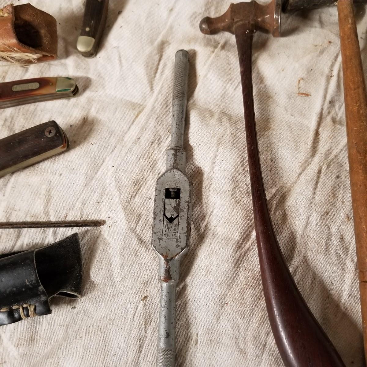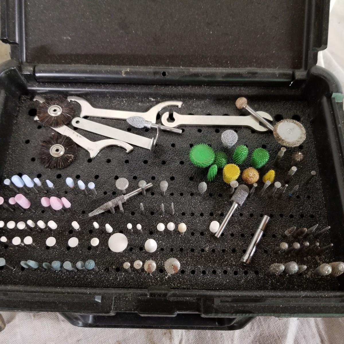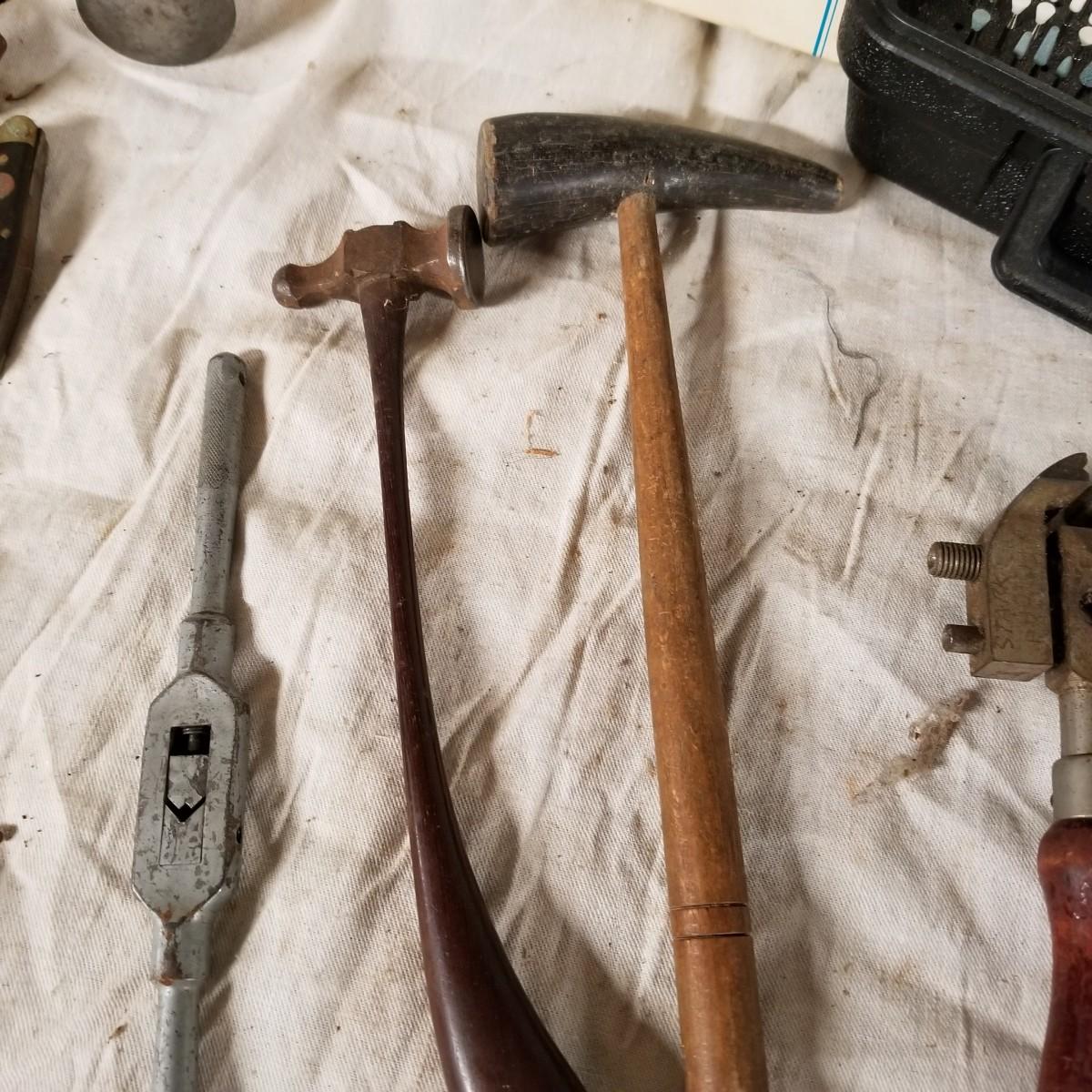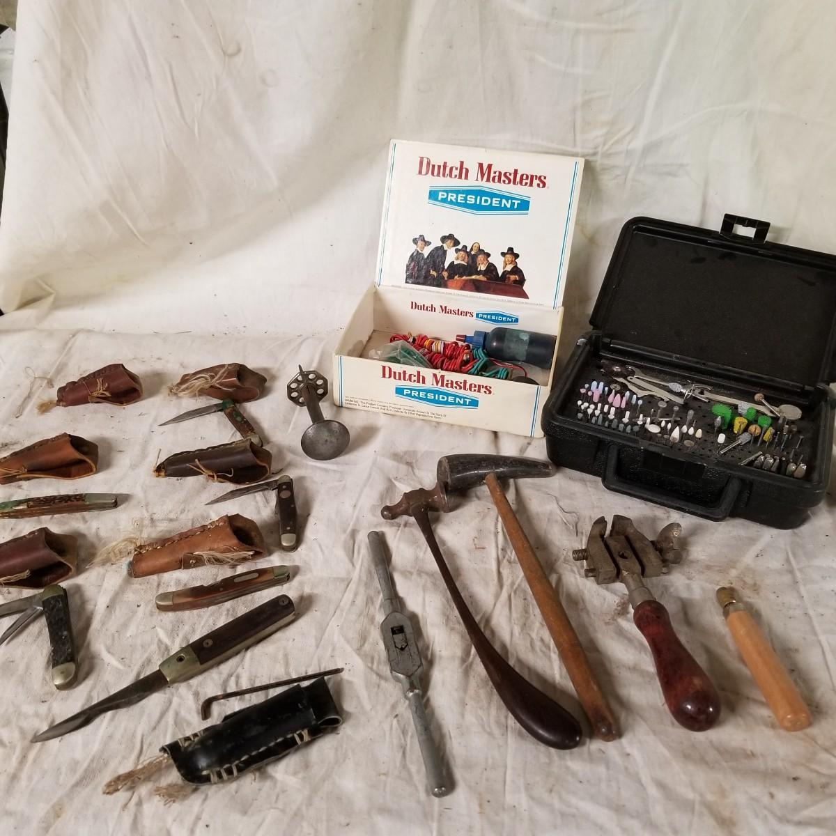 Box of assorted mini tools for Dremel or other.   Stones, cones, burrs and wrenches.   Small hand vise, also pin vise.  Two planishing hammers,  holder for tapping.  Six assorted pocket knives with sheaths.   One Old Timer, one Boker.  Knives in need of tlc, have been in sheaths awhile.  See photos.  Also what appears to be a homemade tattoo machine.  Shipping available.
