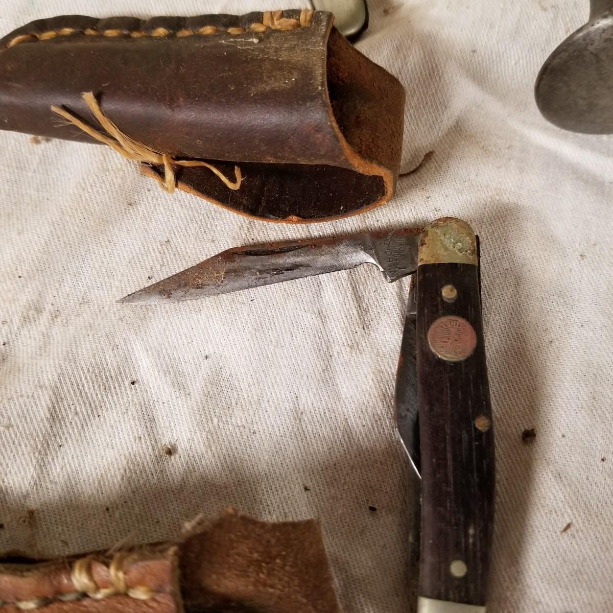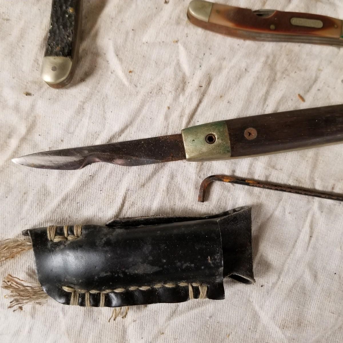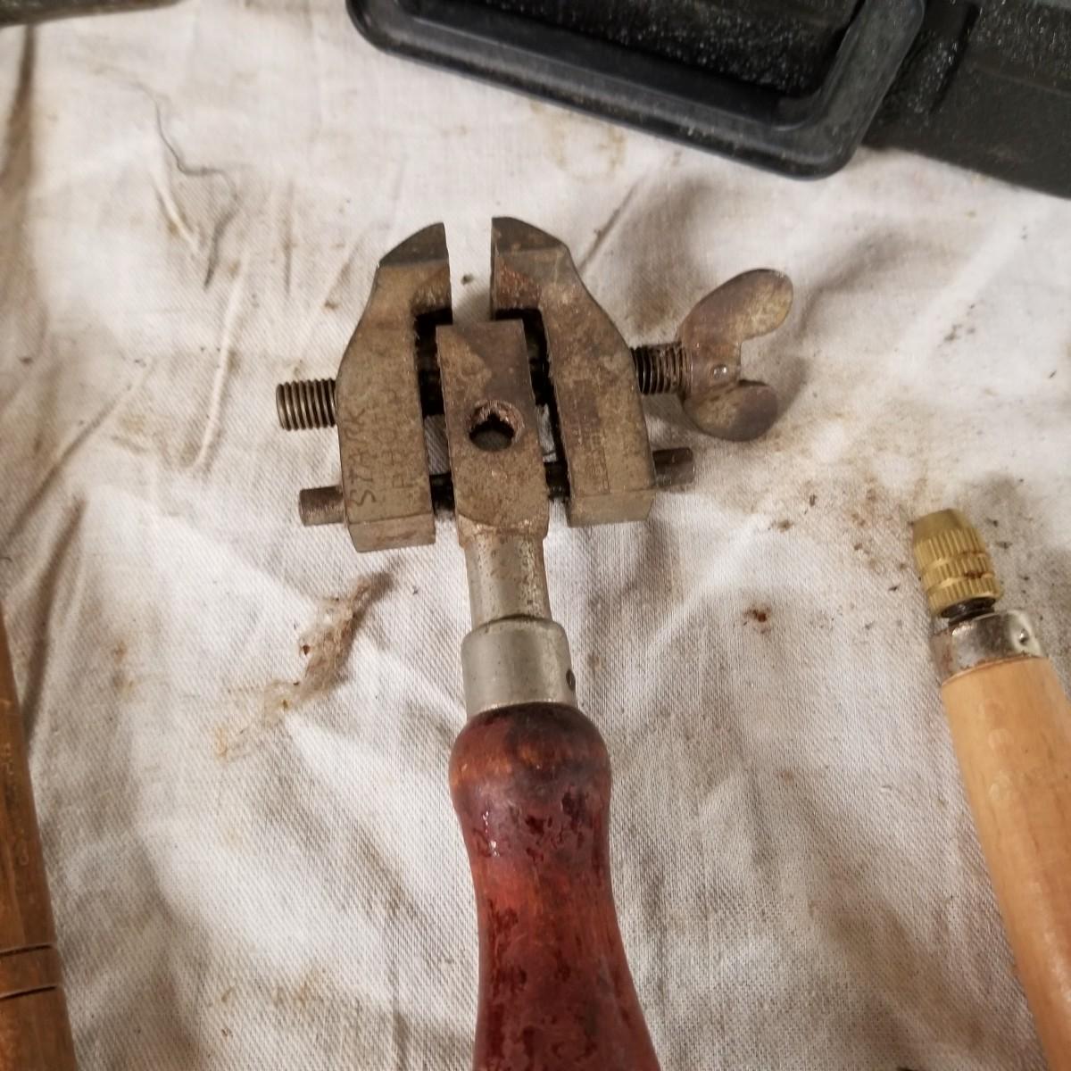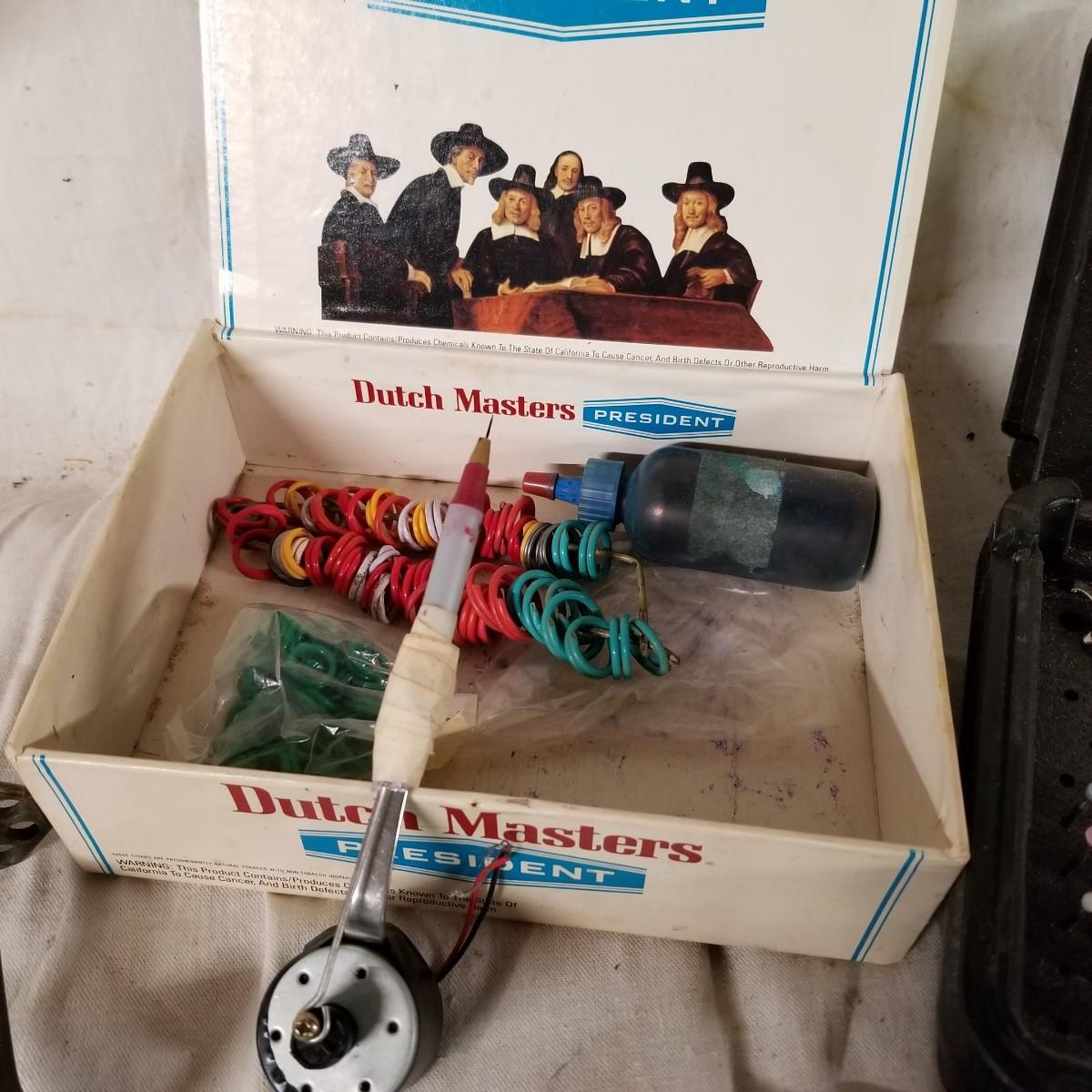 Box of assorted mini tools for Dremel or other.   Stones, cones, burrs and wrenches.   Small hand vise, also pin vise.  Two planishing hammers,  holder for tapping.  Six assorted pocket knives with sheaths.   One Old Timer, one Boker.  Knives in need of tlc, have been in sheaths awhile.  See photos.  Also what appears to be a homemade tattoo machine.  Shipping available.