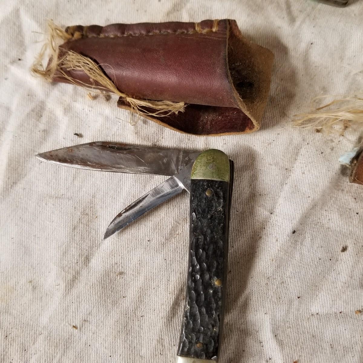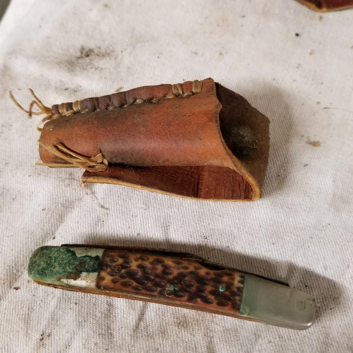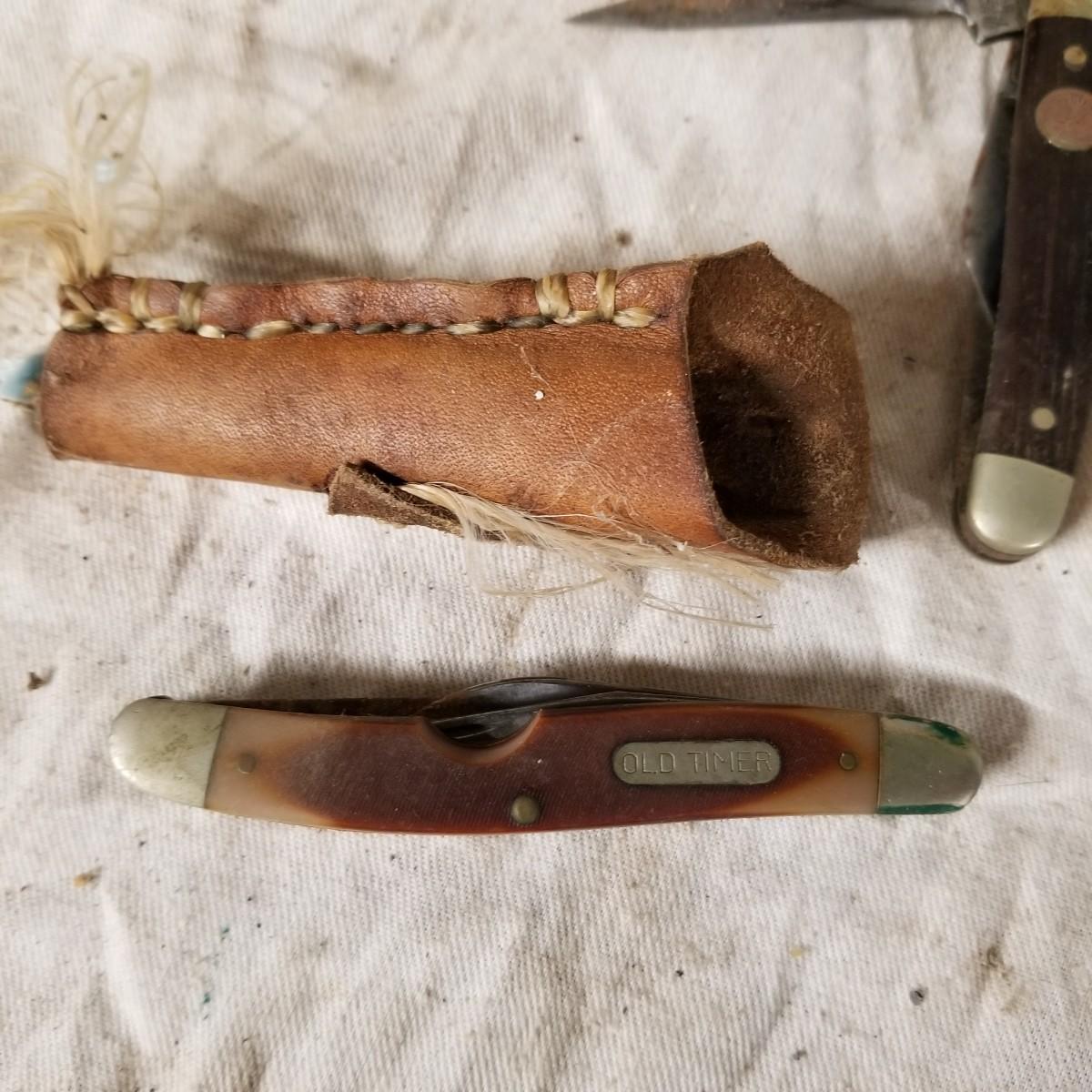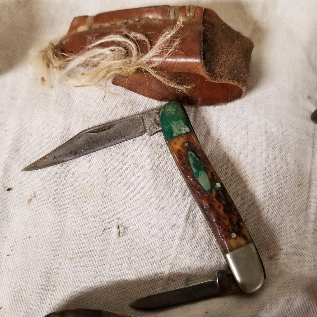 Box of assorted mini tools for Dremel or other.   Stones, cones, burrs and wrenches.   Small hand vise, also pin vise.  Two planishing hammers,  holder for tapping.  Six assorted pocket knives with sheaths.   One Old Timer, one Boker.  Knives in need of tlc, have been in sheaths awhile.  See photos.  Also what appears to be a homemade tattoo machine.  Shipping available.