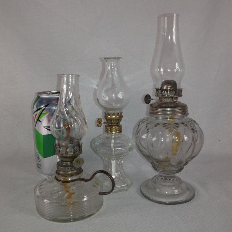 This is a delightful collection of miniature glass, working hurricane lamps. These appear to be very old. Condition is in keeping with their age and use - overall very good. The one finger hole lamp's shade has a very thin crack that does not go all the way through, barely noticed it. The tallest of the lamps is 8-1/2-inches tall x 3-inches in diameter. The center one is 6-1/2-inches tall X 2-inches in diameter and the last one is the finger hole lamp that is 6-inches tall X 3-inches in diameter. Nice collection ready for any mantle or cabinet.