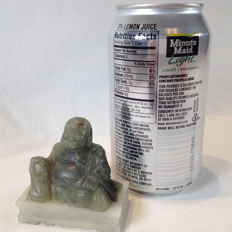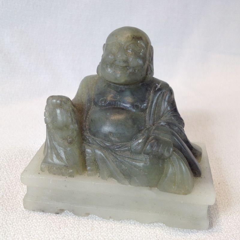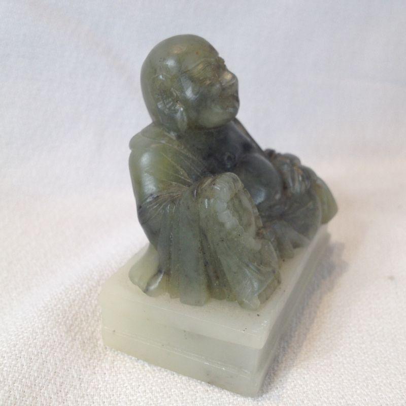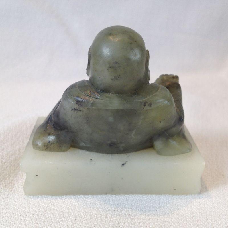 This is a great little Buddha that you can set anywhere to bring you good luck. It is Asian jade and measures 2 1/2-inches long X 2 1/4-inches tall. Very good condition.
