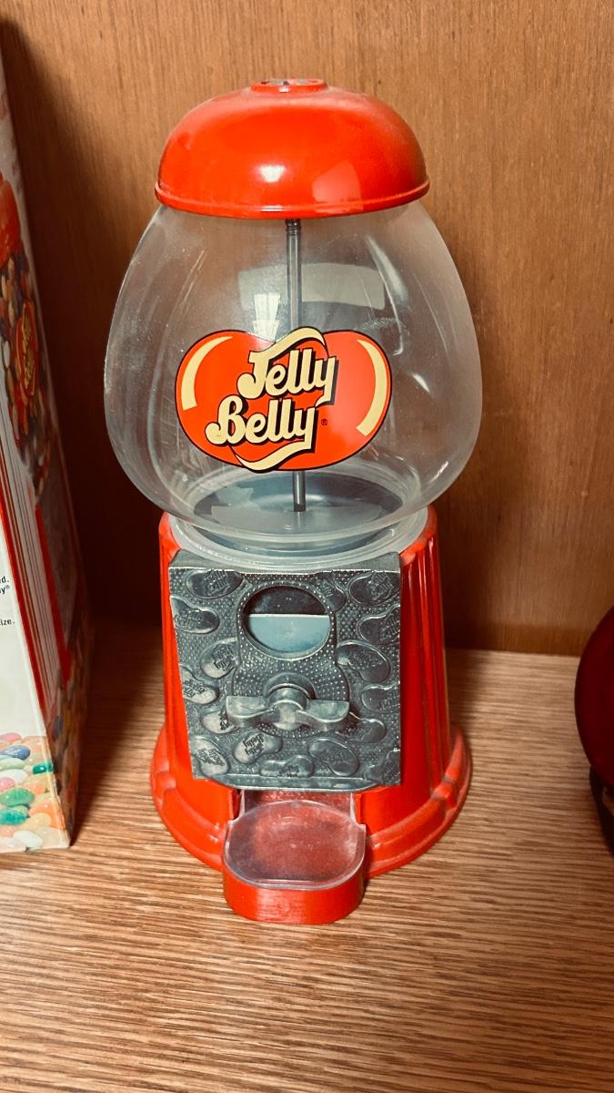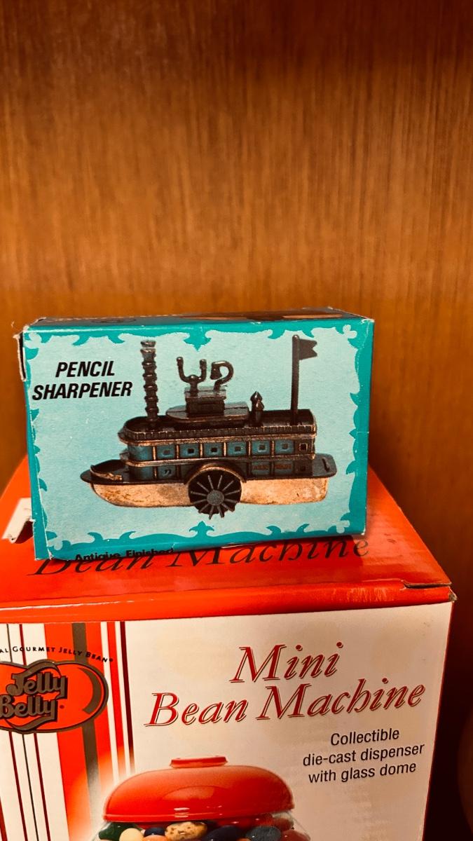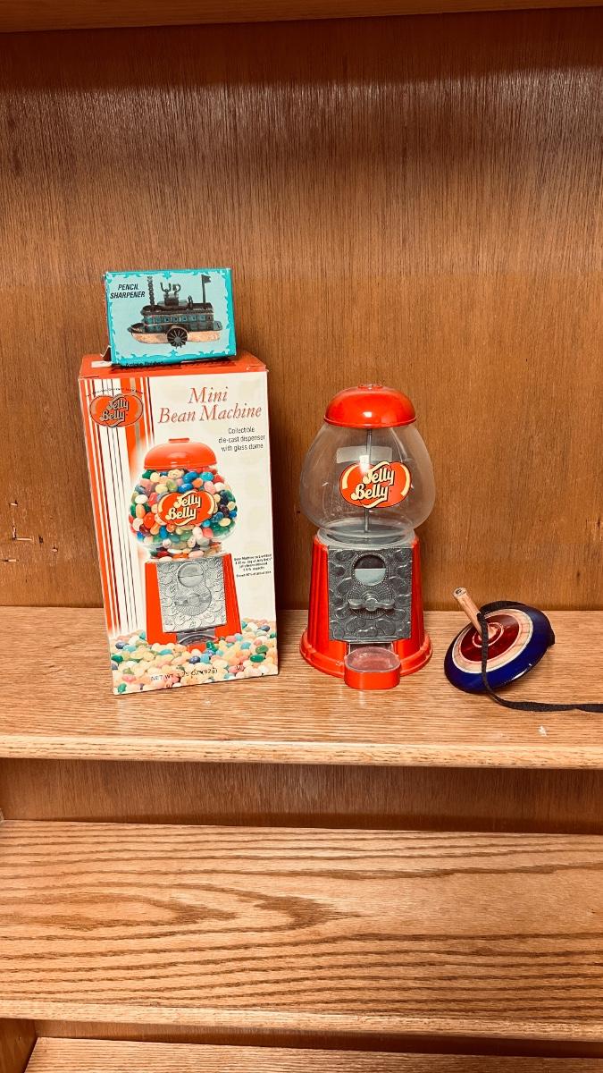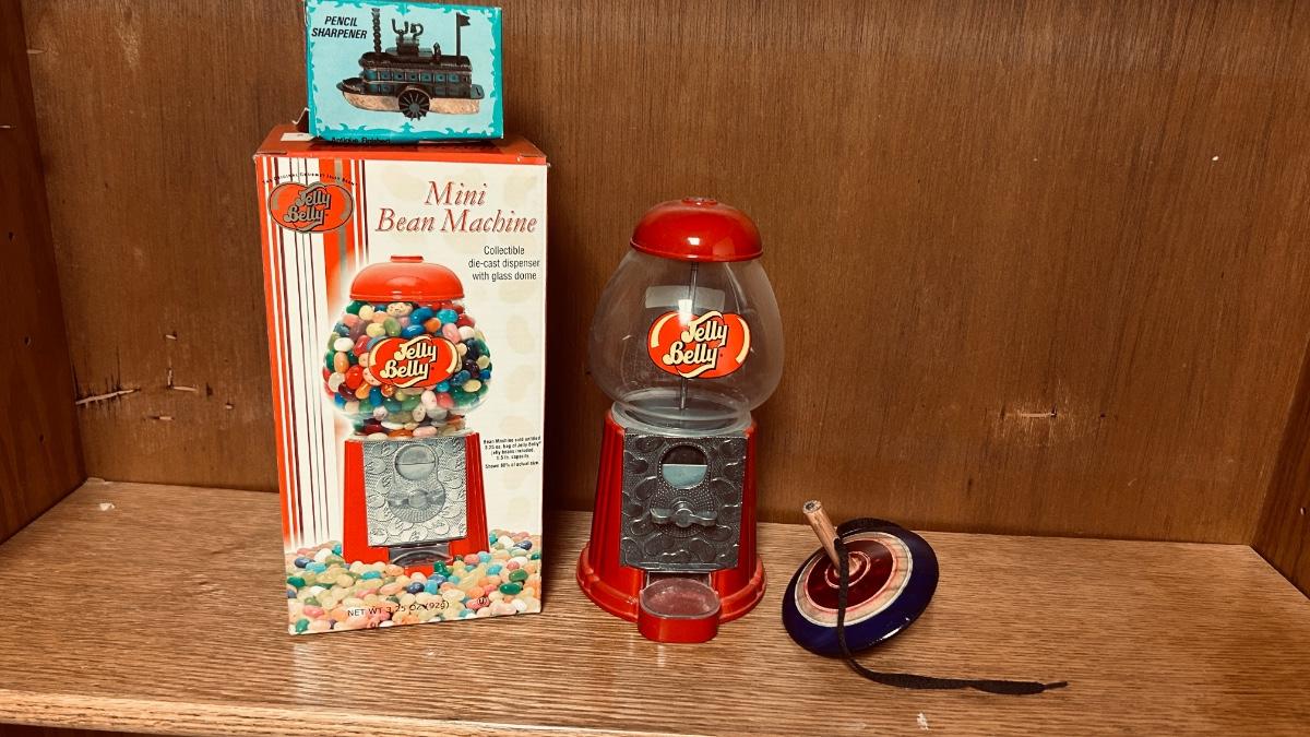 MINI JELLY BELLY BEAN MACHINE, RIVER BOAT PENCIL SHARPENER AND A WOODEN TOP
