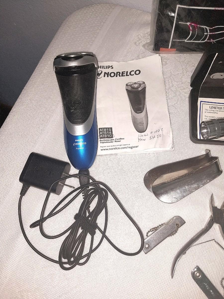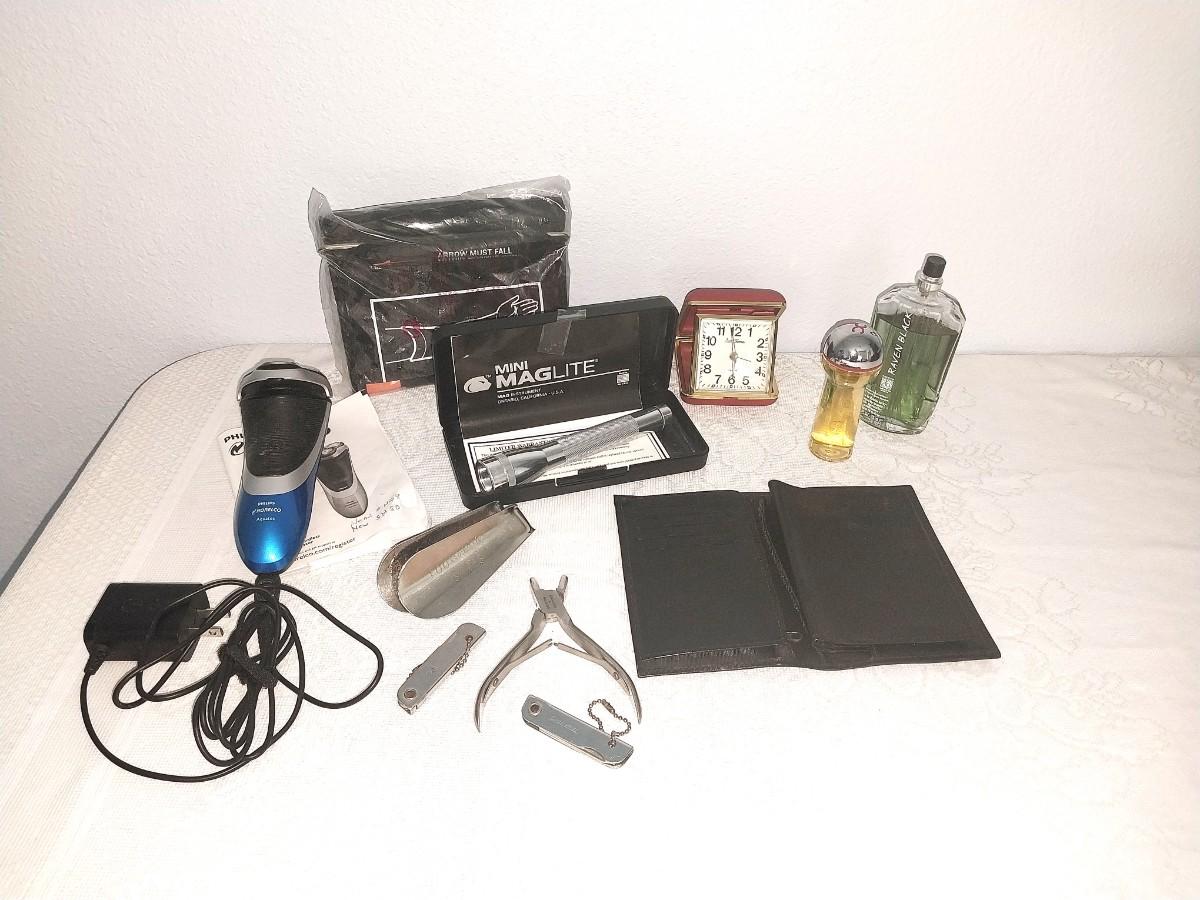 NORELCO ELECTRIC RAZOR-NAIL TRIMMERS-NEW ARM BRACE-SHOE HORN-MINI MAGLITE-MENS COLOGNE-SETH THOMAS TRAVEL ALARM-BLACK LEATHER WALLET-