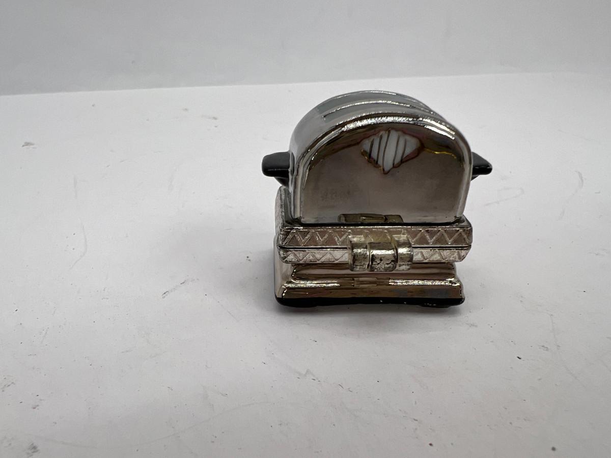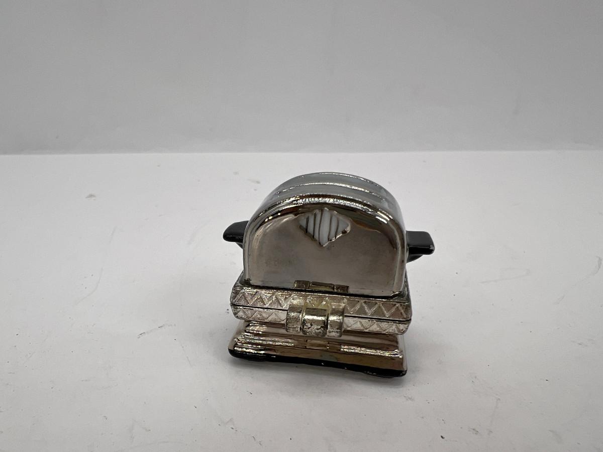 Metal and ceramic this little box opens to store your special crumbs , These boxes were designed by the company, Midwest of Cannon Falls, in the 1990's through the 2000's. The company has stopped production of the collection and all are now retired. Many of them are very hard to find.