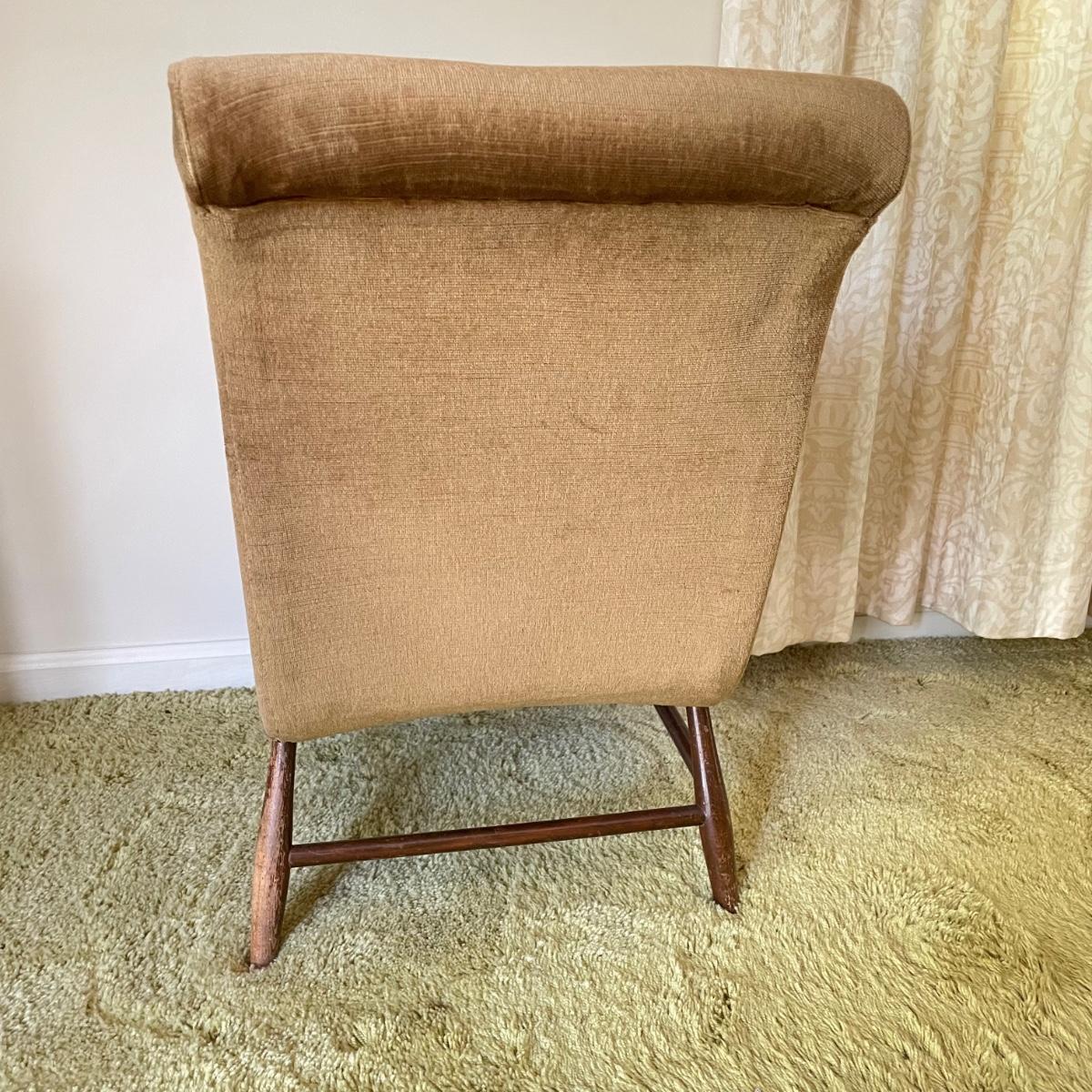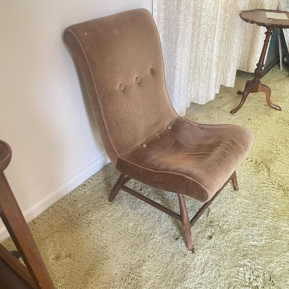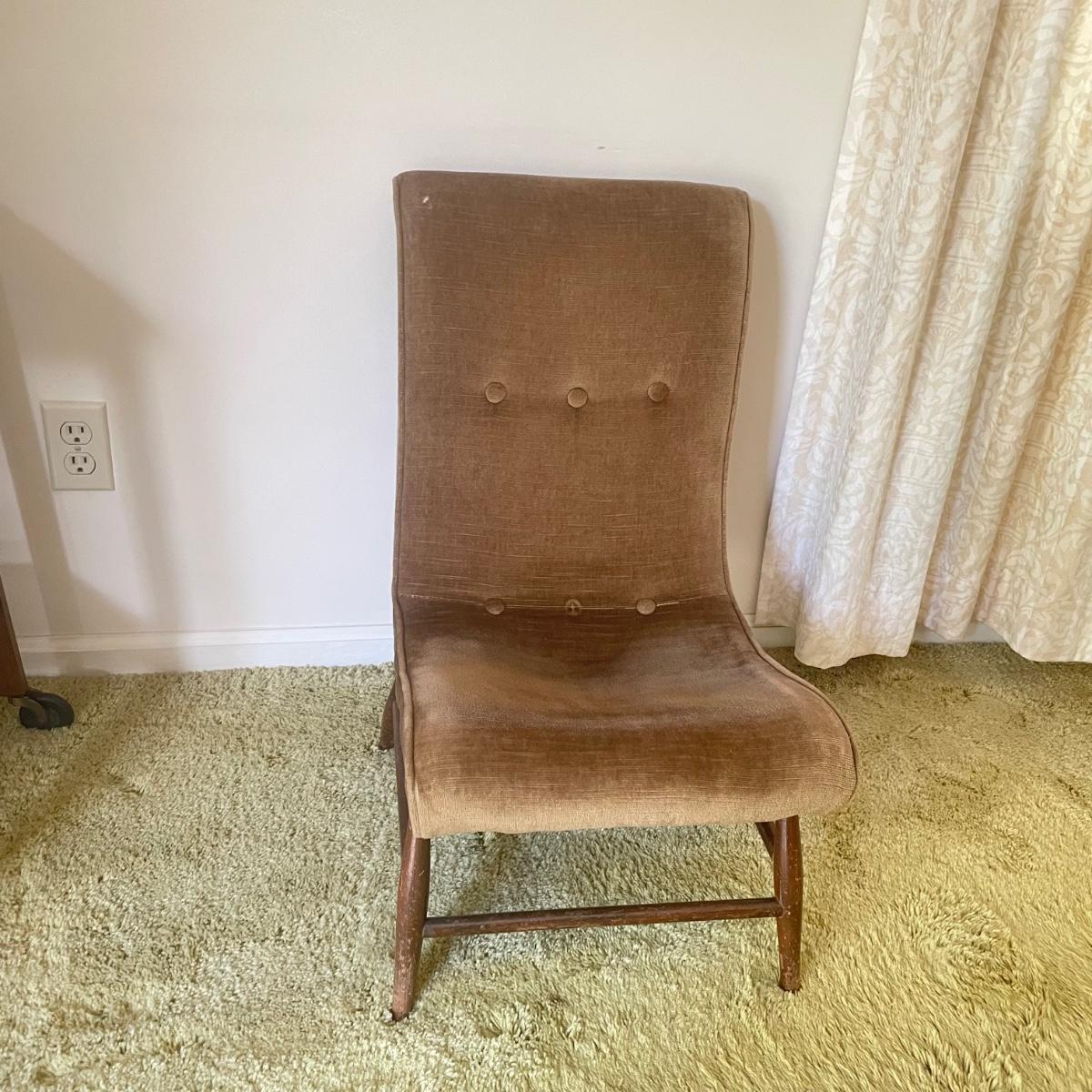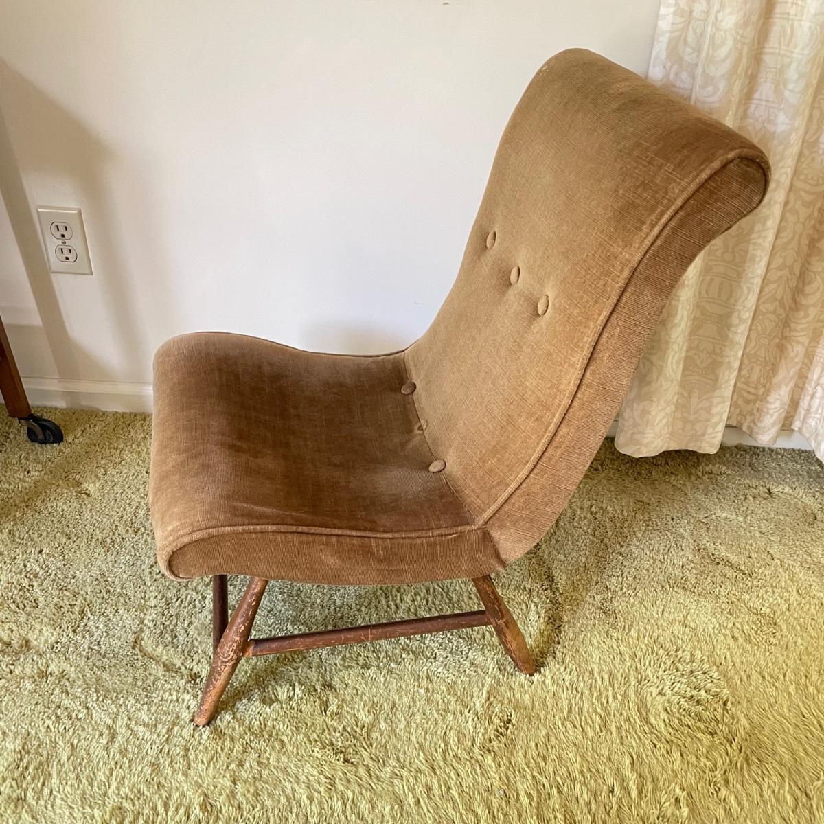 Nice low lounger perfect for petite adults. This chair’s upholstery matches the retro couches and seats earlier in the sale. It is missing one button and the legs are loose, but they appear to possibly be easily fixed with wood glue. The highest part of the lounger seat is 12” off the ground. Chair measures 15.25” x 23” x 26”. See images. Local pick up only.