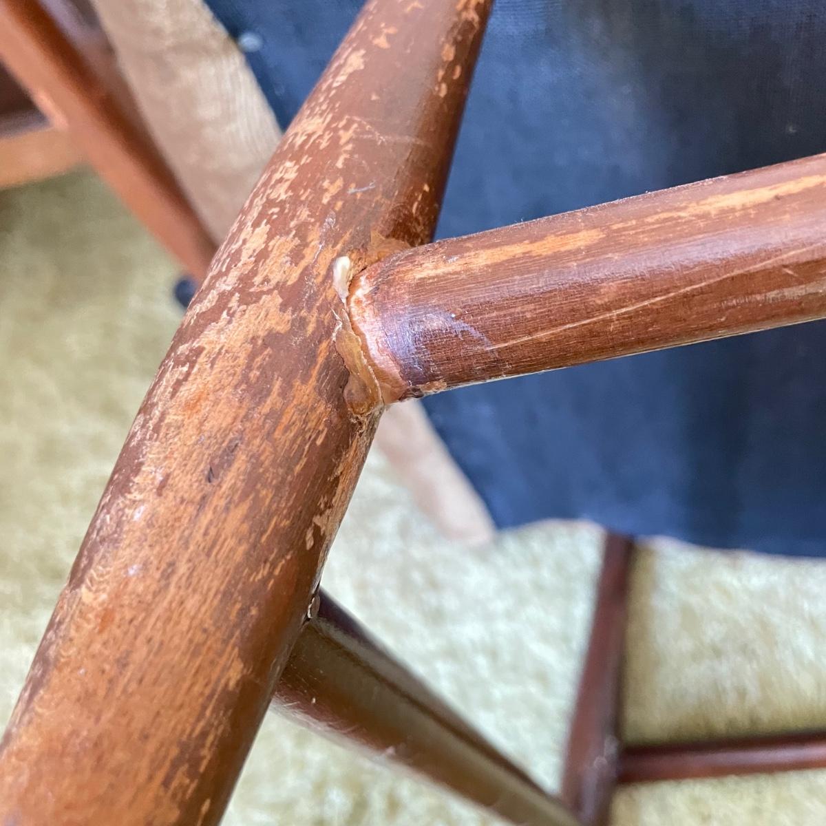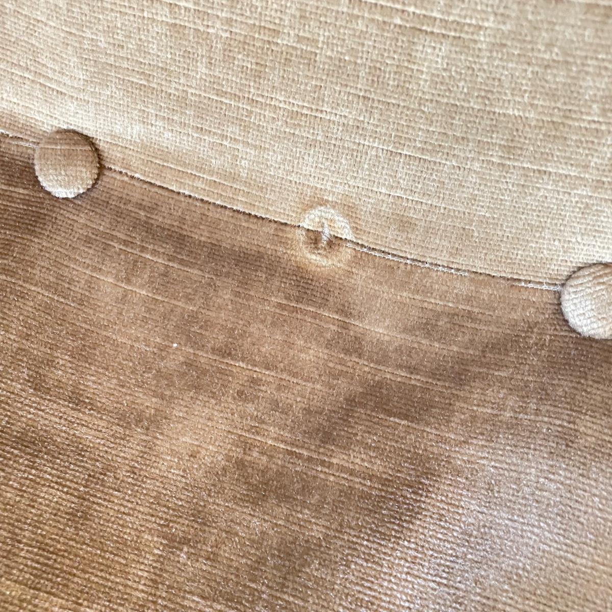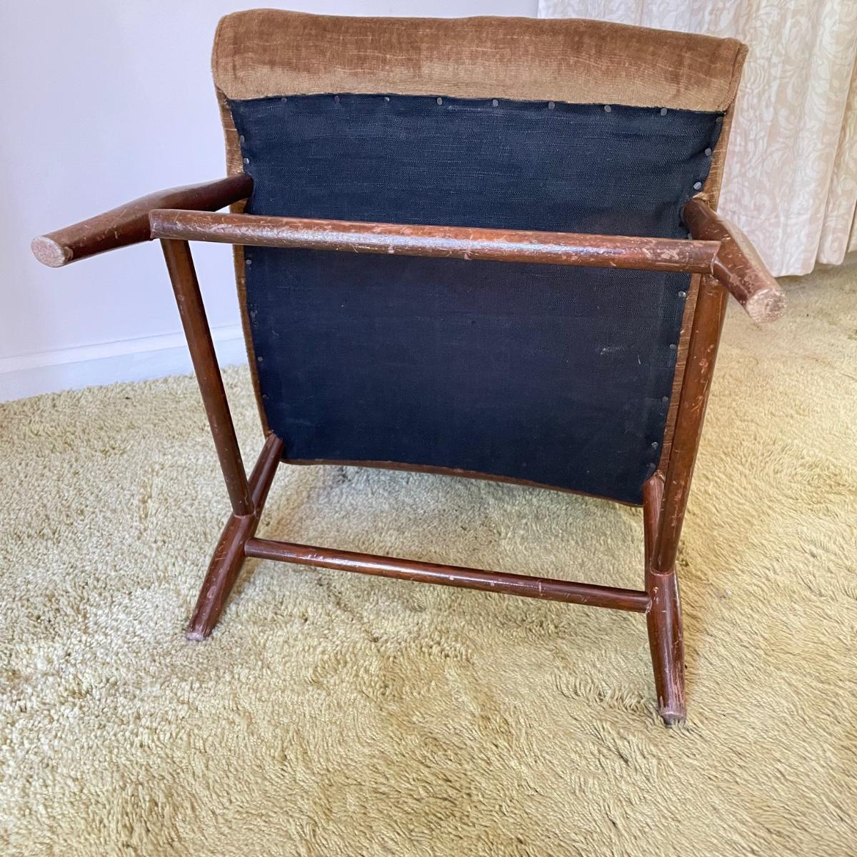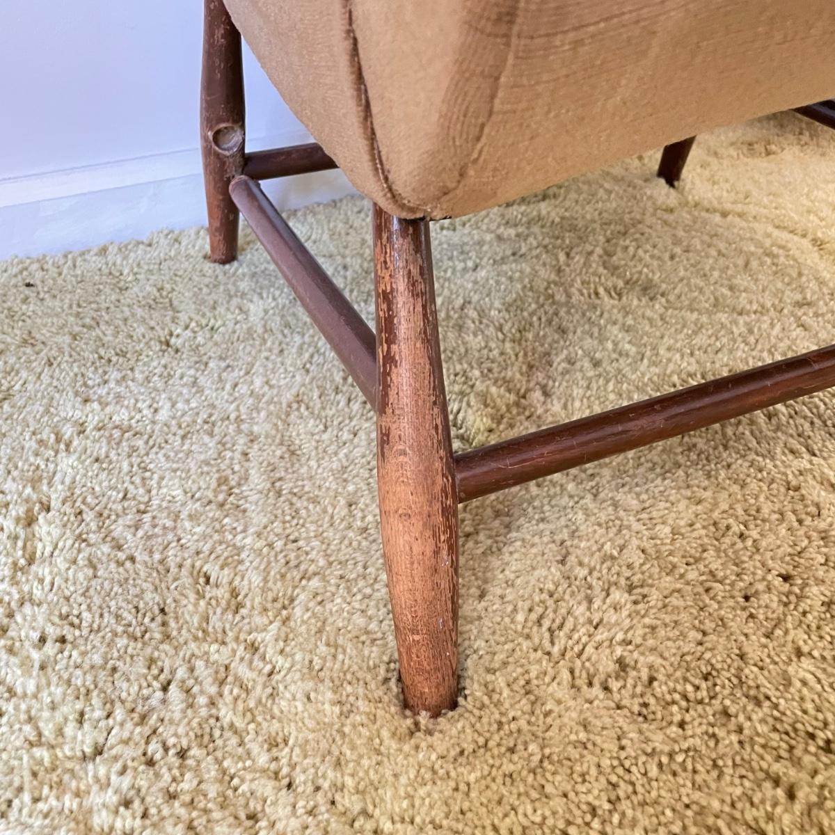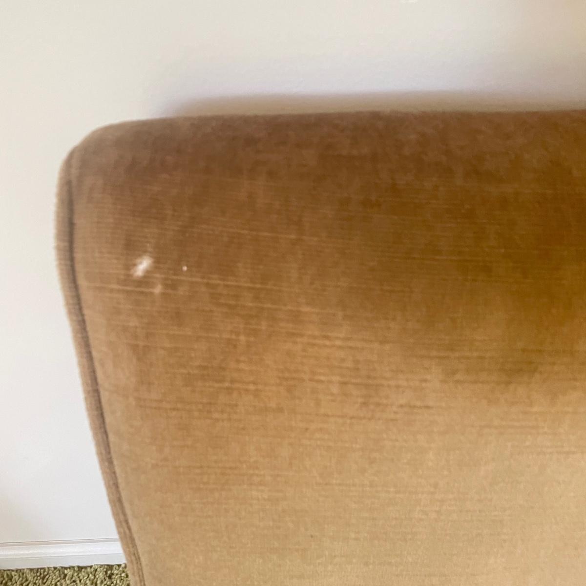 Nice low lounger perfect for petite adults. This chair’s upholstery matches the retro couches and seats earlier in the sale. It is missing one button and the legs are loose, but they appear to possibly be easily fixed with wood glue. The highest part of the lounger seat is 12” off the ground. Chair measures 15.25” x 23” x 26”. See images. Local pick up only.