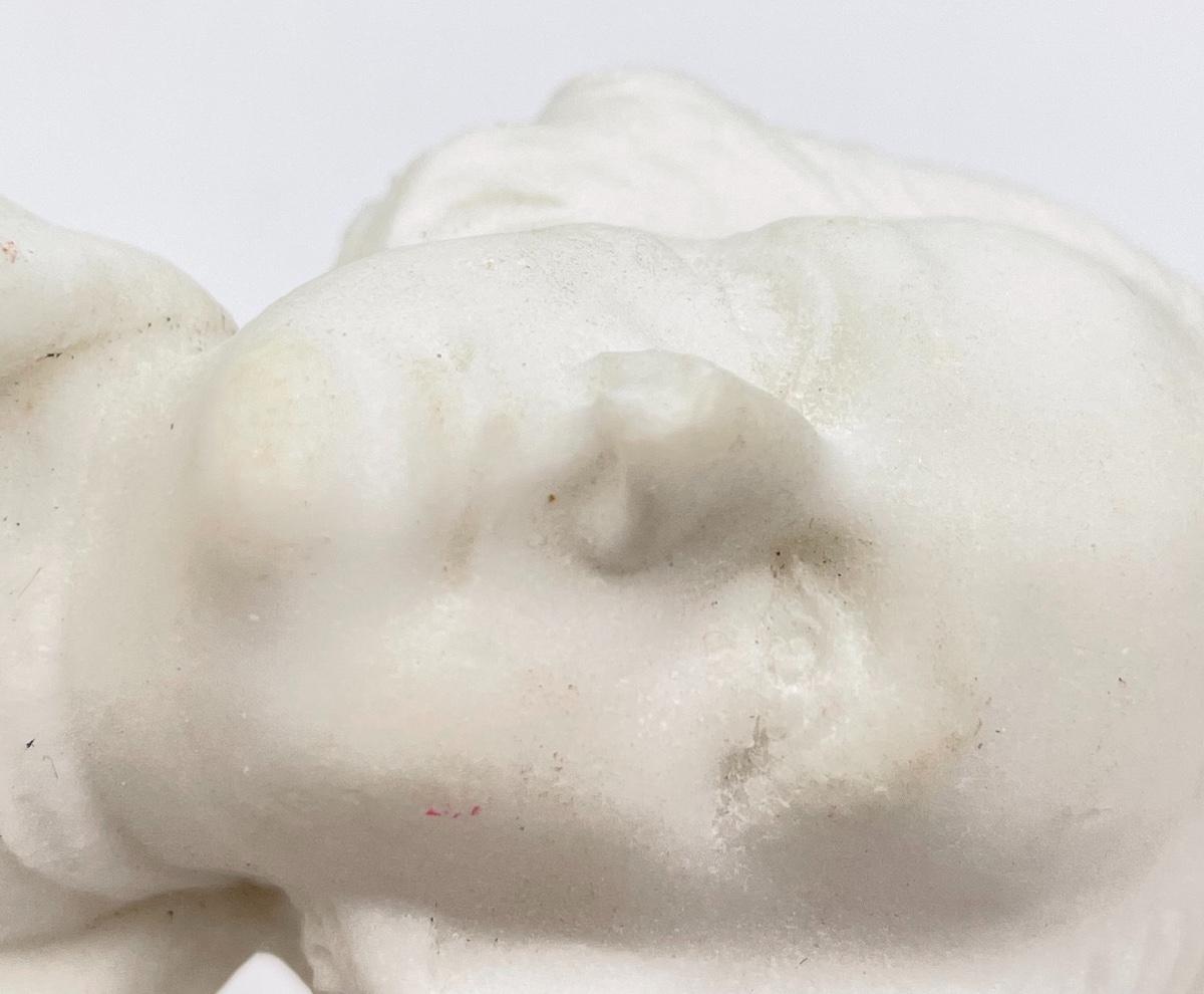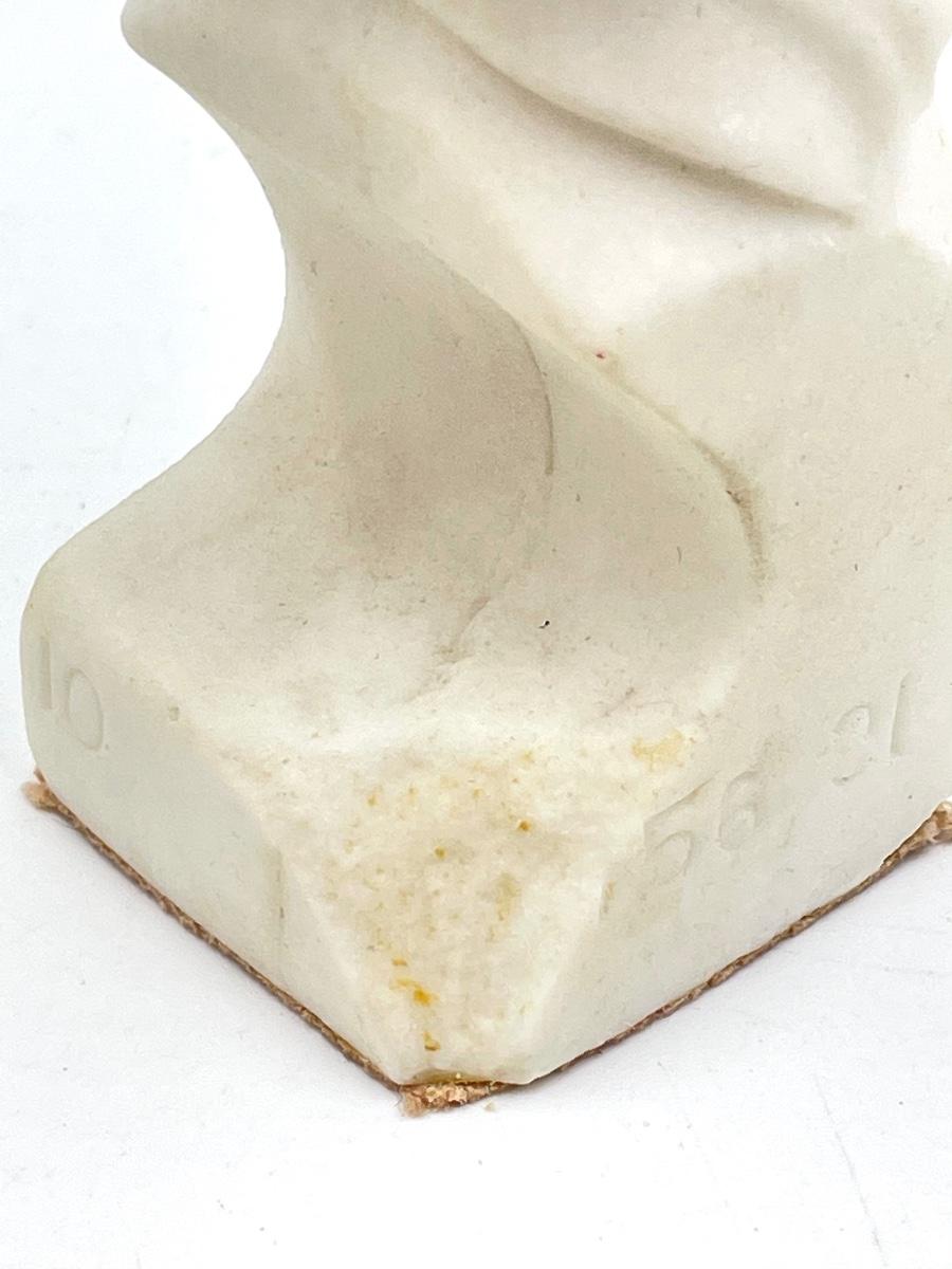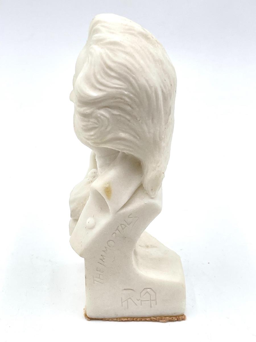 These little guys are only 5” tall - interestingly, Tchaikovsky’s name is spelled wrong! They do both have various staining and Mozart has a small chip on his nose and a larger piece on the back broken off. Unsure of material - possibly chalkware?