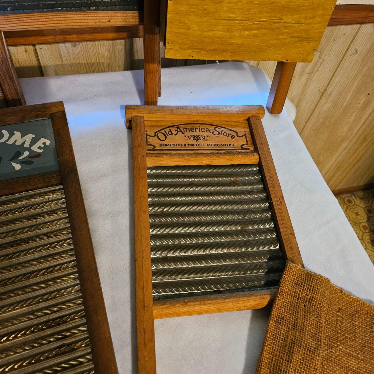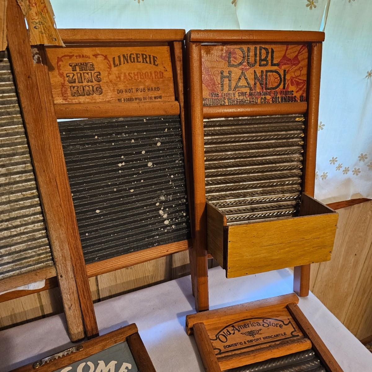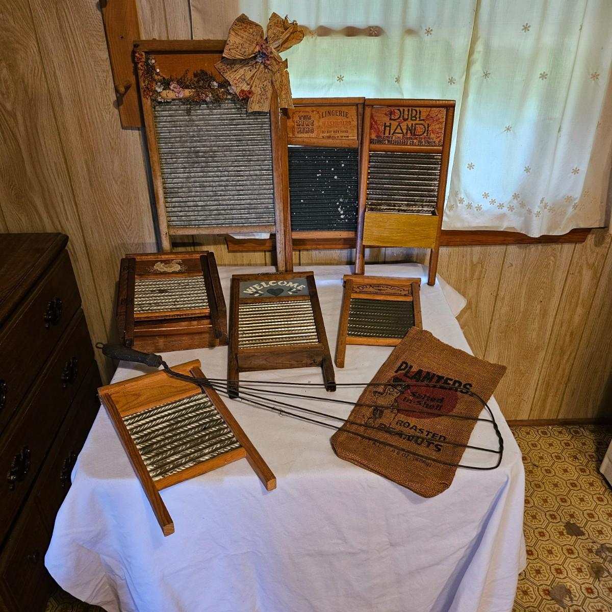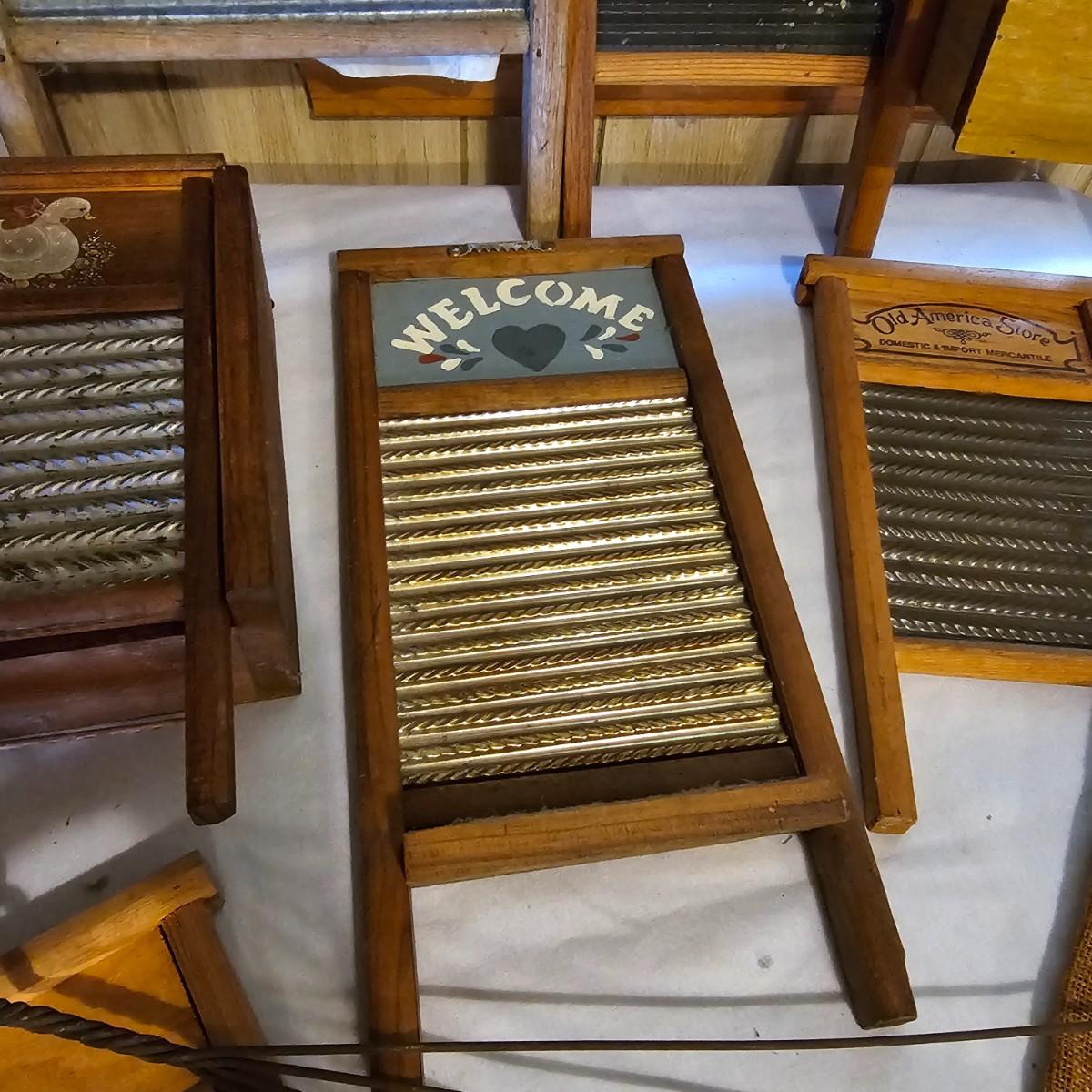 Seven small decorative washboards, one Planters Peanut sack and a vintage rug beater. All washboards have corrugated metal wash areas. Largest is 13" x 23" , smallest is 7.5" x 14". Rug beater is 8" x 32". See photos for details. Shipping available.