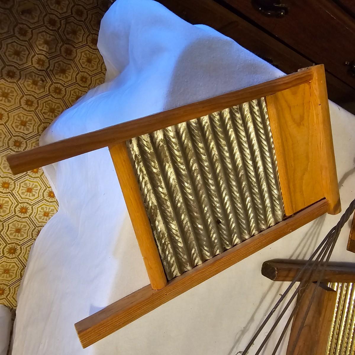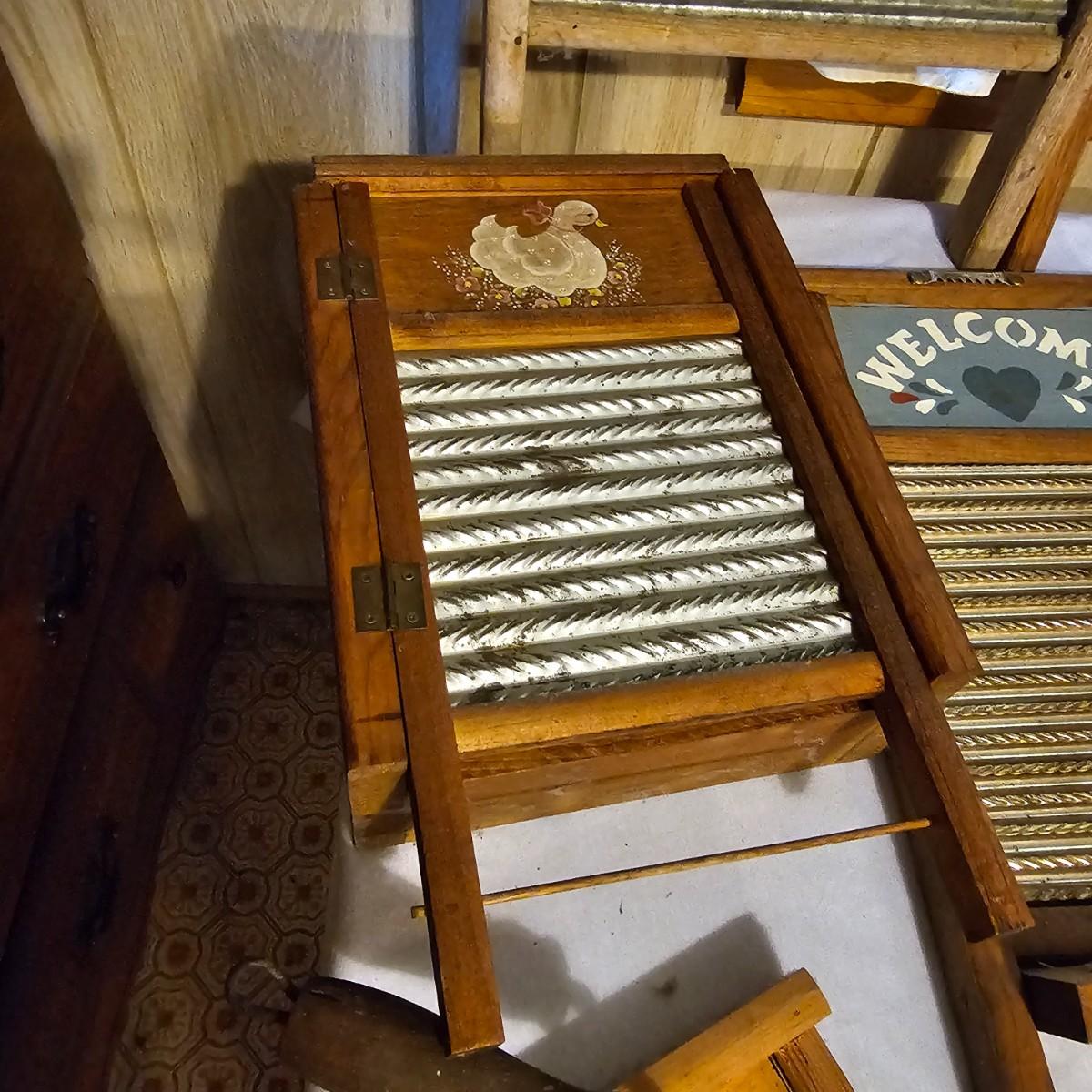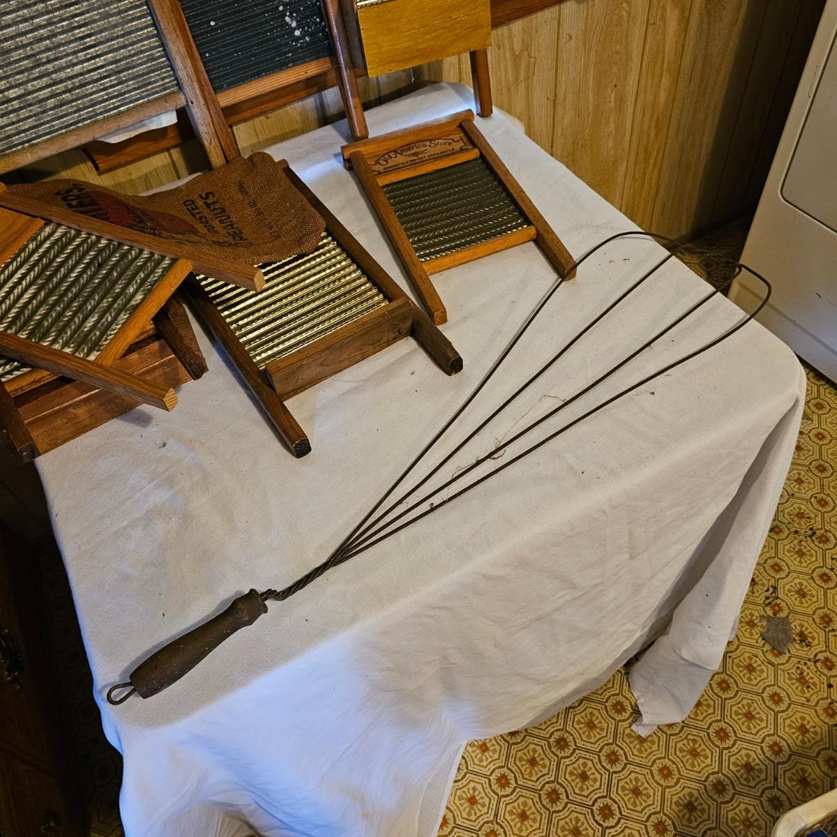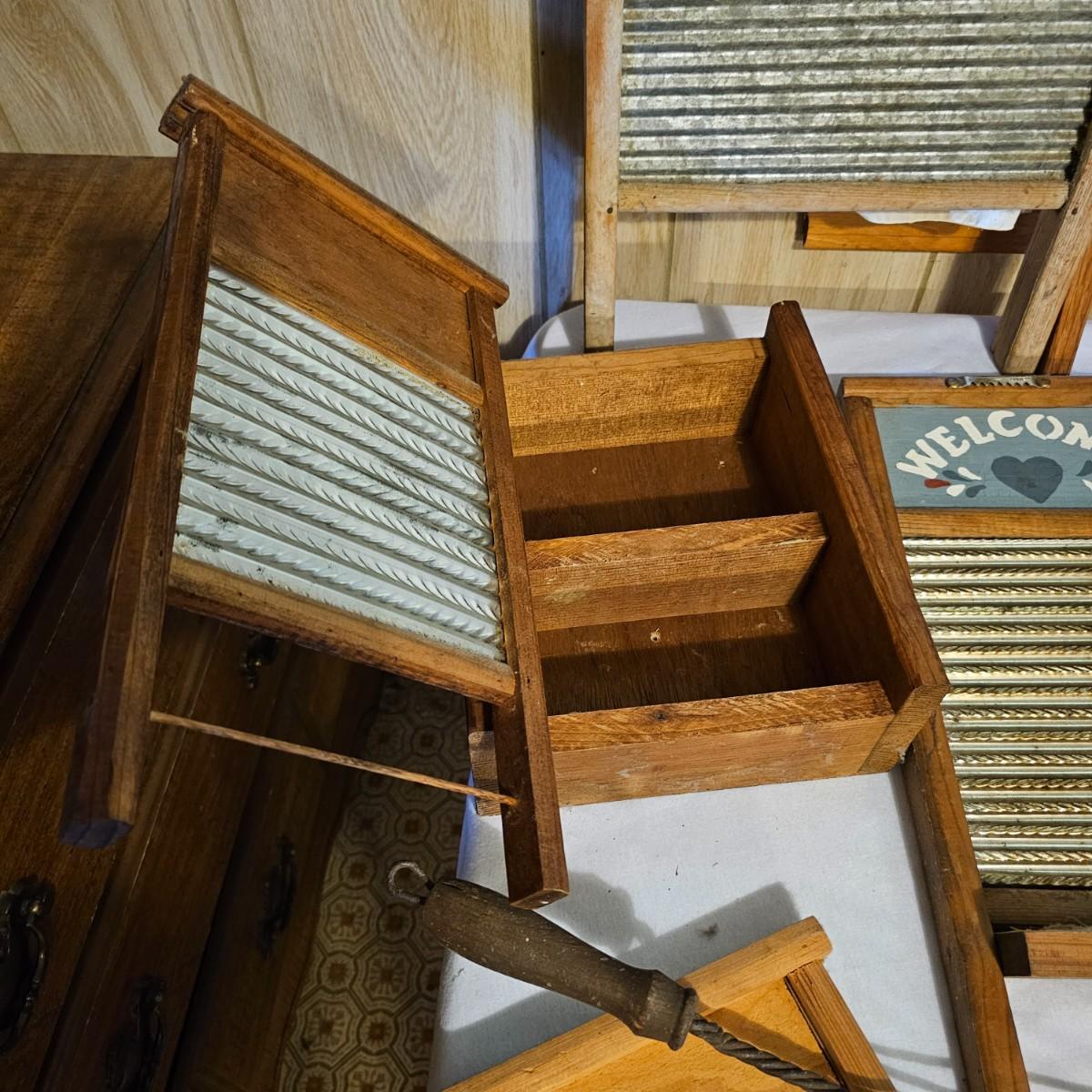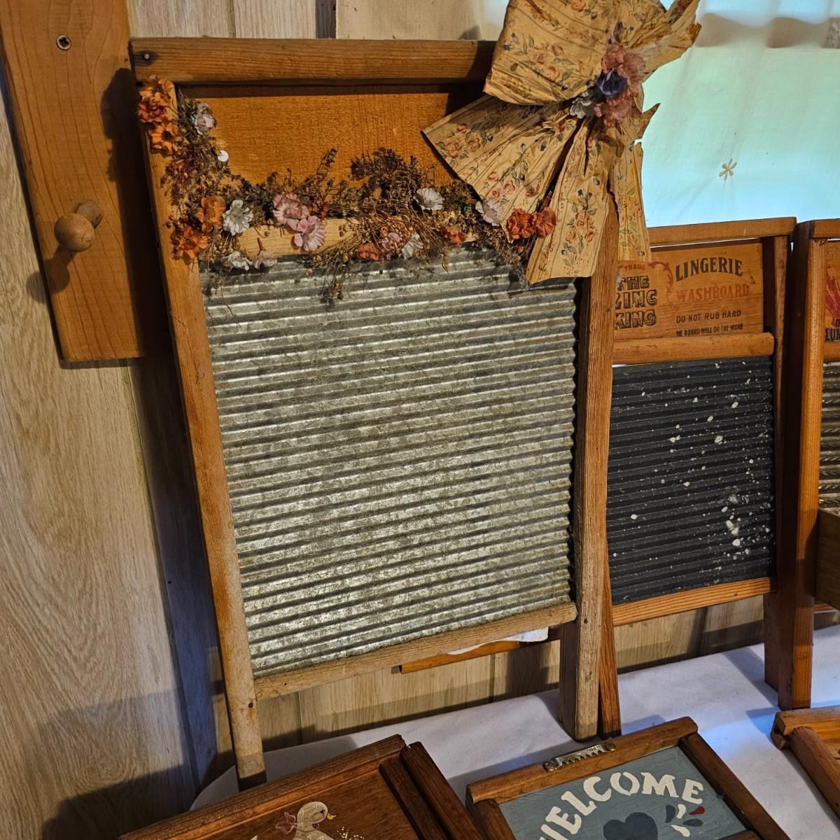 Seven small decorative washboards, one Planters Peanut sack and a vintage rug beater. All washboards have corrugated metal wash areas. Largest is 13" x 23" , smallest is 7.5" x 14". Rug beater is 8" x 32". See photos for details. Shipping available.