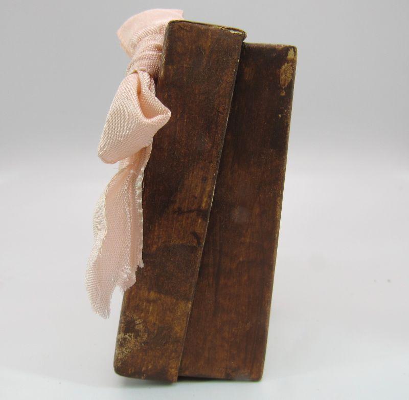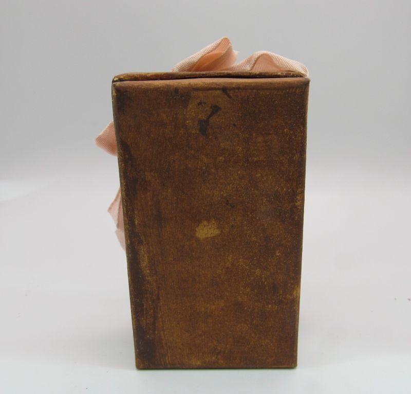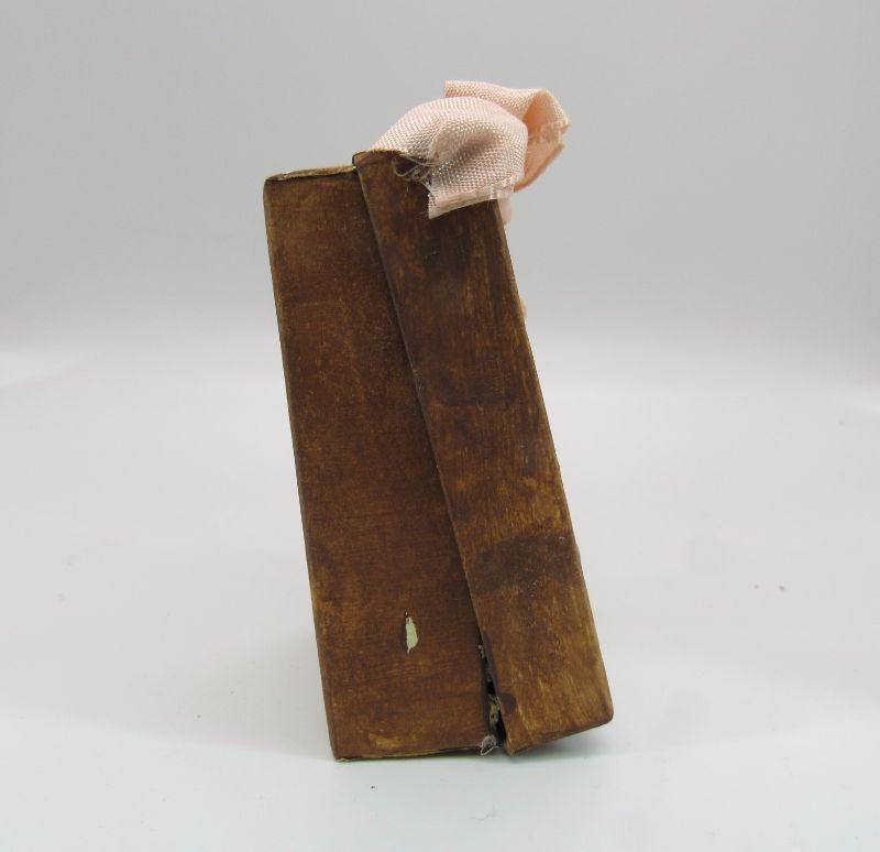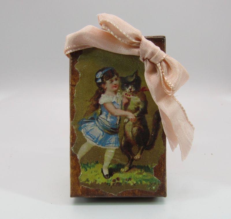 Miniature celluloid baby inside a decorated box. Box is decopaged on front and done in a shadow box style inside. Great for display. #020-499a6