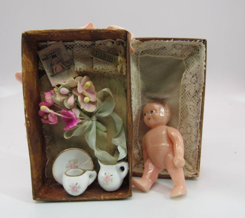 MINIATURE CELLULOID BABY FIGURINE SHADOWBOX INSIDE DECORATED BOX