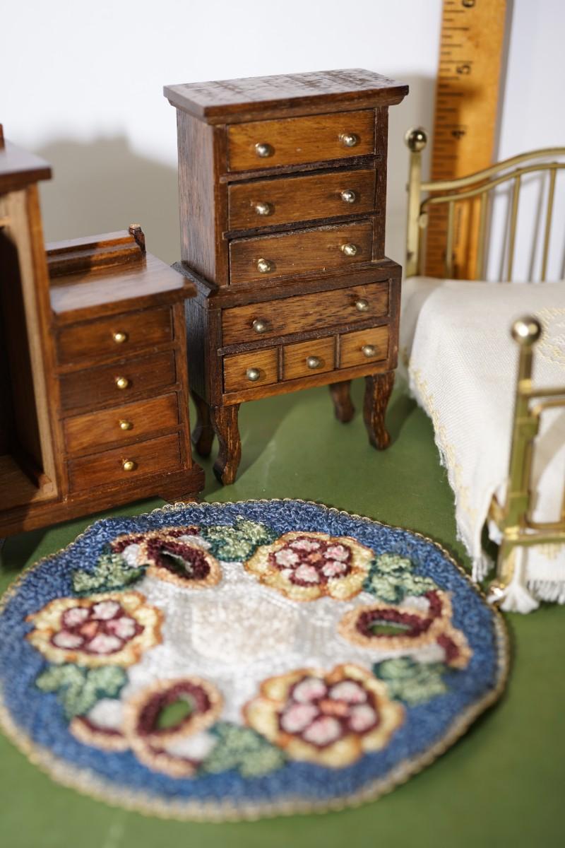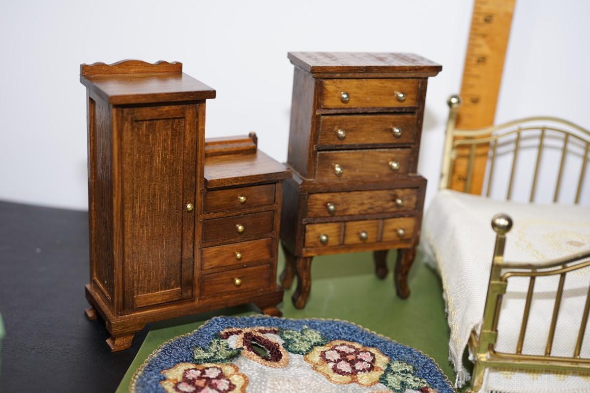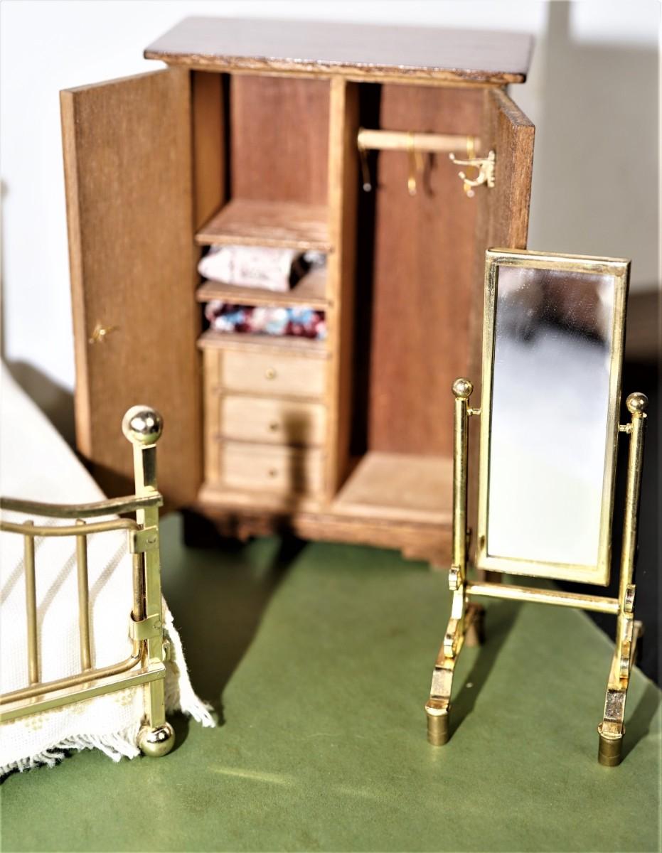 MINIATURE BEDROOM OF AN EARLY 1900'S STYLE TO INCLUDE BRASS BED/CHIFFEROBE PLUS