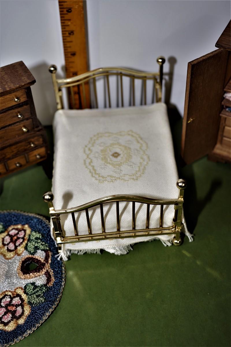 brass bed( real brass, with a mattress and needlework cloth and pillow 7" by 5" with a height of 4"