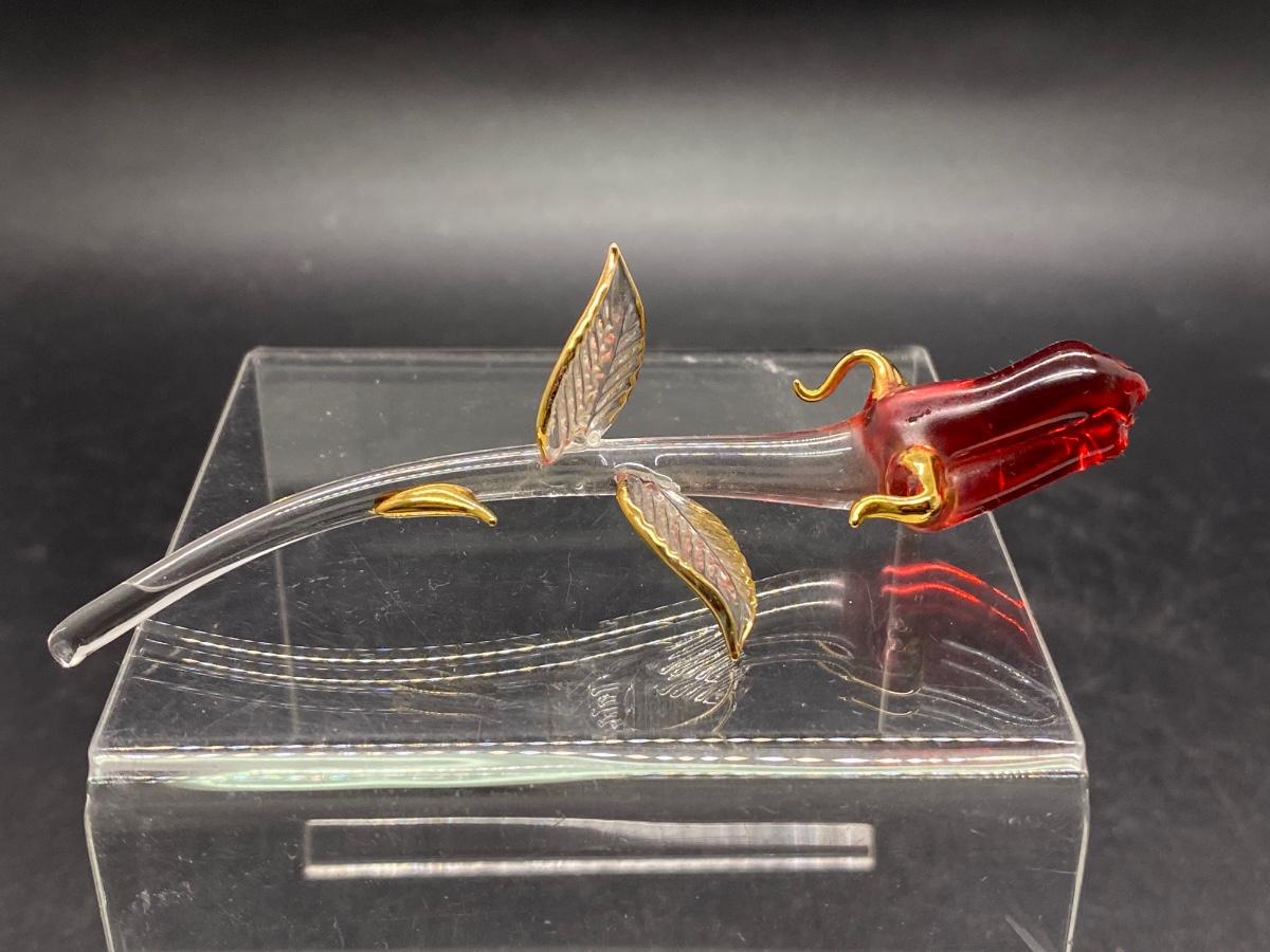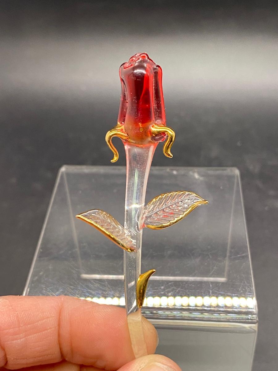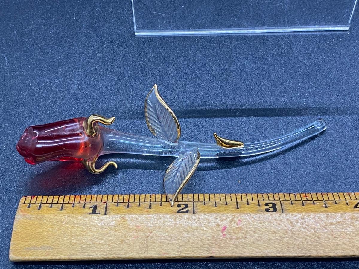 Miniature blown glass red rose. Gold accent leaves and thorn. Under 4' length. Displays nice, no damage noticed.