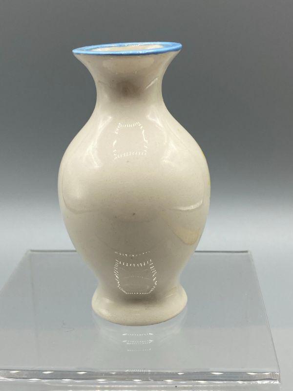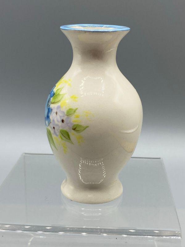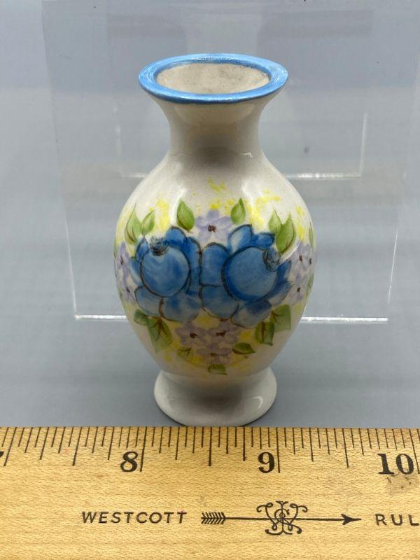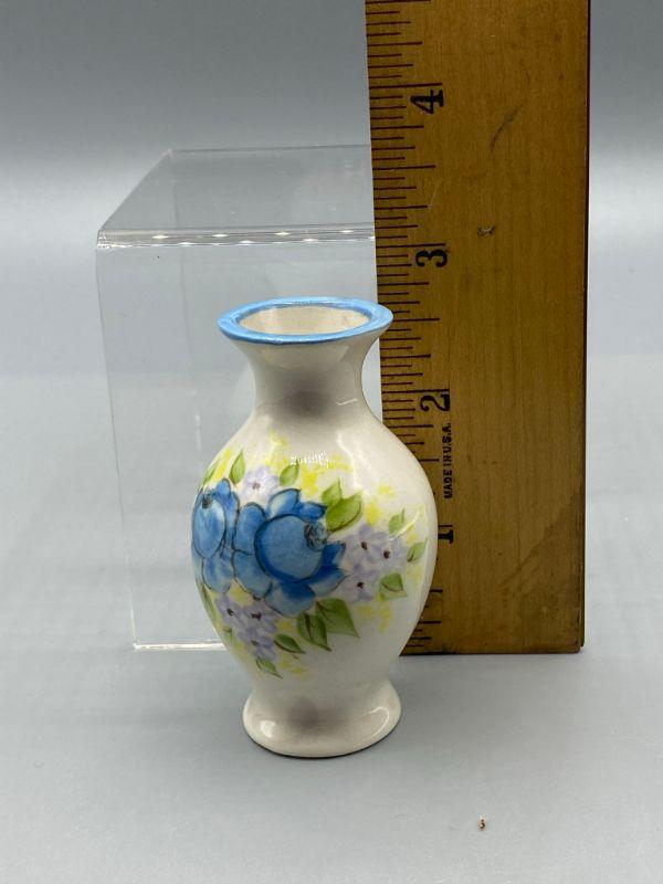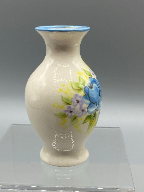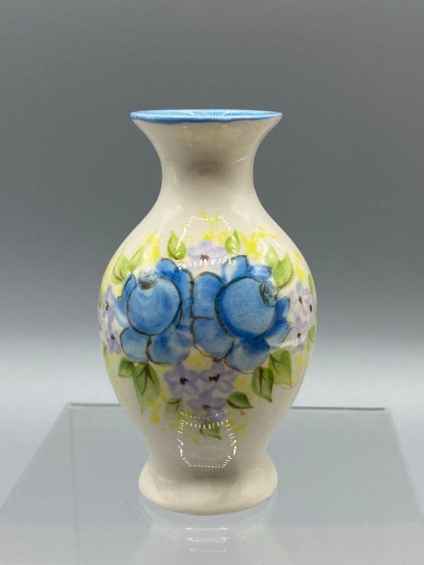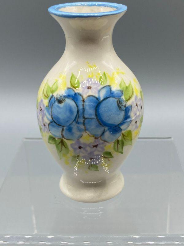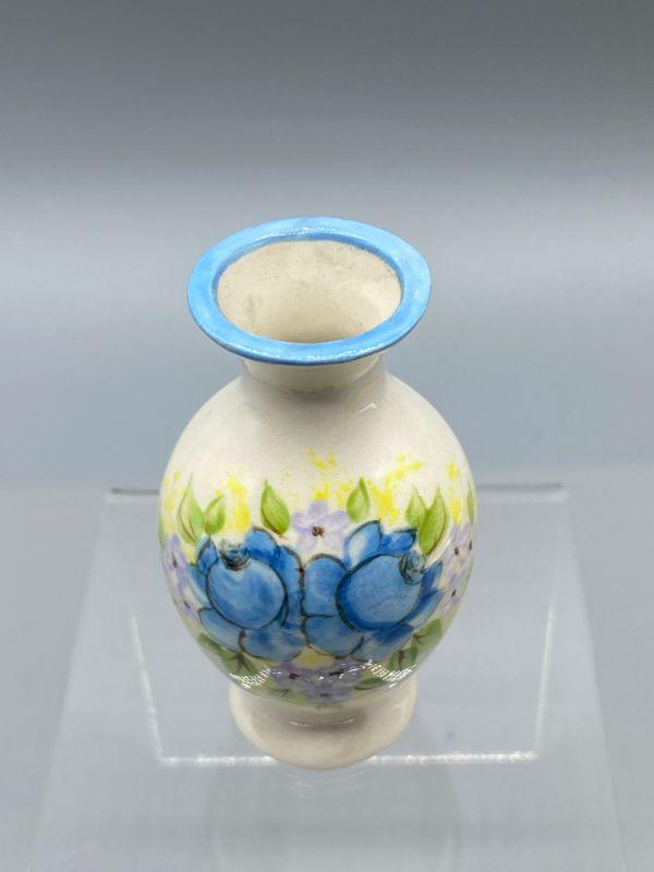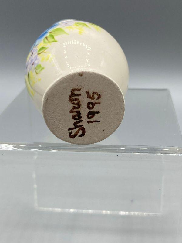 Miniature flower vase. Blue floral design, blue rim. Signed Sharon 1995 on the bottom. Stands about 3" tall. Good condition.
