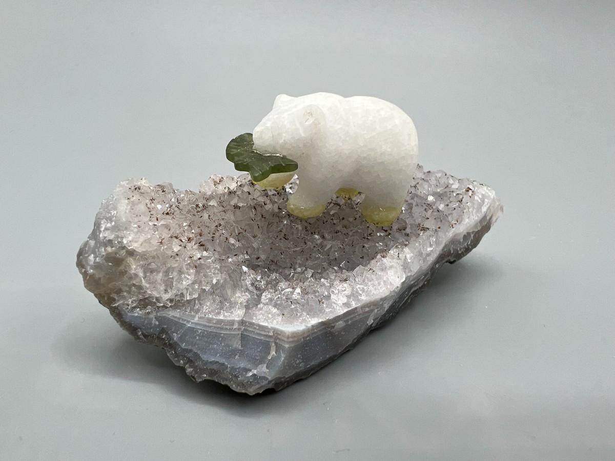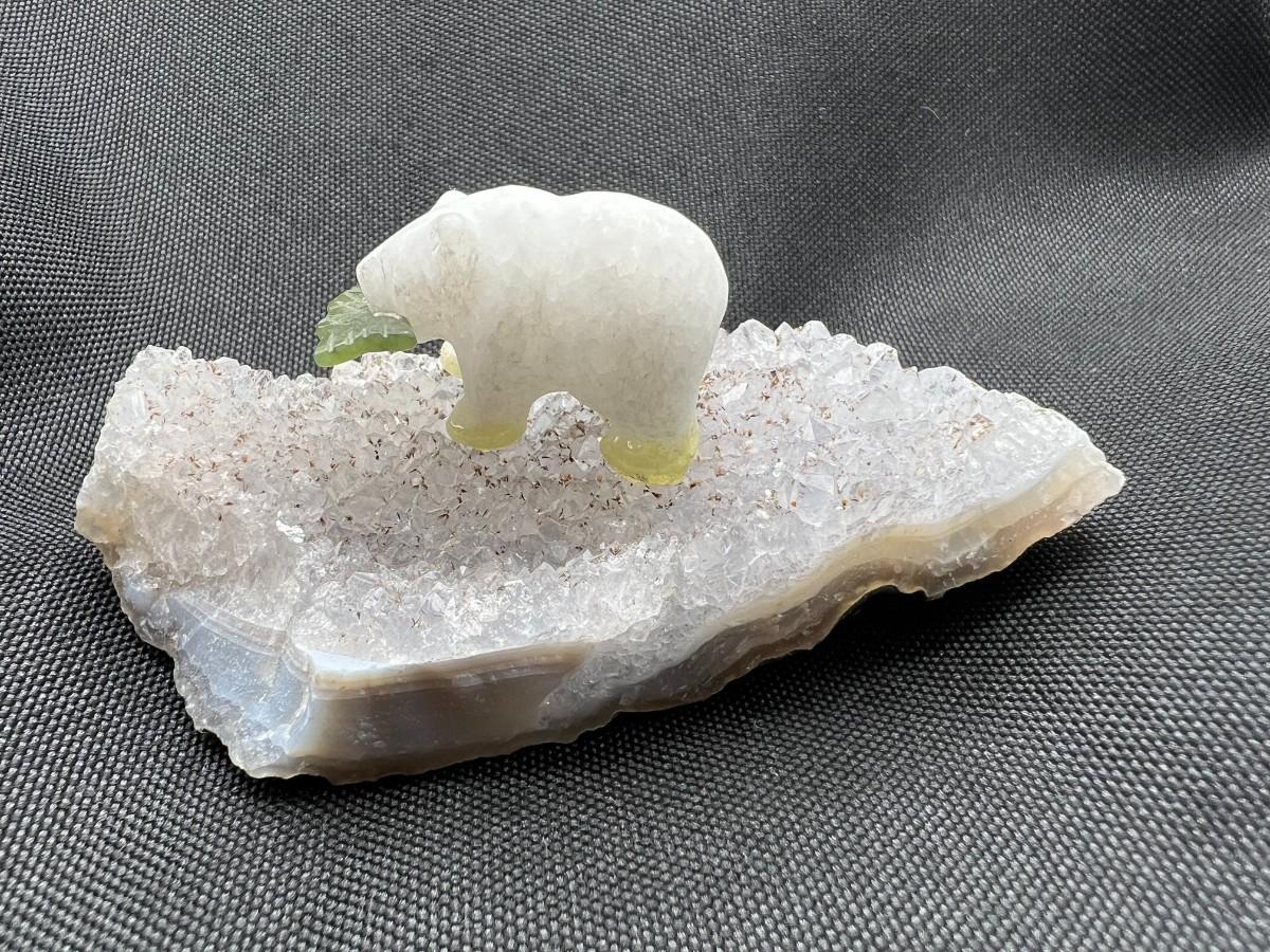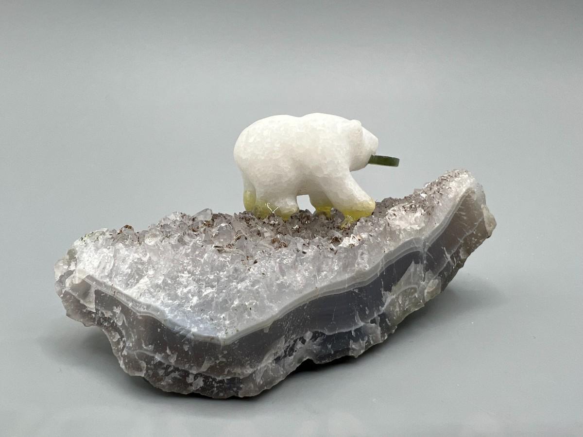 Miniature Carved Stone Polar Bear with Fish on Crystal Rock Piece