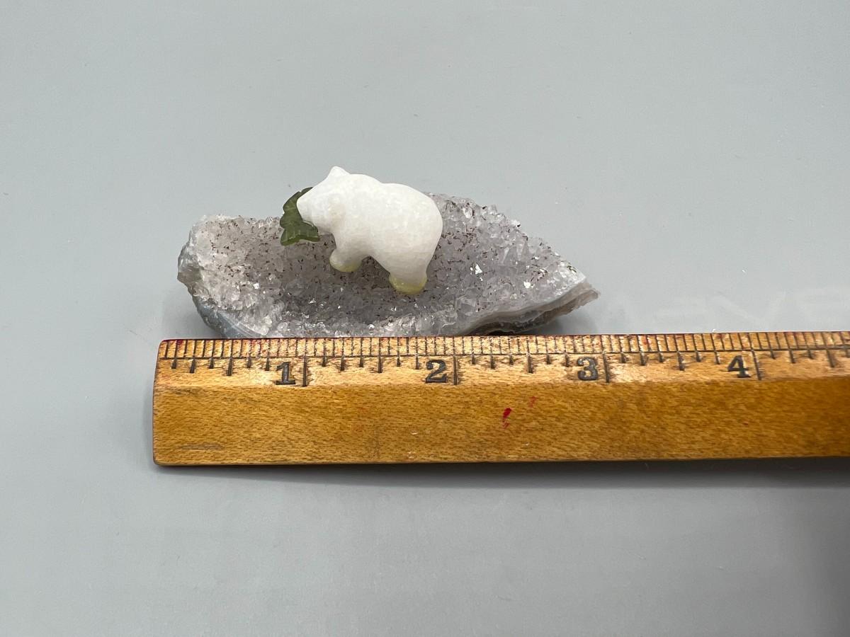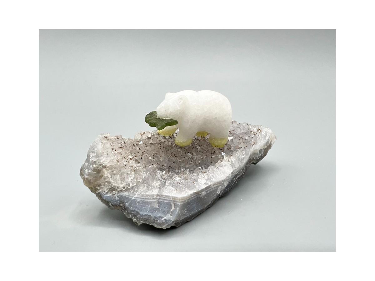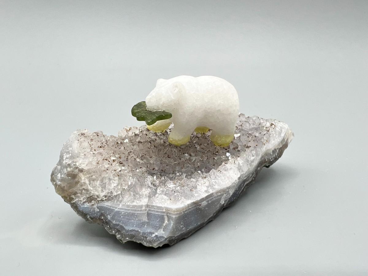 Miniature Carved Stone Polar Bear with Fish on Crystal Rock Piece