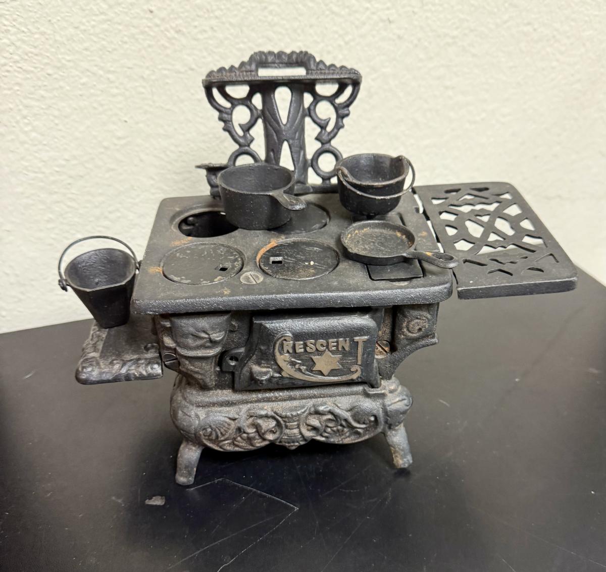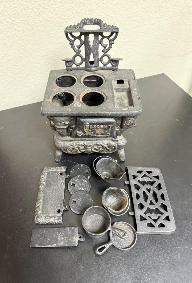 Marked "CRESCENT" on the front access door. Missing a top round cover and smokestack, all other accessories are there: 3 top round covers, griddle cover, 2 side shelves, smokestack guard, bucket, pot, pan, and frypan. Some minor surface rust but in very good condition.