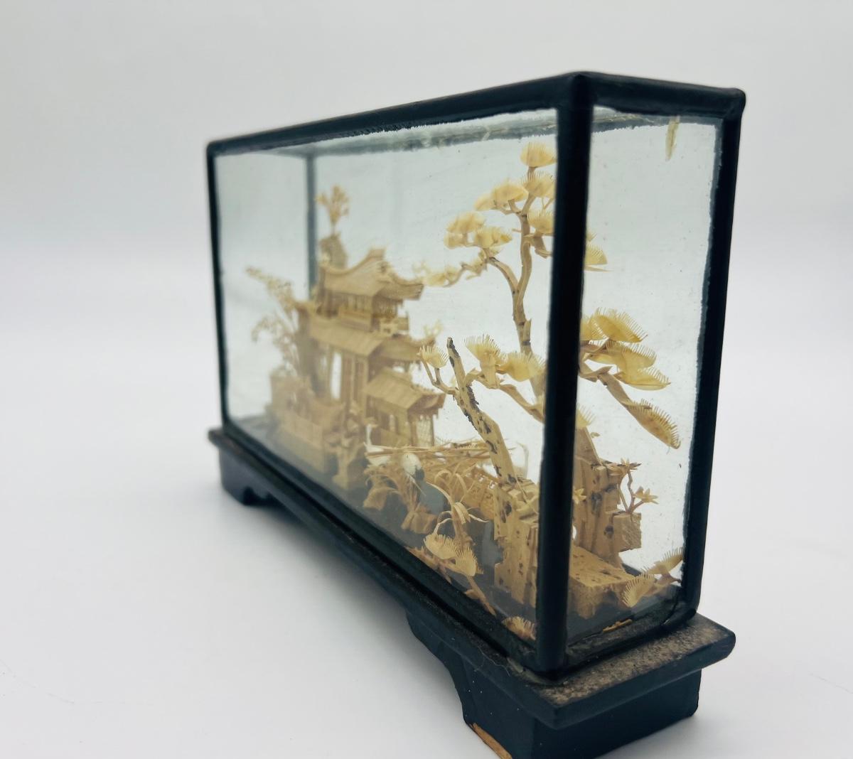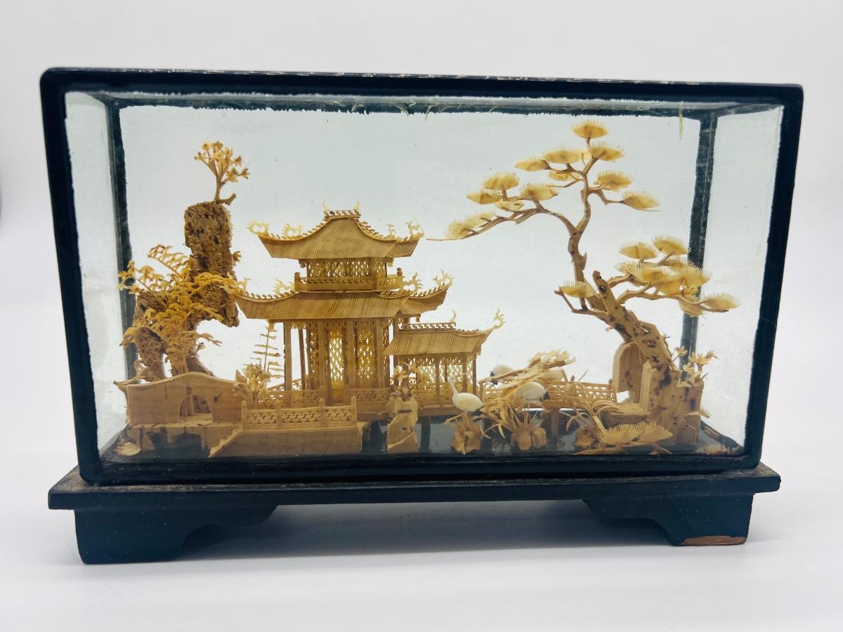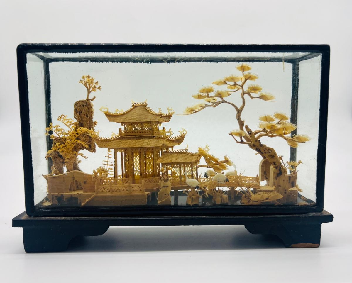 Small Miniature Chinese Cork Diorama with Lacquered Base. Measures 5 inches tall, 8 inches wide and 2 inches deep.