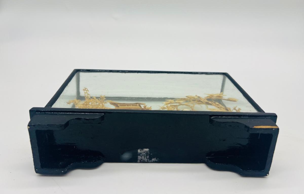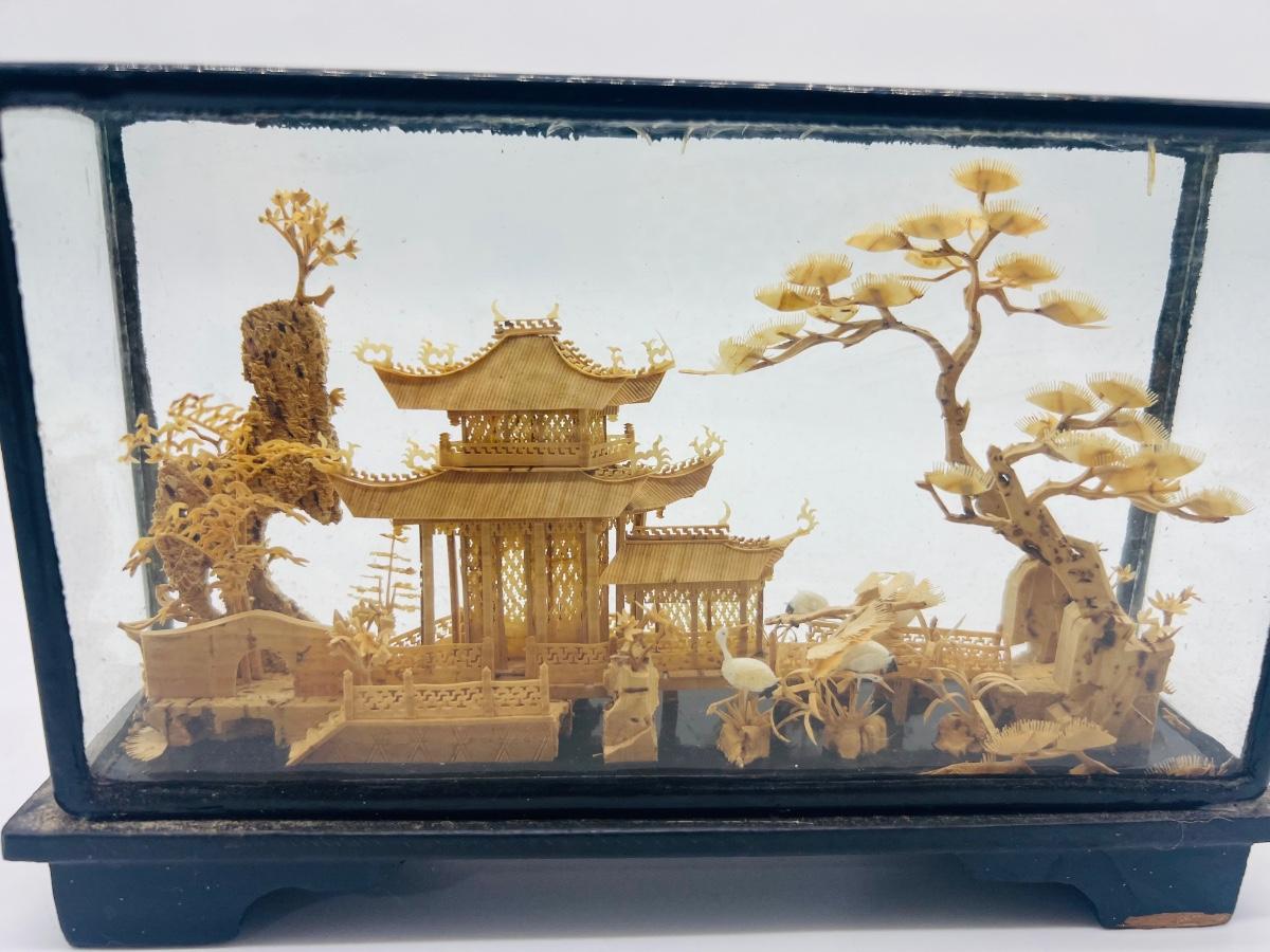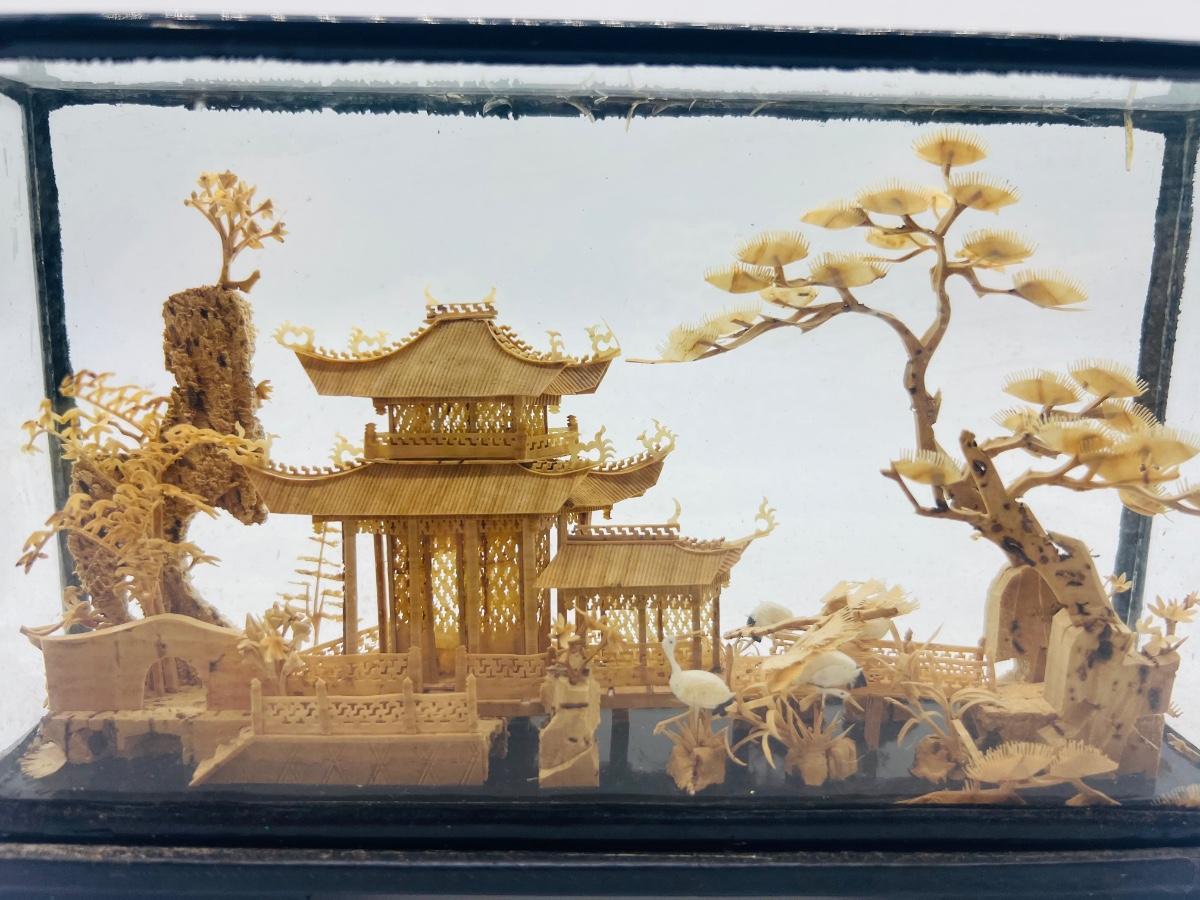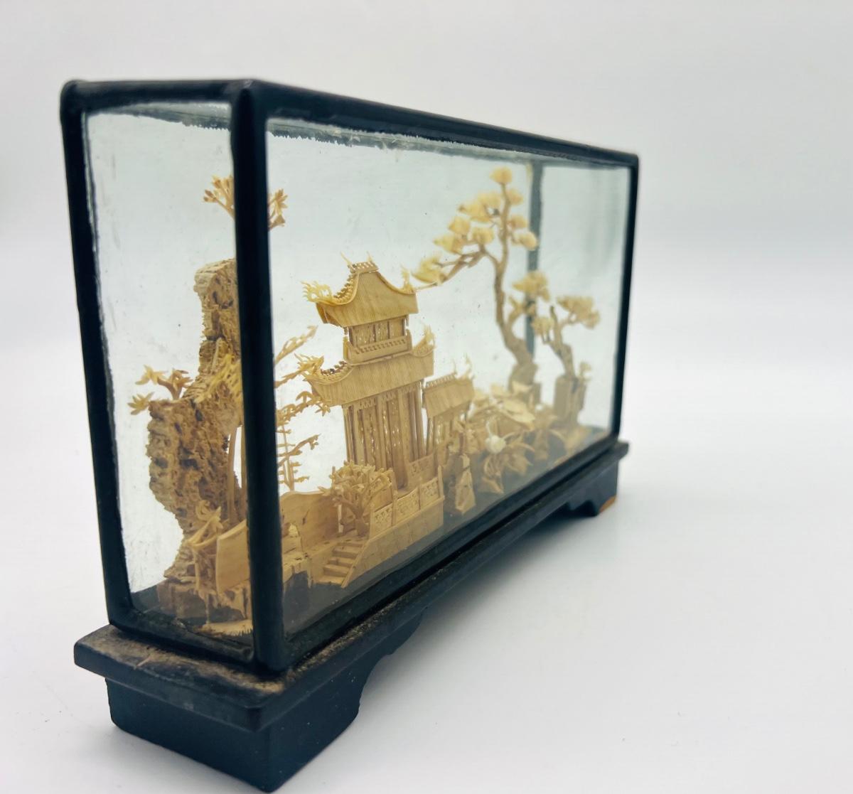 Small Miniature Chinese Cork Diorama with Lacquered Base. Measures 5 inches tall, 8 inches wide and 2 inches deep.