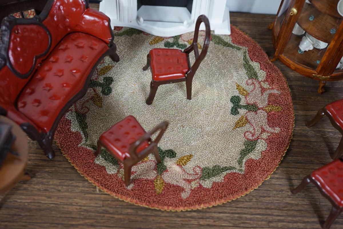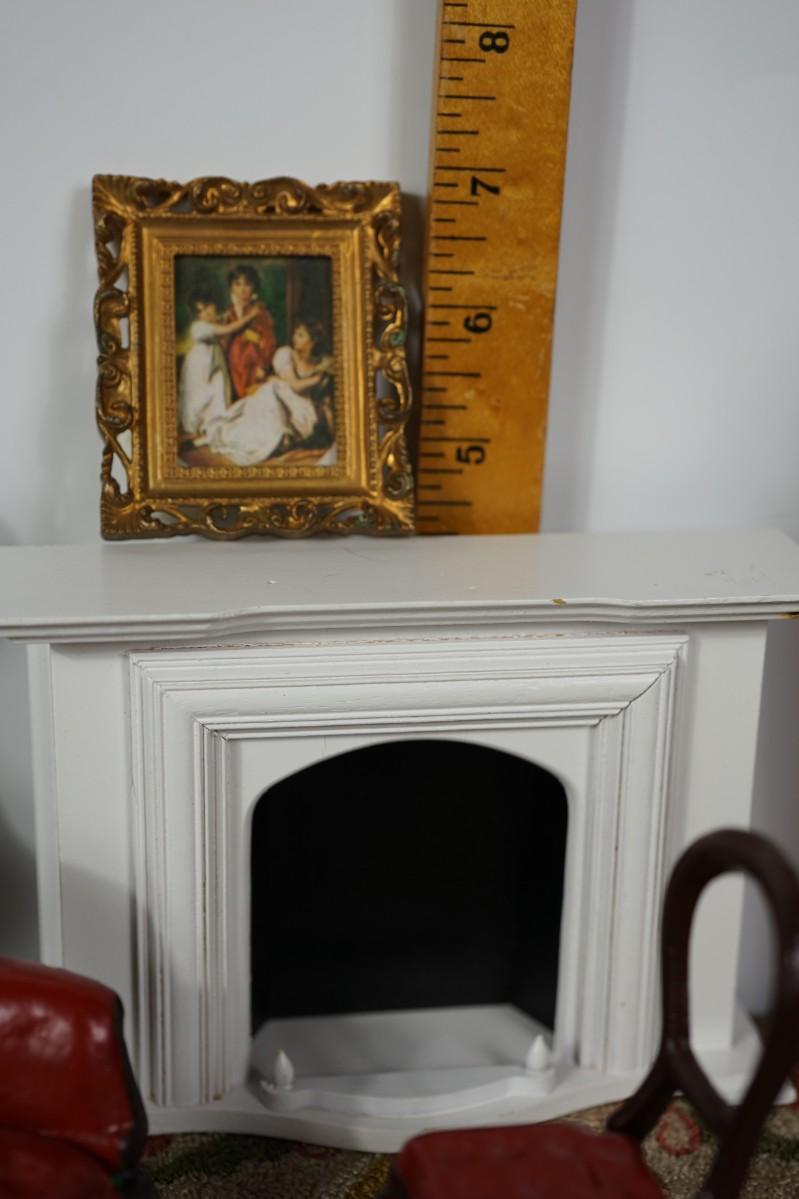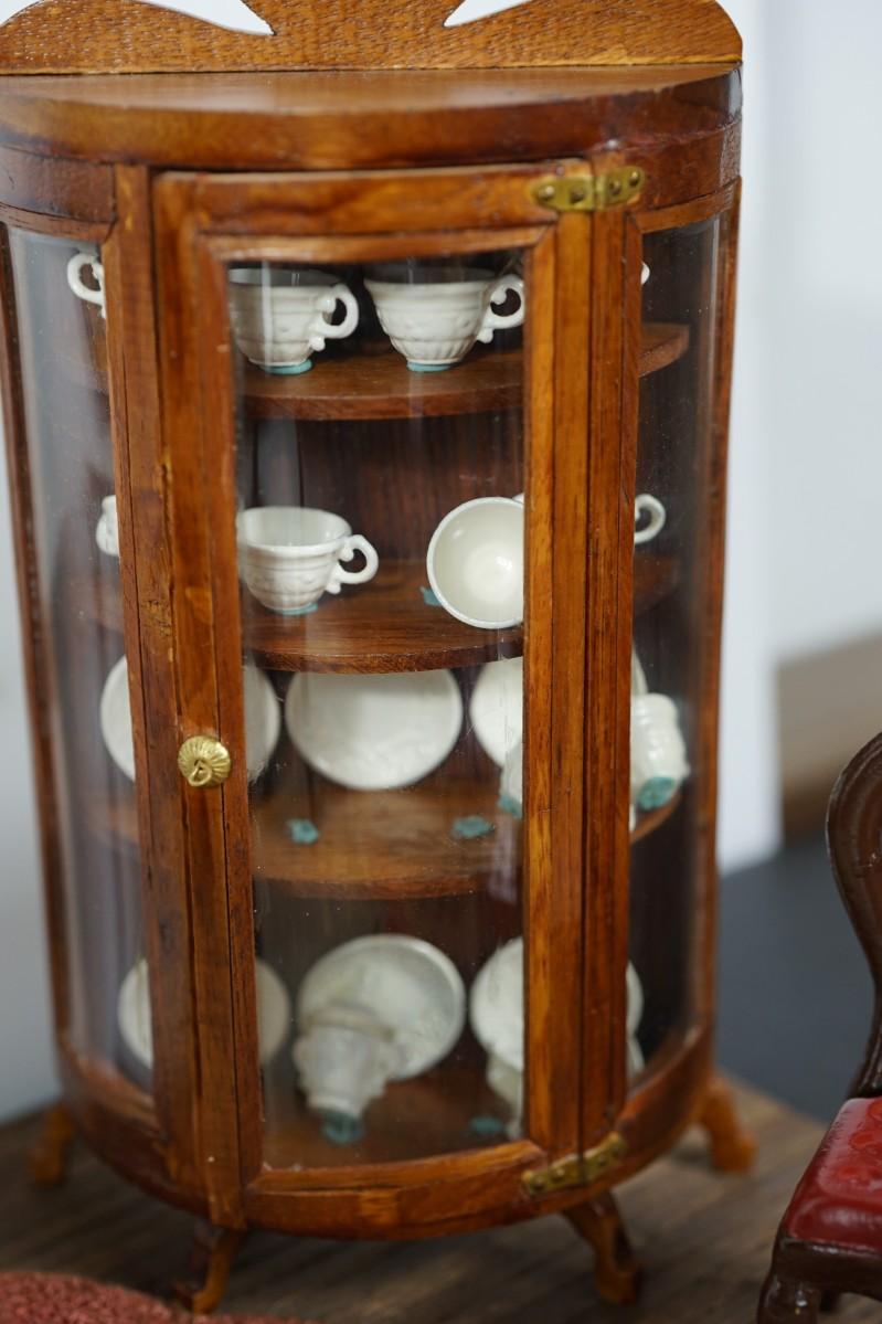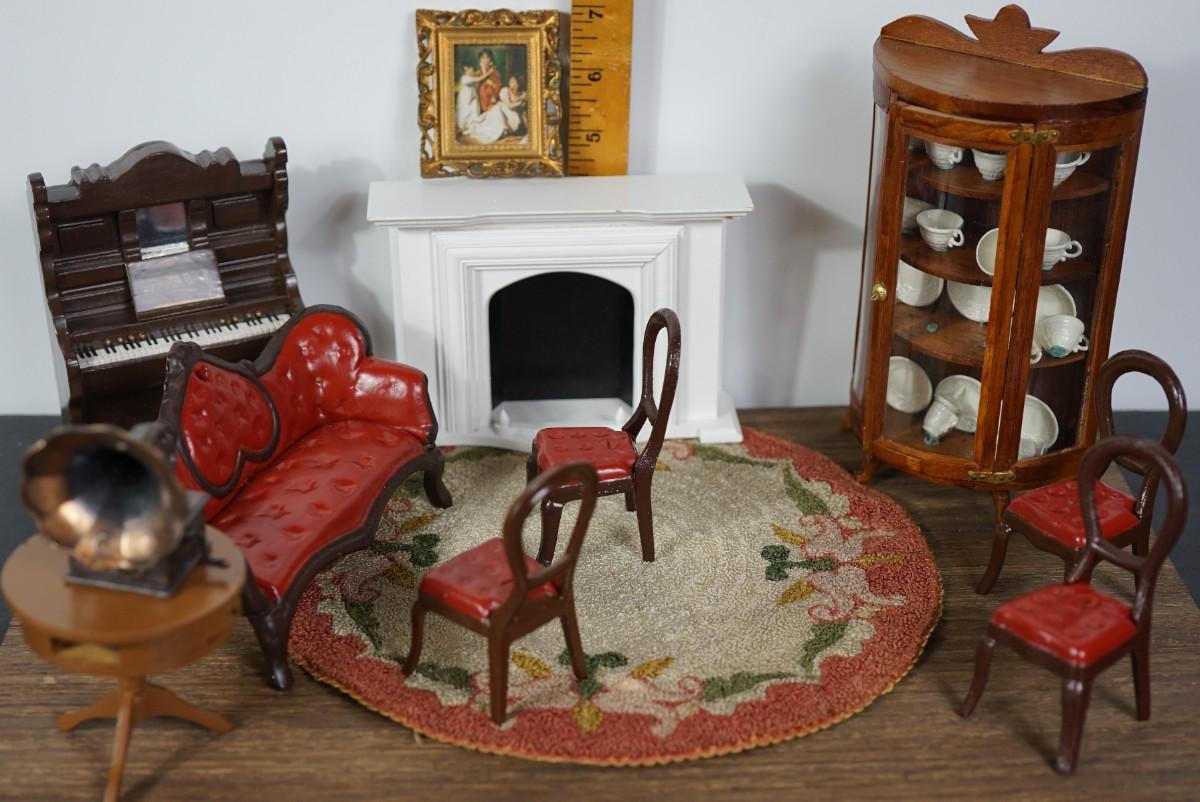 MINIATURE CLASSIC VICTORIAN STYLE LIVING ROOM W/CURVED GLASS OAK CHINA CABINET /FIREPLACE  PLUS