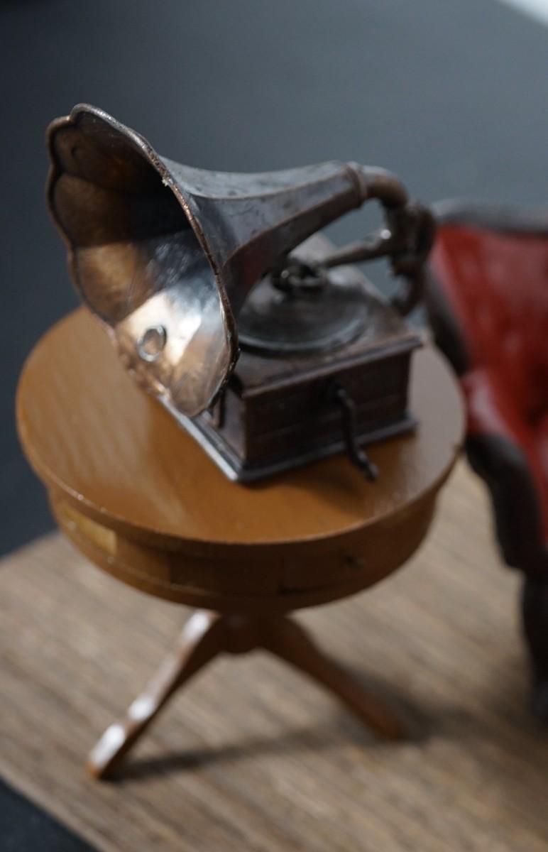 horn phonograph metal the crank moves ( actually a pencil sharpener) 2 1/2"