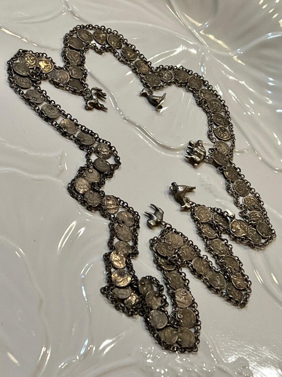 Miniature coin silver (800) necklace with 5 animal charms, vintage, 30”