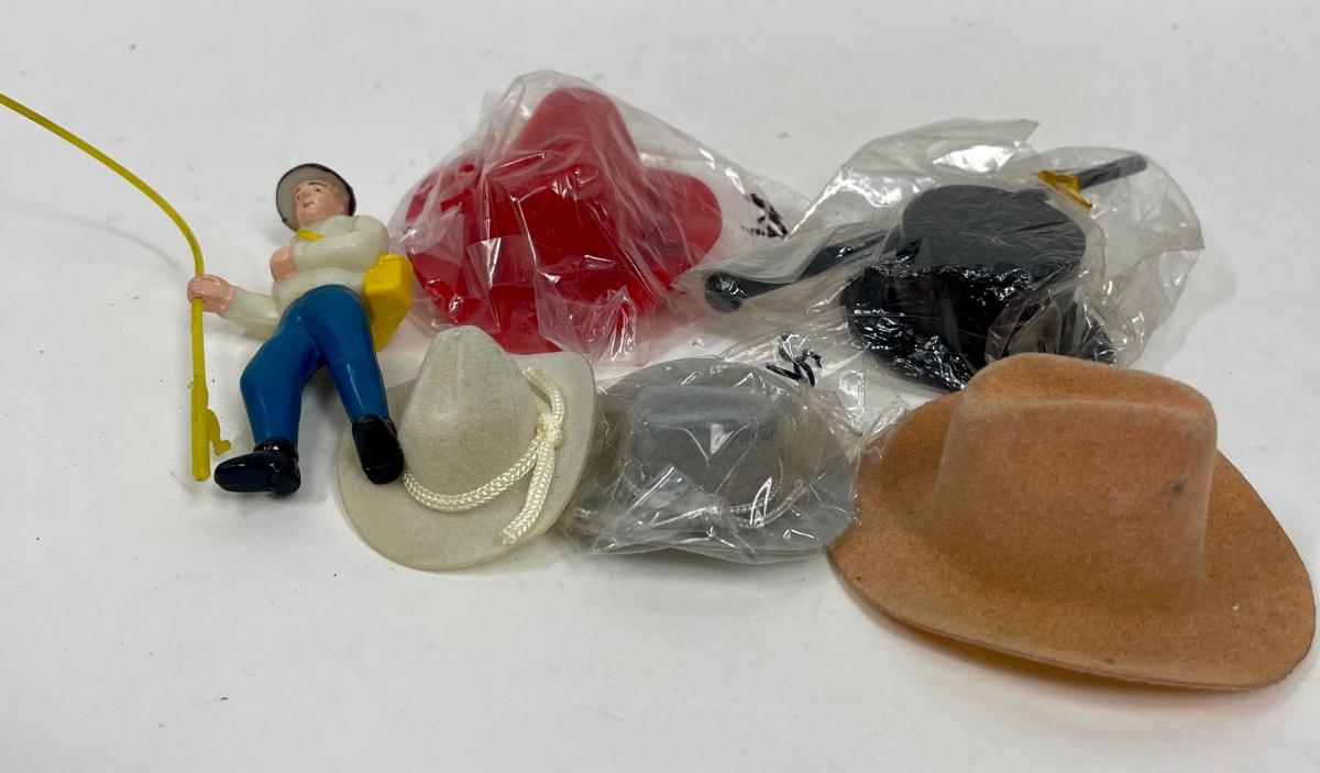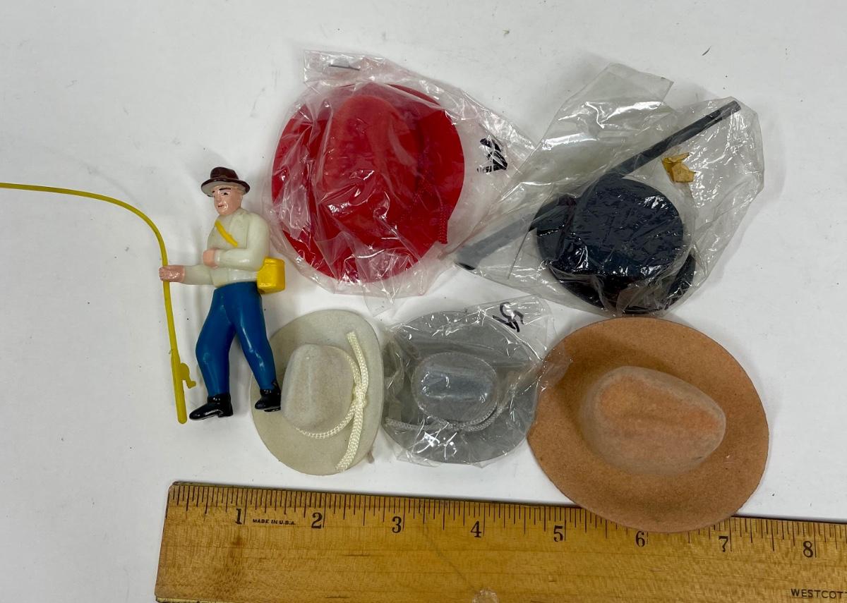 Miniature Cowboy Hats, a Top Hat with Cane, and a small plastic Fisherman Cake Topper figurine