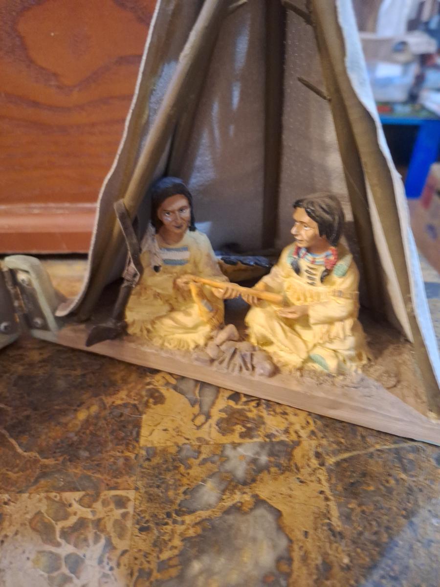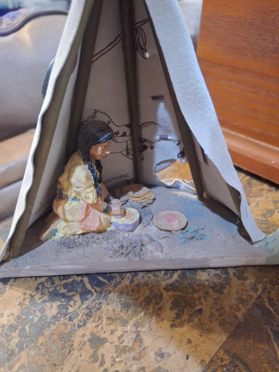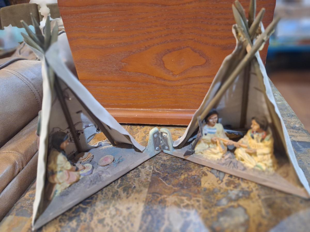 miniature decorative teepee collectible- opens to display people inside