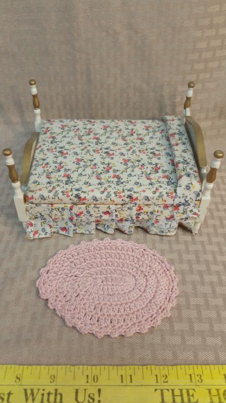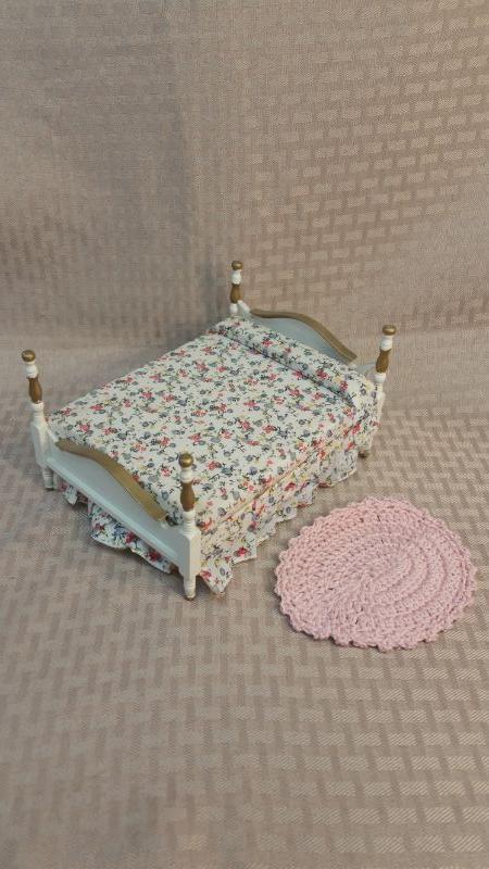 Antique white with gold trim wooden miniature bed with a floral bedspread & skirt.