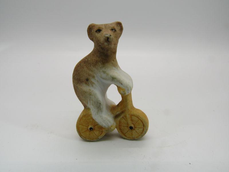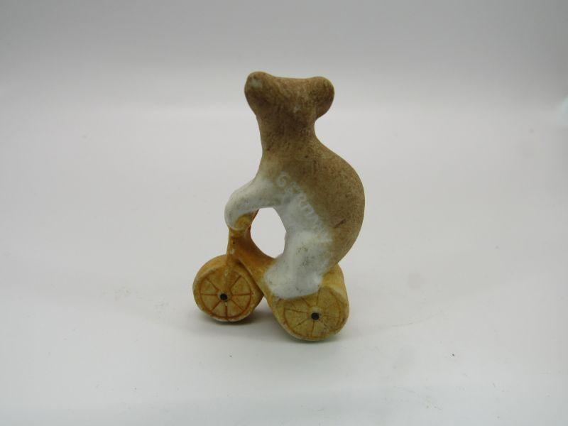 Miniature figurine of bear on bicycle. Stamped Germany on bottom. Good vintage condition. #020-499zz