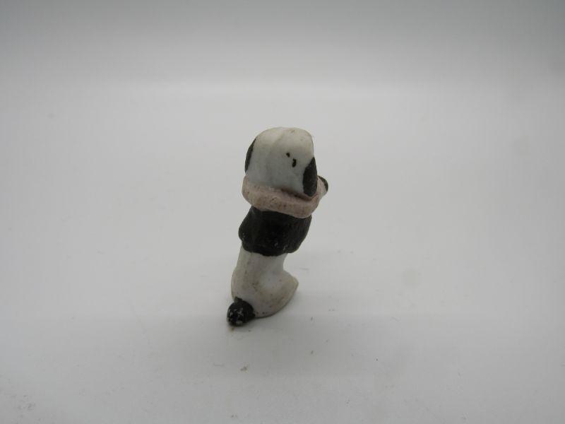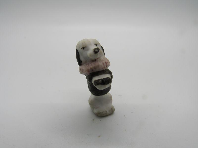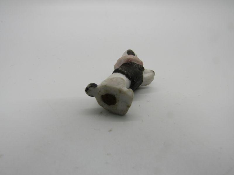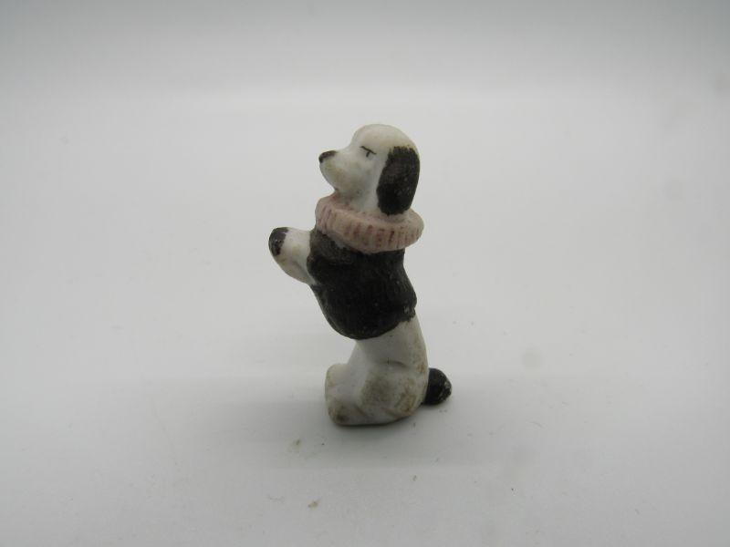 Miniature black and white circus dog with pink collar, sitting up begging miniature figurine. Good vintage condition.