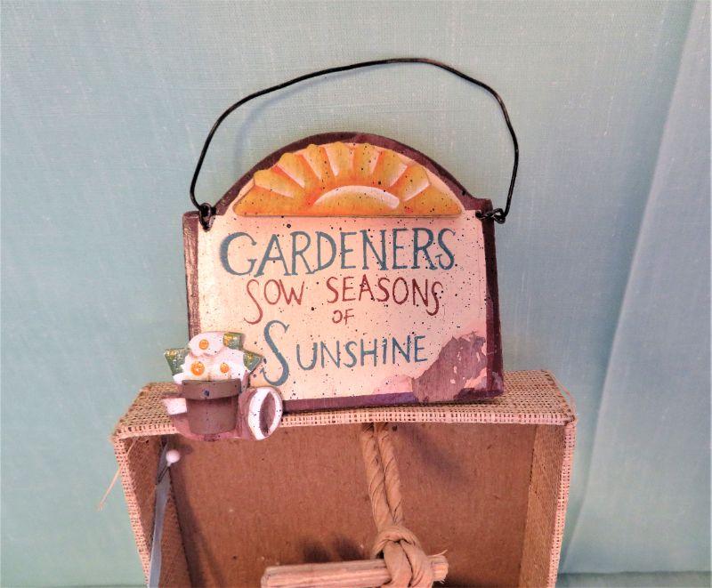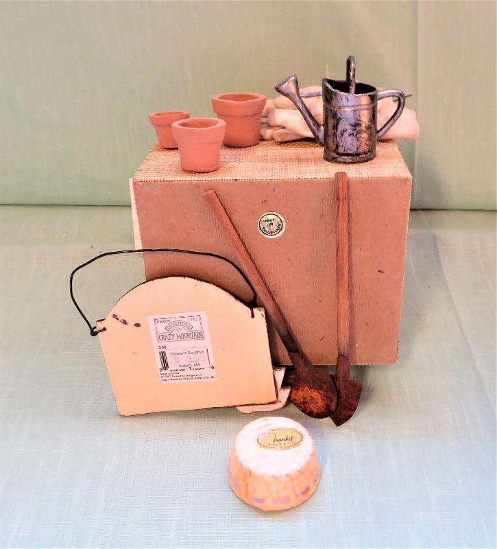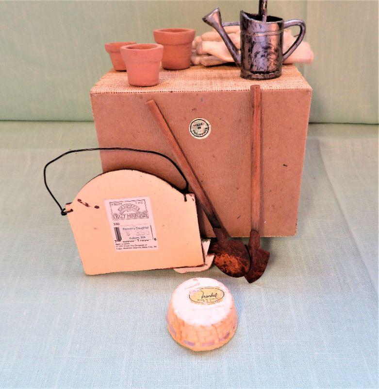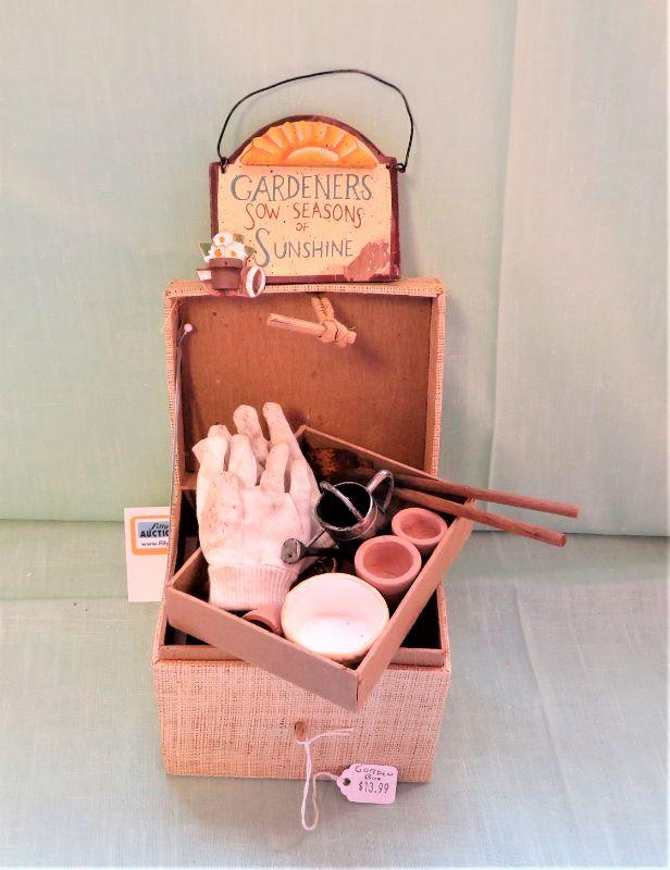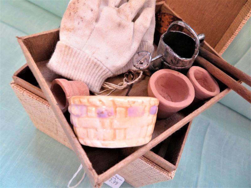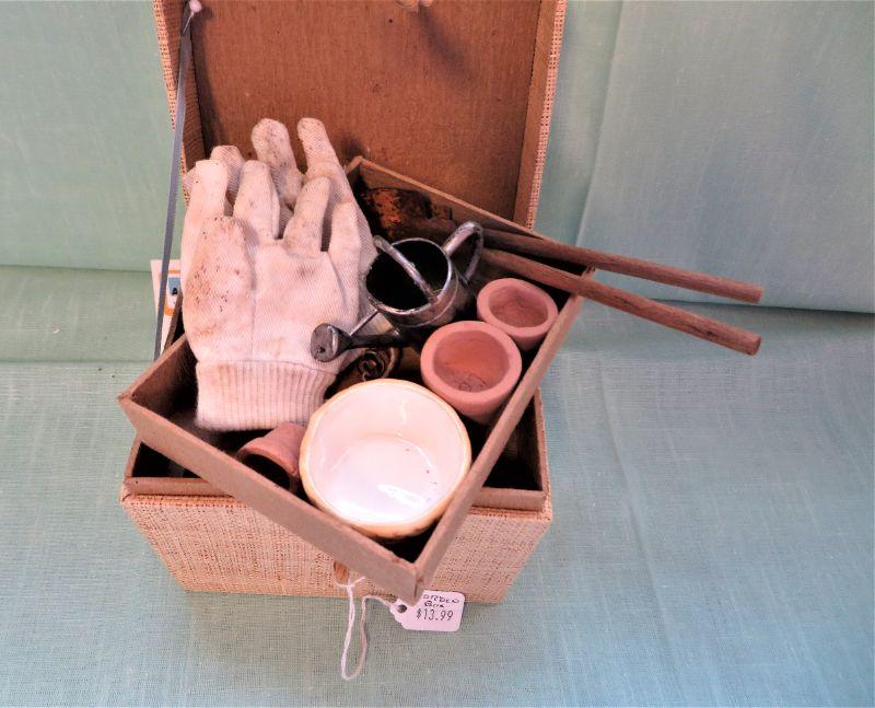 w/ Miniature Gloves, Tools, Hanging Sign, Pot made Taiwan, Watering Can, Storage Bin. 5"x4" (1 lb shipping)