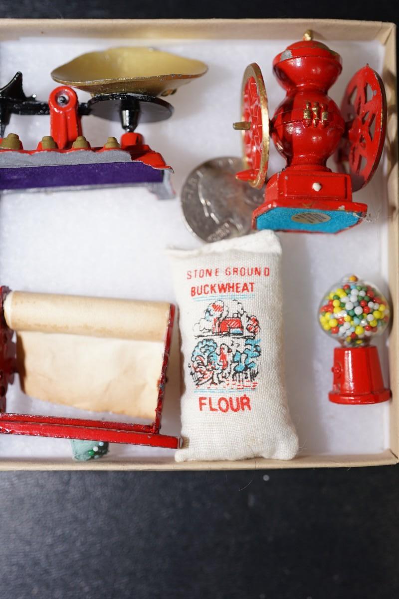MINIATURE GENERAL STORE ITEMS/METAL COFFEE GRINDER, SCALE, PAPER DISPENSER MORE
