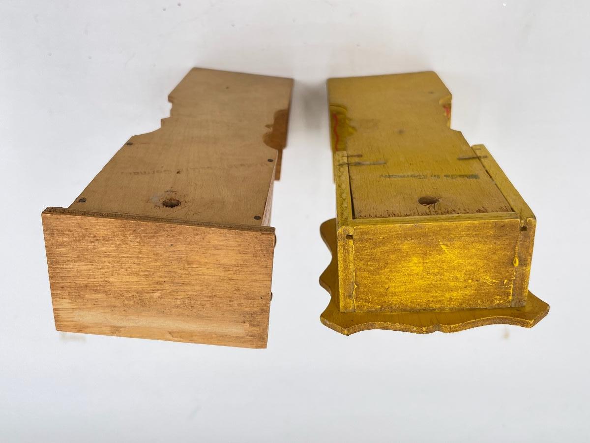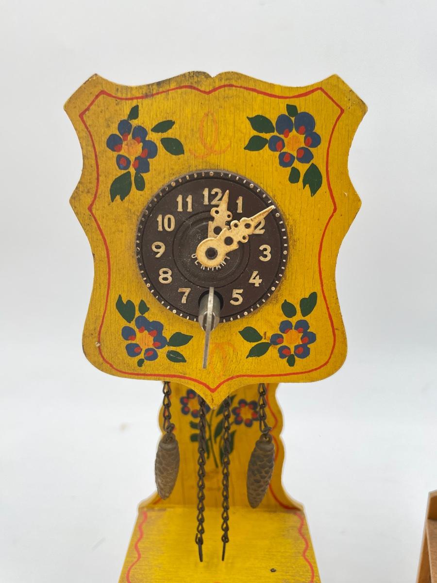 These unique little clocks need some TLC but they have so much potential! I One clock is missing the hands. **NOT SURE IF ALL PARTS ARE PRESENT** Approx 8” tall.