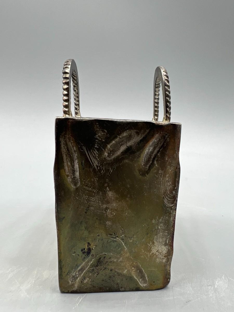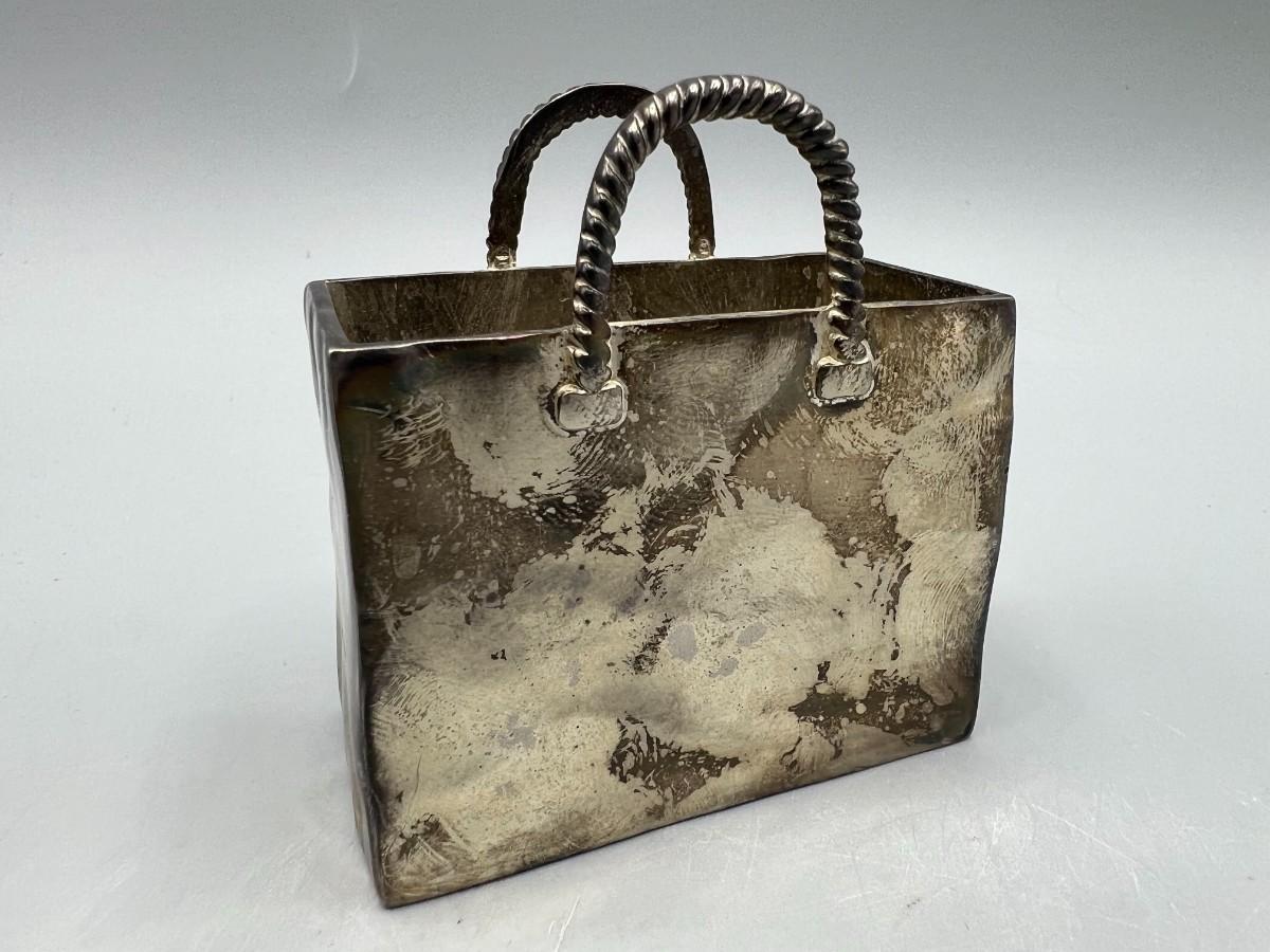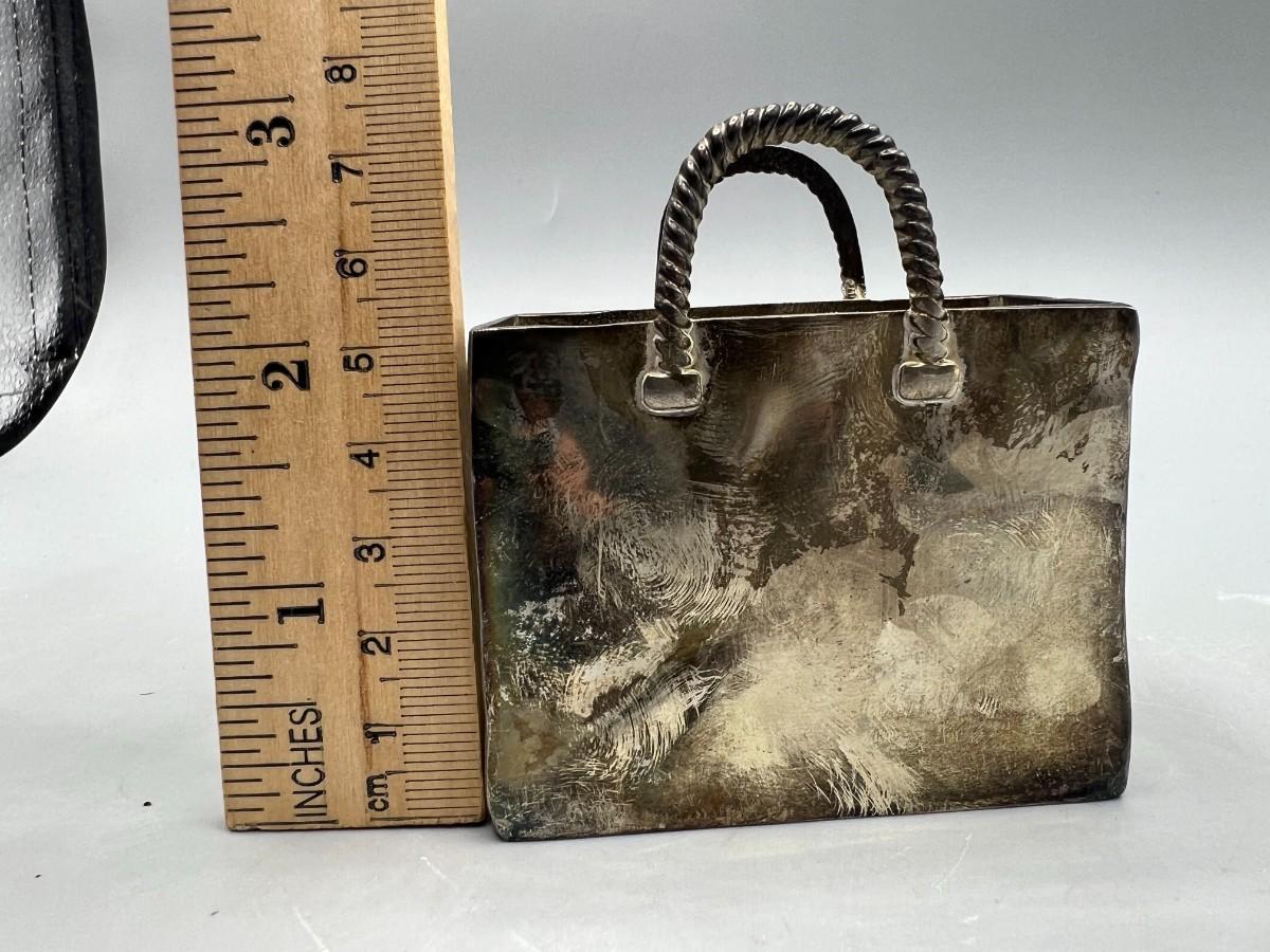 Miniature Godinger Silver Plate Shopping Bag Lipstick Holder. Divided to hold to lipsticks. Needs to be cleaned.