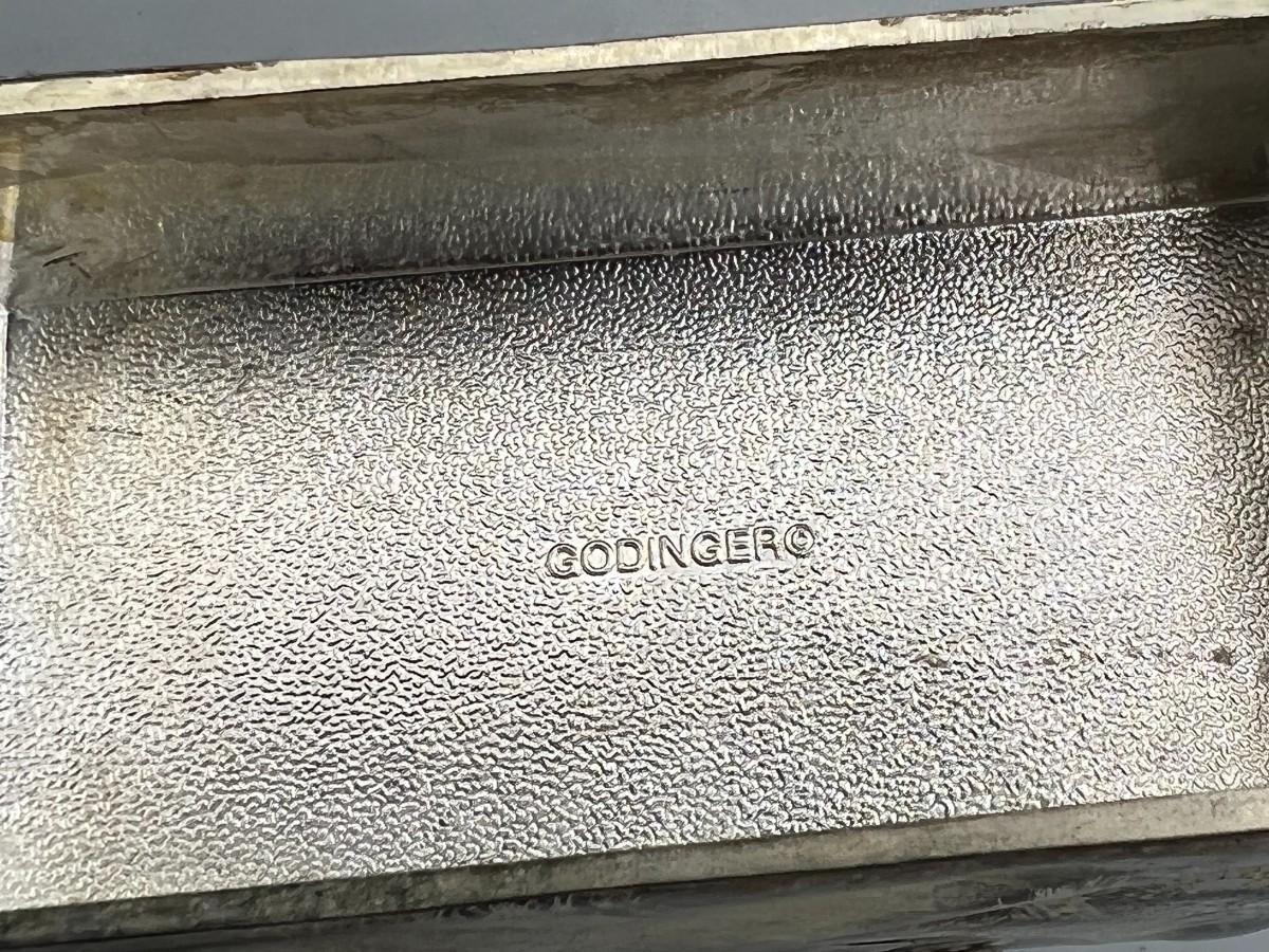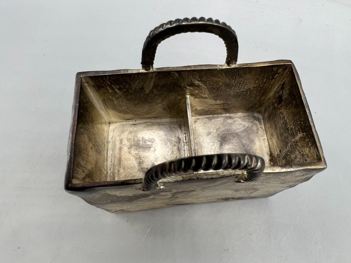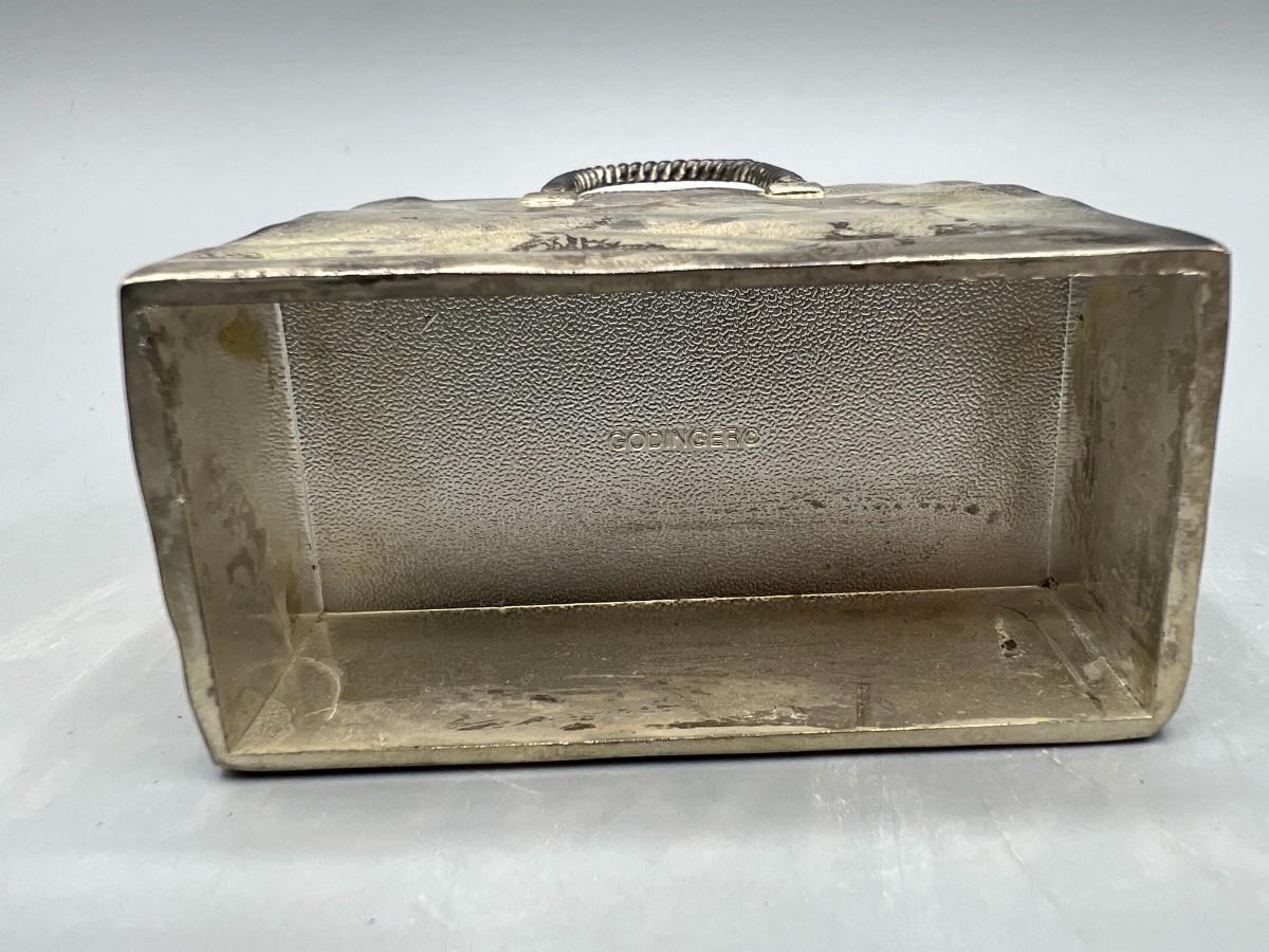 Miniature Godinger Silver Plate Shopping Bag Lipstick Holder. Divided to hold to lipsticks. Needs to be cleaned.