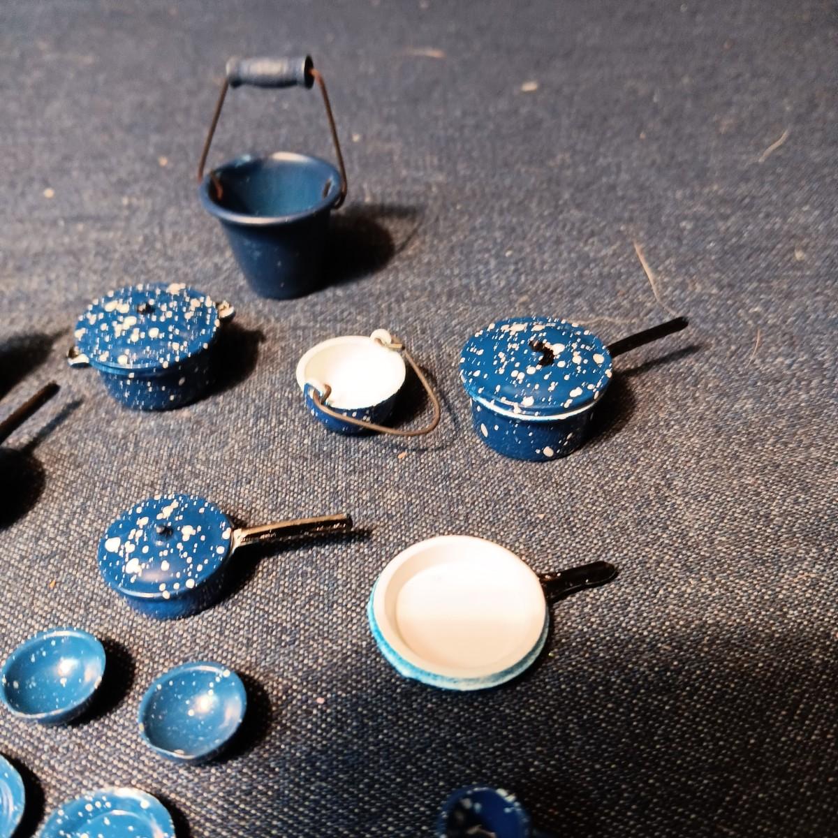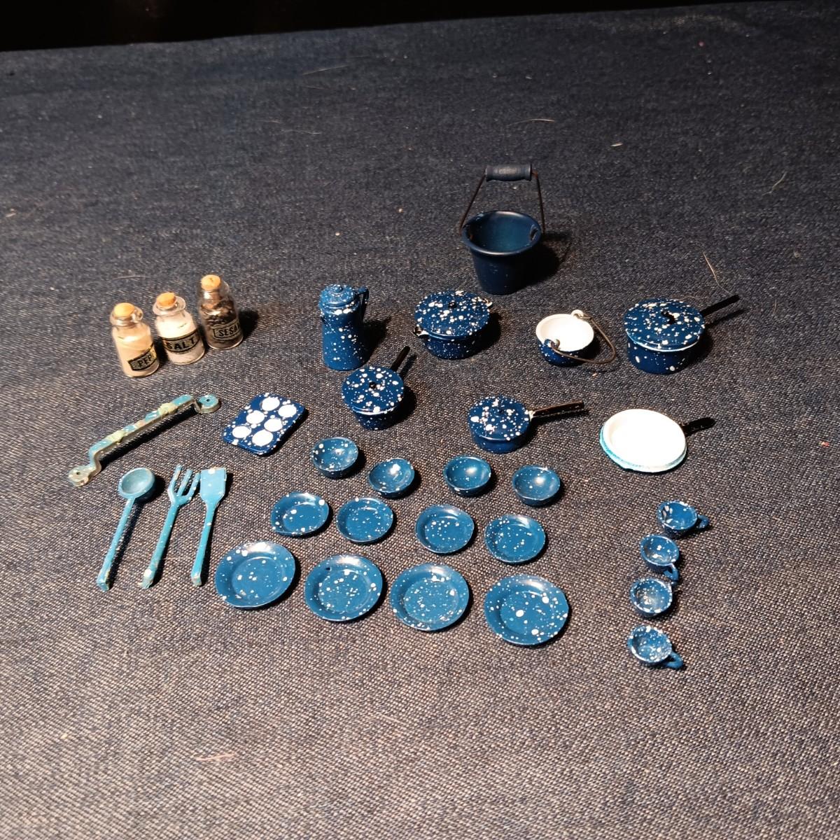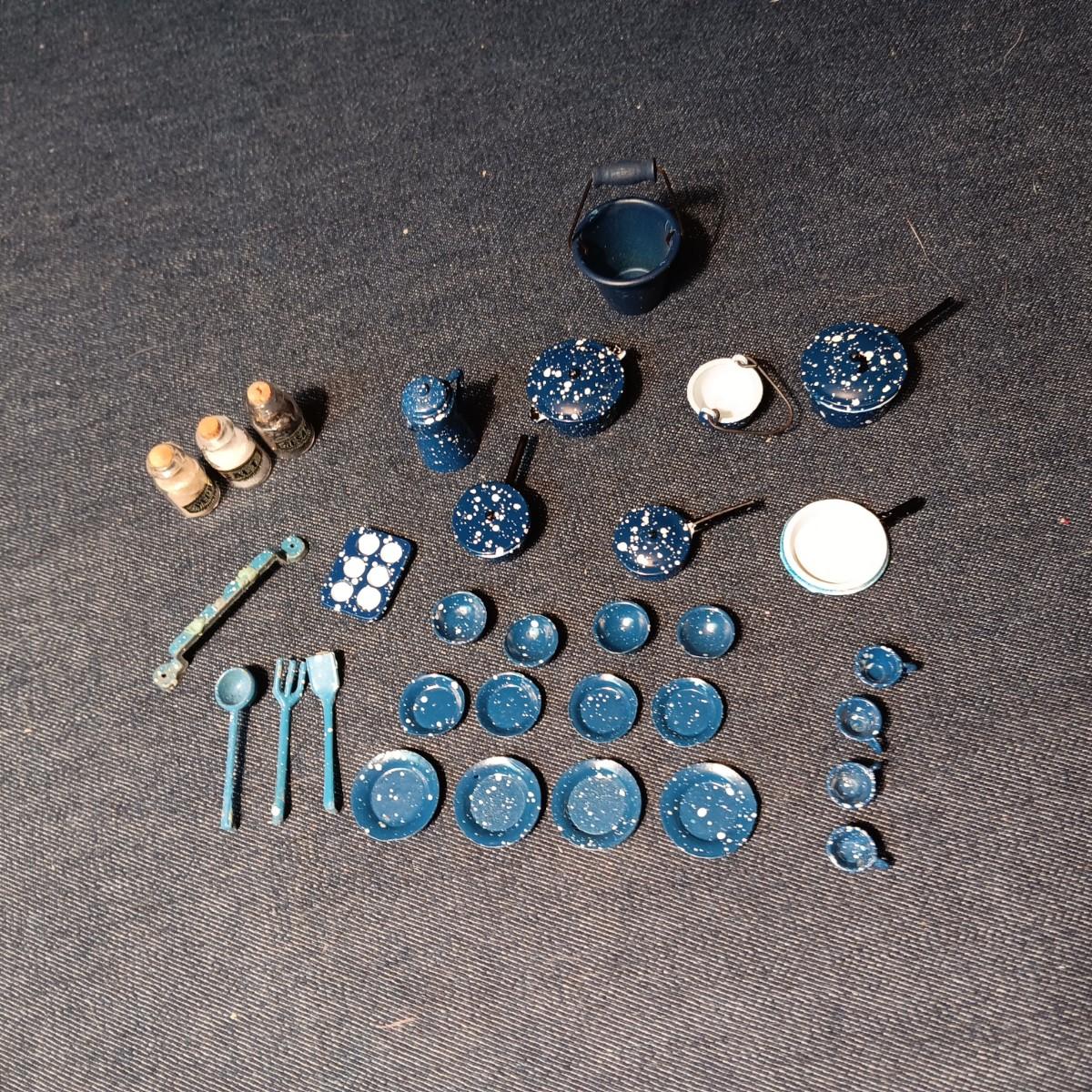 MINIATURE GRANITE WARE DISHES, POTS & PANS PLUS MORE