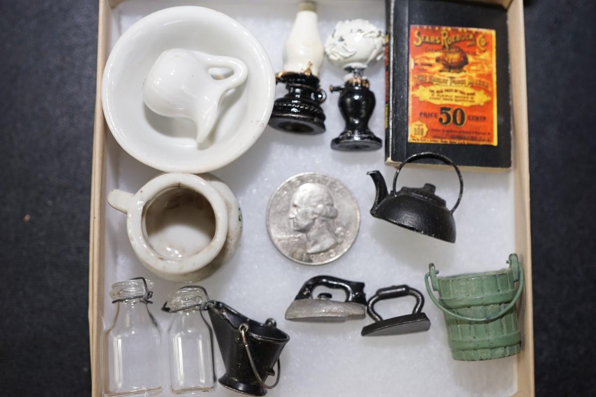 MINIATURE GROUPING OF ANTIQUE STYLE DECORATIVE FLAT IRONS, PITCHER & BOWL AND METAL TINY KEROSENE LAMPS