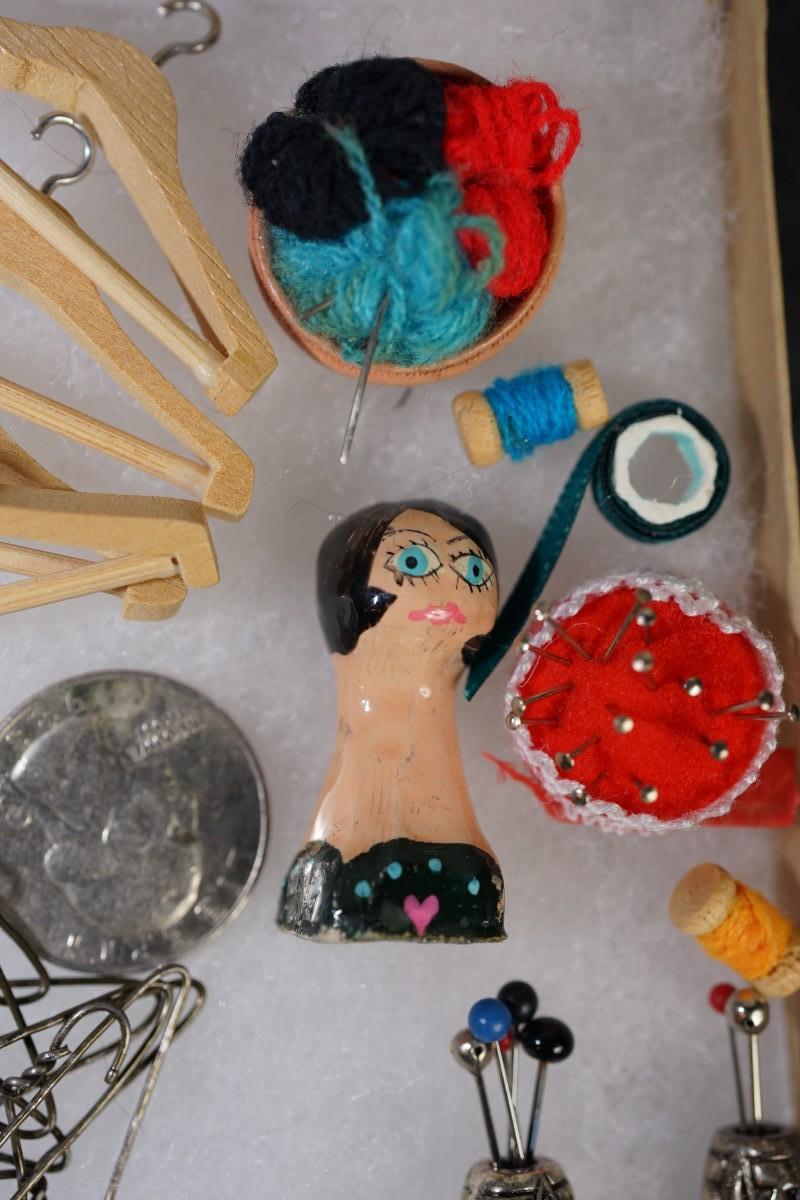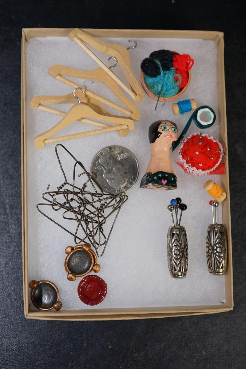 MINIATURE GROUPING OF TINY HANGERS WOODEN & WIRE/WIG HOLDER/HAIR PINS AND HOLDER AND MORE