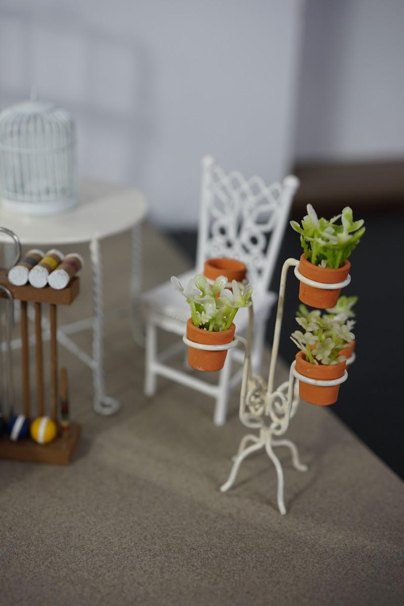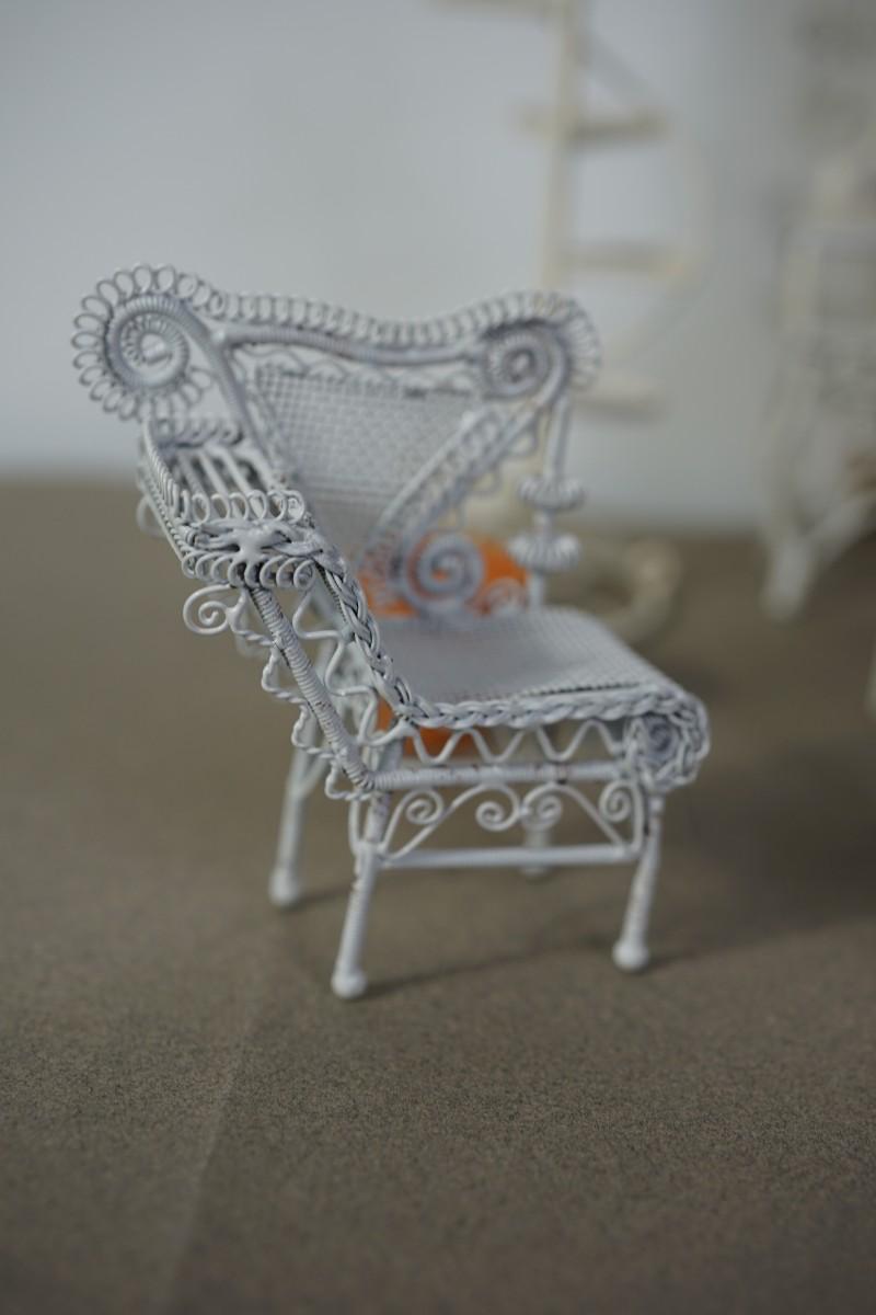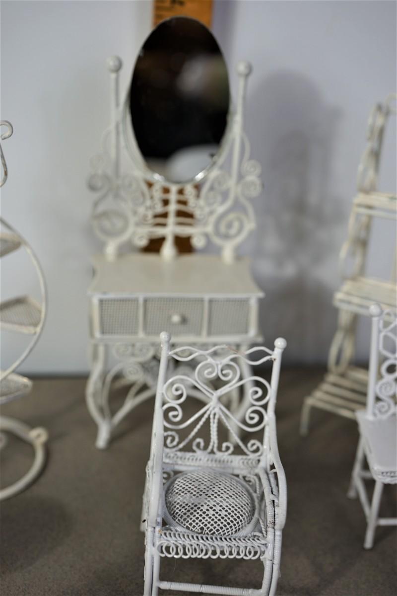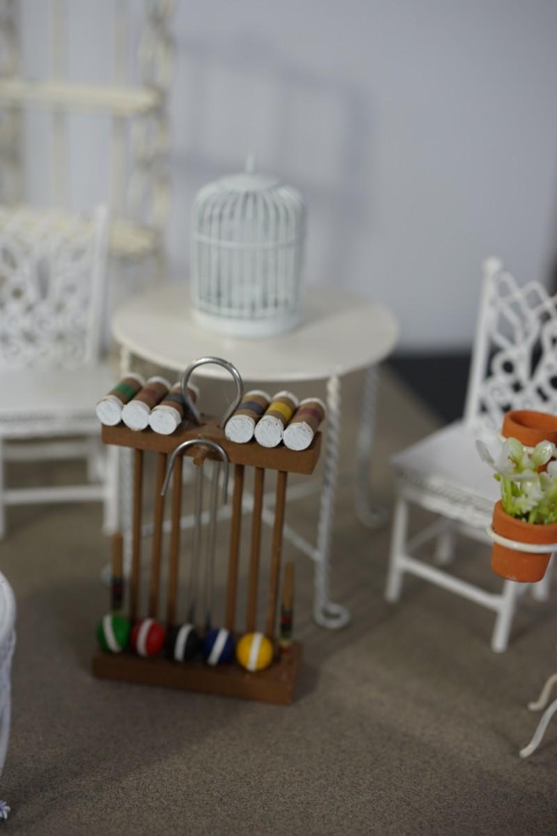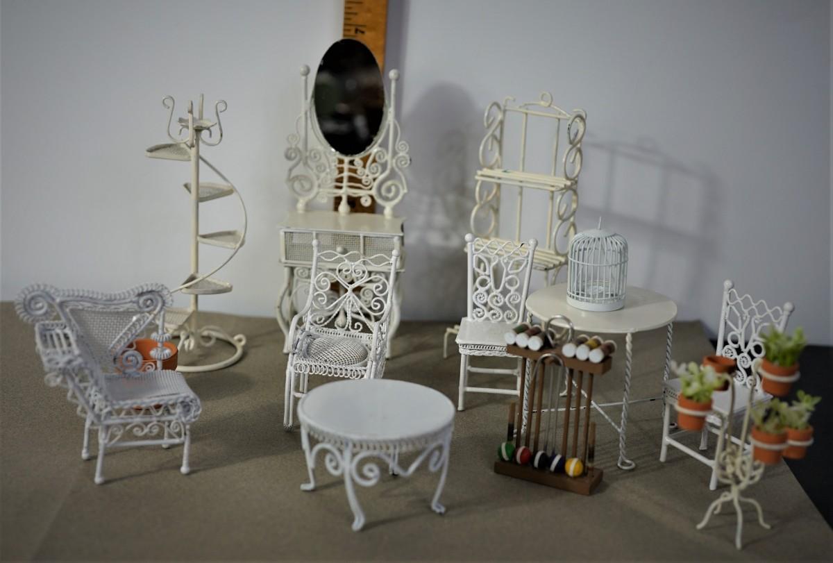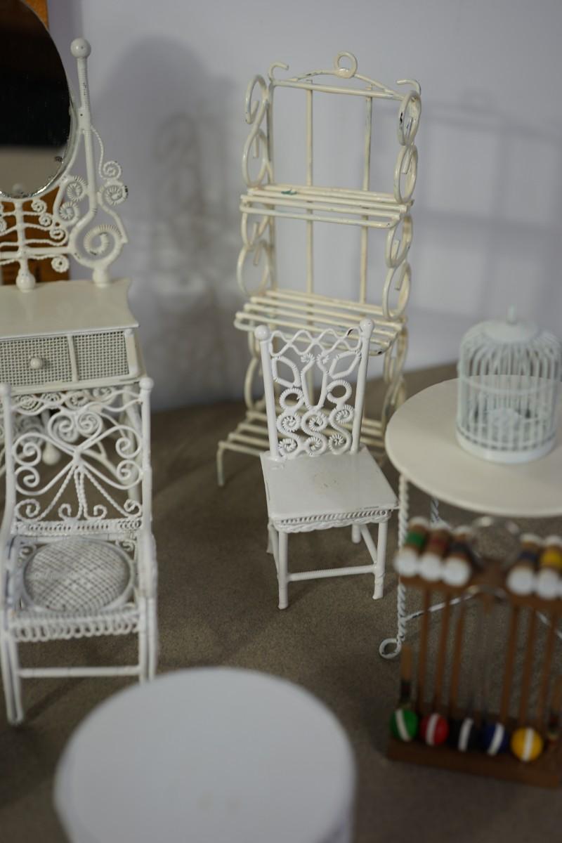 MINIATURE GROUPING OF TWELVE GARDEN FURNITURE AND ACCESSORIES TO INCLUDE MINI CROCHETE SET