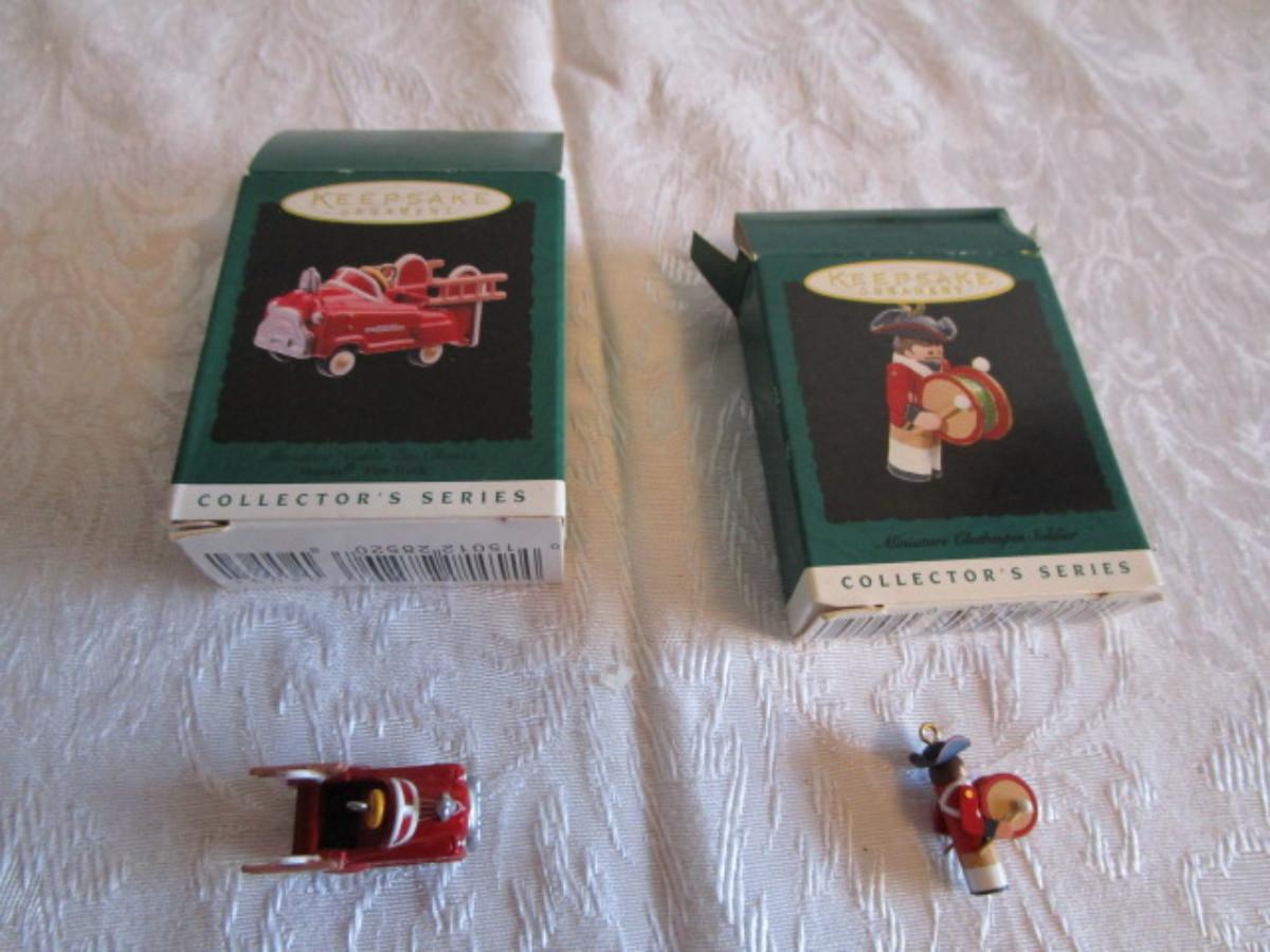 New in boxes, one is a clothespin soldier 1" tall, one is a Murray firetruck kiddie car 1-1/4" long, see pictures