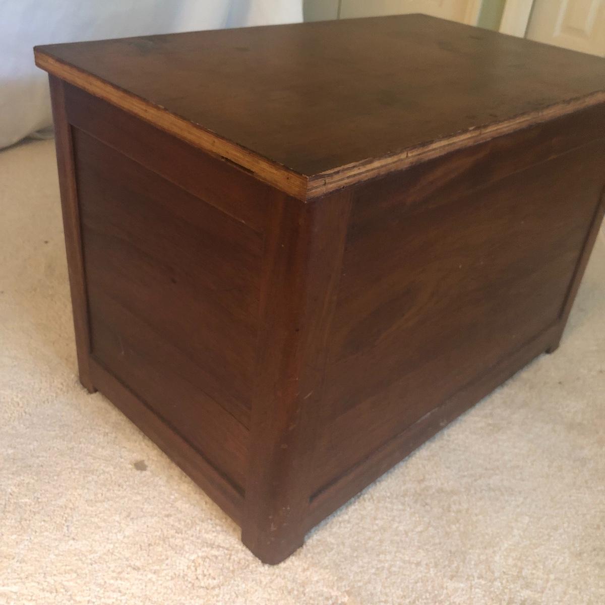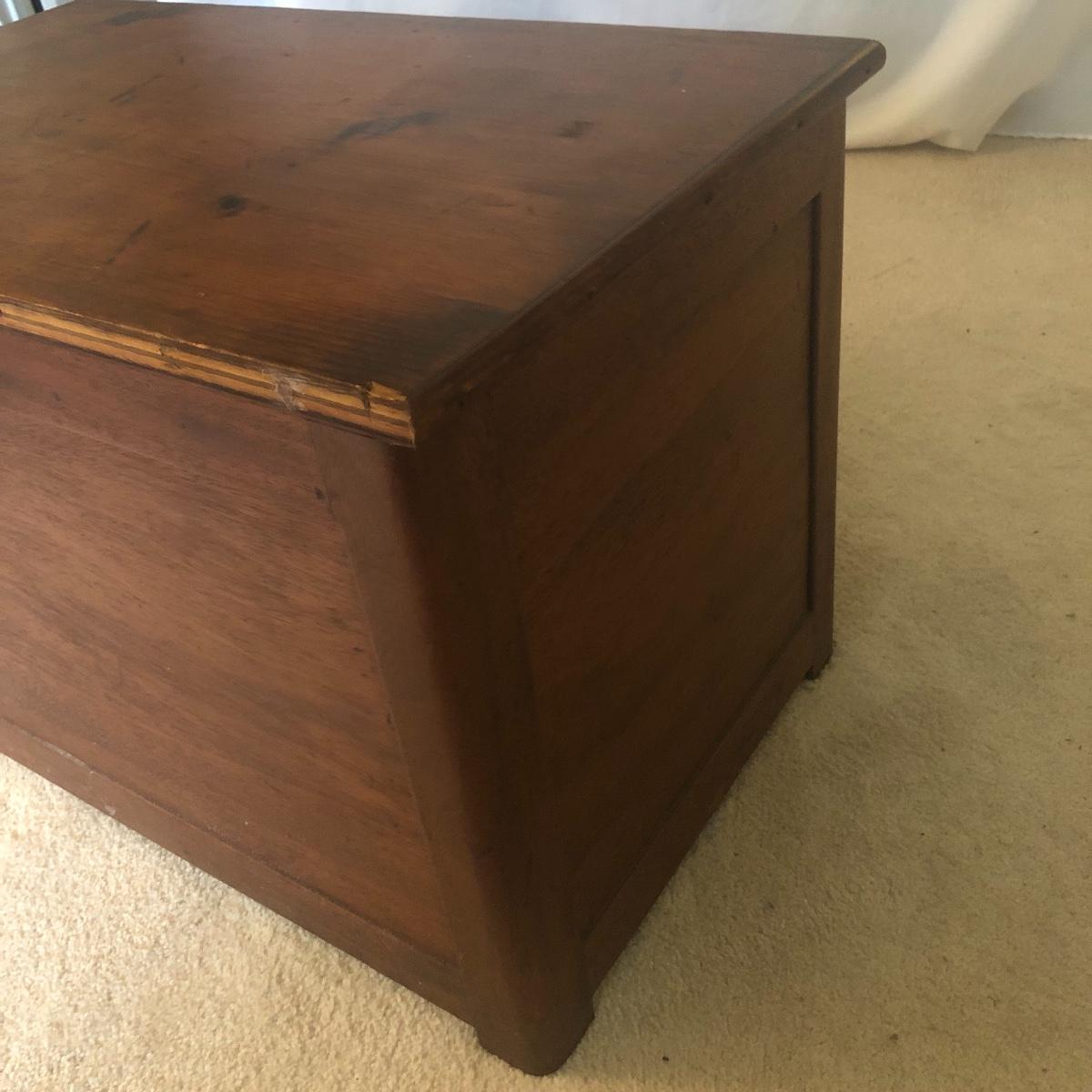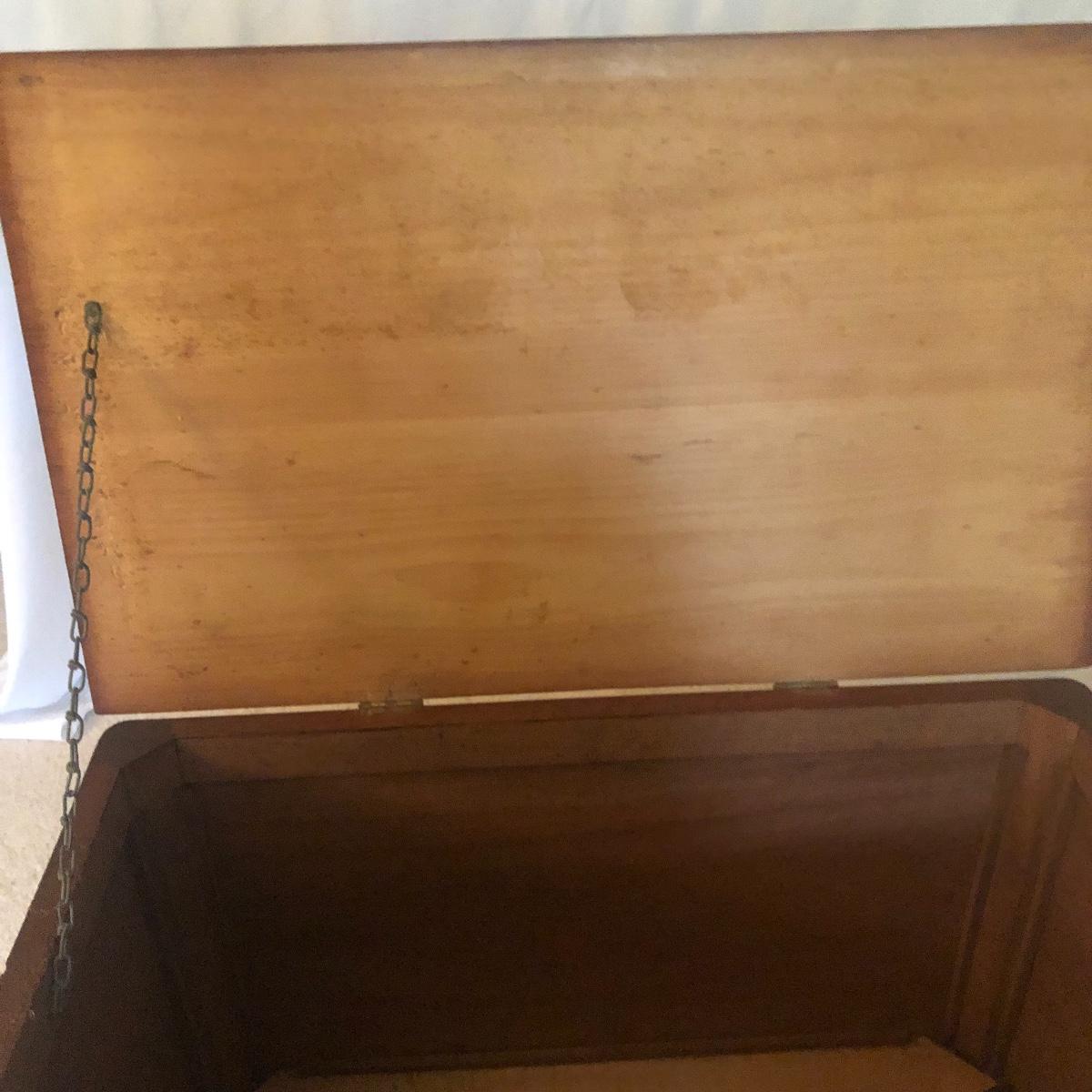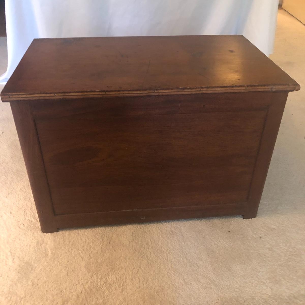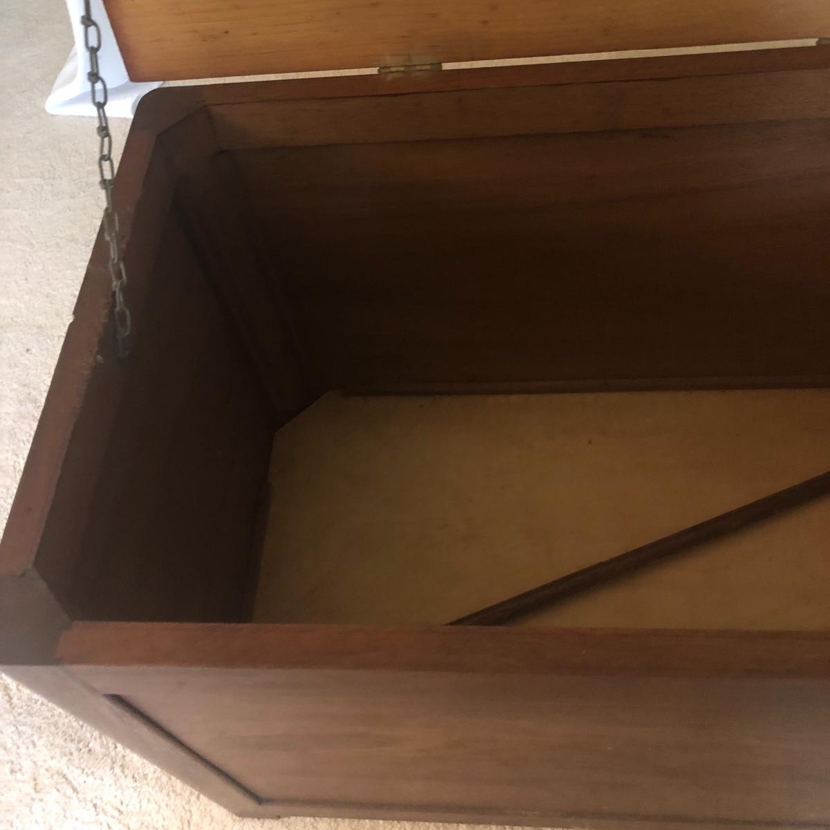 This all wood chest measures 24.5” x 14.5” x 16”. The two outside trim pieces are off of the chest and are inside for a quick repair. Local pick up only.