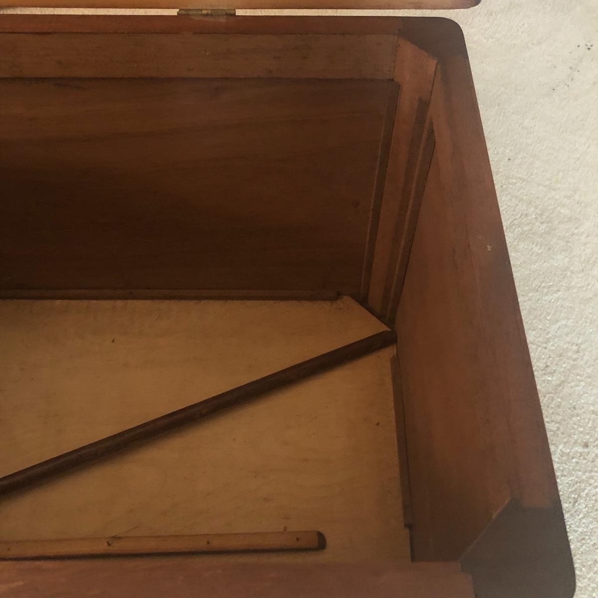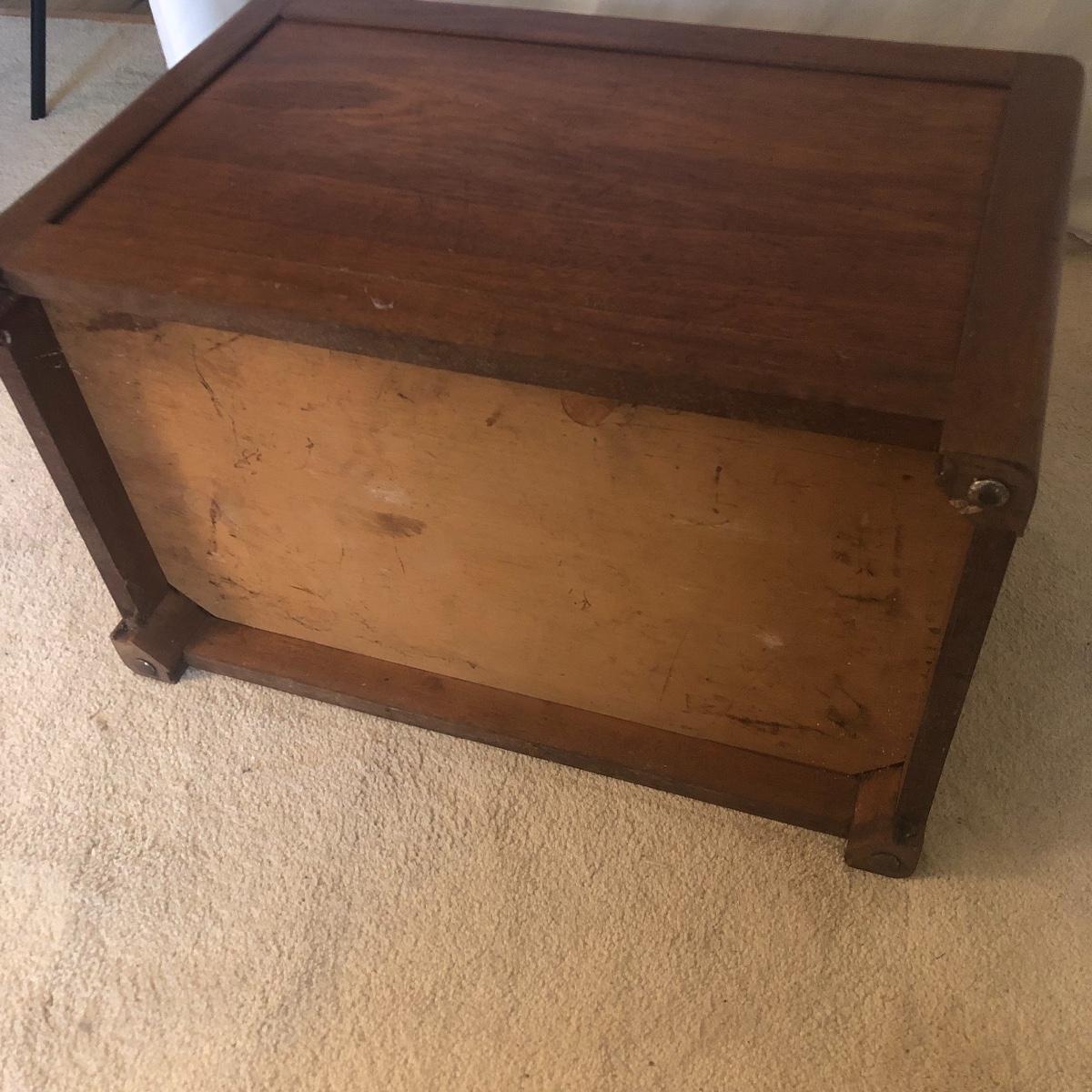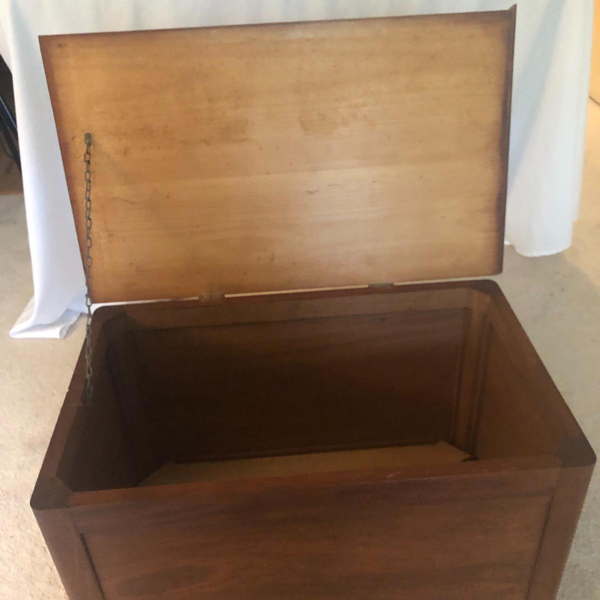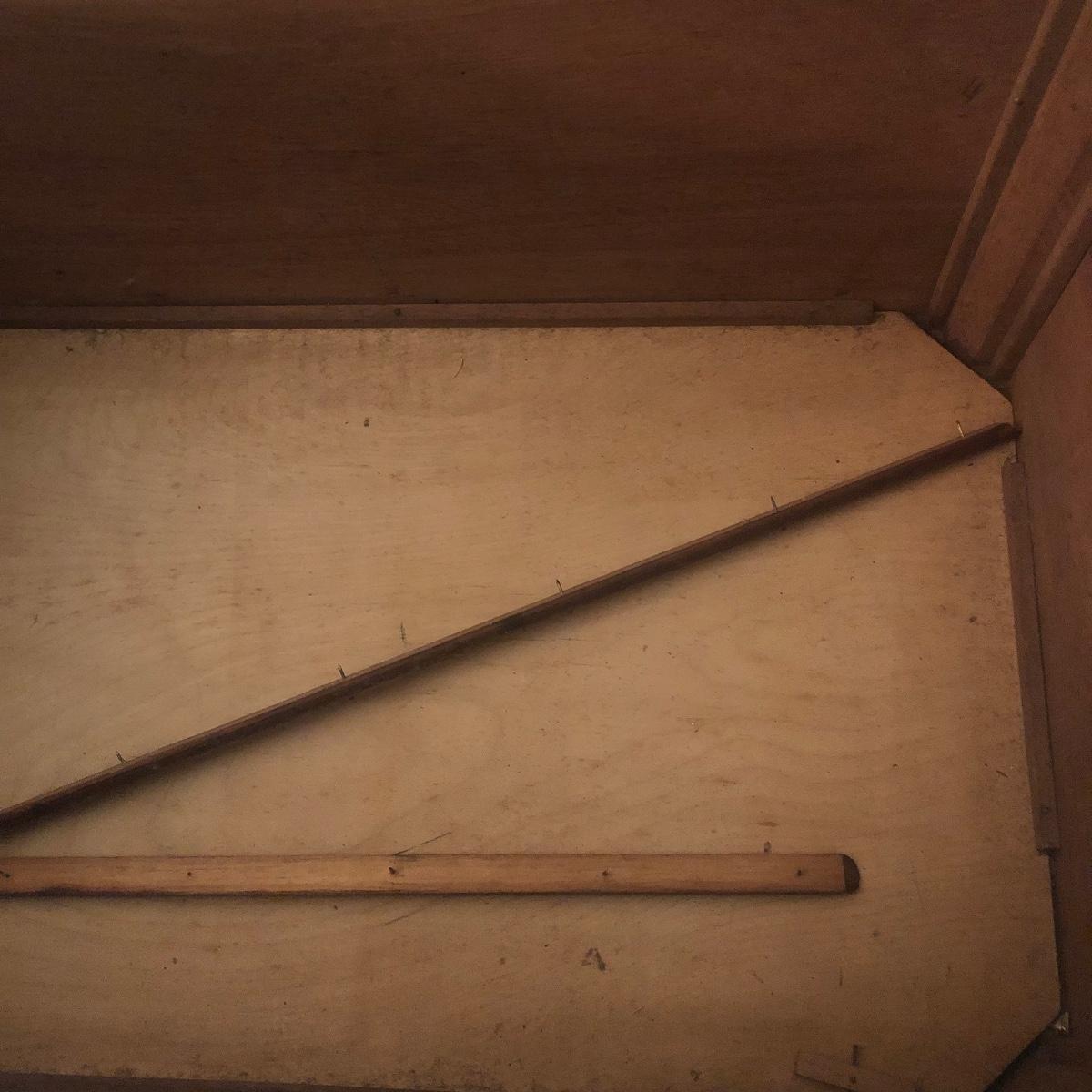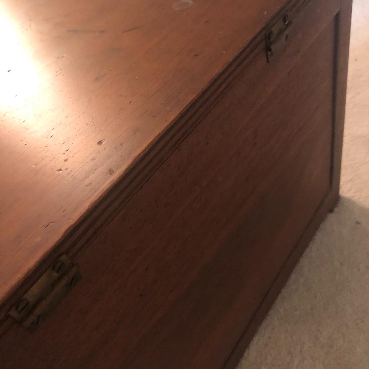 This all wood chest measures 24.5” x 14.5” x 16”. The two outside trim pieces are off of the chest and are inside for a quick repair. Local pick up only.